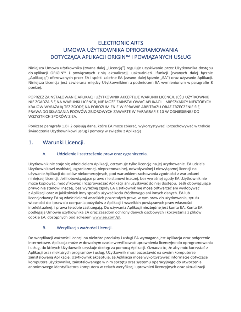 ELECTRONIC ARTS UMOWA UŻYTKOWNIKA OPROGRAMOWANIA DOTYCZĄCA APLIKACJI ORIGIN™ I POWIĄZANYCH USŁUG Niniejsza Umowa użytkownika (zwana dalej „Licencją”) reguluje uzyskiwanie przez Użytkownika dostępu do aplikacji ORIGIN™ i powiązanych z nią aktualizacji, uaktualnień i funkcji (zwanych dalej łącznie „Aplikacją”) oferowanych przez EA i spółki zależne EA (zwane dalej łącznie „EA”) oraz używanie Aplikacji. Niniejsza Licencja jest zawierana między Użytkownikiem a podmiotem EA wymienionym w paragrafie 8 poniżej. POPRZEZ ZAINSTALOWANIE APLIKACJI UŻYTKOWNIK AKCEPTUJE WARUNKI LICENCJI. JEŚLI UŻYTKOWNIK NIE ZGADZA SIĘ NA WARUNKI LICENCJI, NIE MOŻE ZAINSTALOWAĆ APLIKACJI. MIESZKAŃCY NIEKTÓRYCH KRAJÓW WYRAŻAJĄ TEŻ ZGODĘ NA POROZUMIENIE W SPRAWIE ARBITRAŻU ORAZ ZRZECZENIE SIĘ PRAWA DO SKŁADANIA POZWÓW ZBIOROWYCH ZAWARTE W PARAGRAFIE 10 W ODNIESIENIU DO WSZYSTKICH SPORÓW Z EA. Poniższe paragrafy 1.B i 2 opisują dane, które EA może zbierać, wykorzystywać i przechowywać w trakcie świadczenia Użytkownikowi usług i pomocy w związku z Aplikacją. 1. Warunki Licencji. A. Udzielenie i zastrzeżenie praw oraz ograniczenia. Użytkownik nie staje się właścicielem Aplikacji, otrzymuje tylko licencję na jej użytkowanie. EA udziela Użytkownikowi osobistej, ograniczonej, nieprzenoszalnej, odwoływalnej i niewyłącznej licencji na używanie Aplikacji do celów niekomercyjnych, pod warunkiem zachowania zgodności z warunkami niniejszej Licencji. Jeśli obowiązujące prawo nie stanowi inaczej, bez wyraźnej zgody EA Użytkownik nie może kopiować, modyfikować i rozprowadzać Aplikacji ani uzyskiwać do niej dostępu. Jeśli obowiązujące prawo nie stanowi inaczej, bez wyraźnej zgody EA Użytkownik nie może odtwarzać ani wydobywać z Aplikacji oraz w jakikolwiek inny sposób używać kodu źródłowego ani innych danych. EA lub licencjodawcy EA są właścicielami wszelkich pozostałych praw, w tym praw do użytkowania, tytułu własności do i praw do czerpania pożytków z Aplikacji i wszelkich powiązanych praw własności intelektualnej, i prawa te sobie zastrzegają. Do używania Aplikacji niezbędne jest konto EA. Konta EA podlegają Umowie użytkownika EA oraz Zasadom ochrony danych osobowych i korzystania z plików cookie EA, dostępnych pod adresem www.ea.com/pl. B. Weryfikacja ważności Licencji. Do weryfikacji ważności licencji na niektóre produkty i usługi EA wymagana jest Aplikacja oraz połączenie internetowe. Aplikacja może w dowolnym czasie weryfikować uprawnienia licencyjne do oprogramowania i usług, do których Użytkownik uzyskuje dostęp za pomocą Aplikacji. Oznacza to, że aby móc korzystać z Aplikacji oraz niektórych programów i usług, Użytkownik musi pozostawić na swoim komputerze zainstalowaną Aplikację. Użytkownik akceptuje, że Aplikacja może wykorzystywać informacje dotyczące komputera użytkownika, zainstalowanego w nim sprzętu oraz systemu operacyjnego do utworzenia anonimowego identyfikatora komputera w celach weryfikacji uprawnień licencyjnych oraz aktualizacji Aplikacji. Informacje zbierane w tym celu nie będą przechowywane w żadnej postaci umożliwiającej ich odczytanie. C. Aktualizacja Aplikacji. Aplikacja może pobierać i instalować aktualizacje, uaktualnienia oraz dodatkowe funkcje, które EA uzna za racjonalne, korzystne dla Użytkownika i/lub uzasadnione potrzebą. Użytkownik akceptuje, że po udostępnieniu aktualizacji bądź uaktualnienia Aplikacji i/lub wprowadzeniu do niej nowych funkcji EA nie jest zobowiązane do obsługiwania wcześniejszych wersji Aplikacji. Postanowienia i warunki niniejszej Licencji mają zastosowanie do wszystkich aktualizacji, uaktualnień i/lub dodatkowych funkcji, które nie są rozprowadzane na podstawie odrębnej licencji lub umowy. D. Instalacja i odinstalowanie. Użytkownik może odinstalować Aplikację ze swojego komputera PC poprzez wybranie plików „Origin” (zwanych dalej „Plikami Aplikacji”) na stronie „Programy i funkcje” w Panelu sterowania. Wszelkie puste foldery na pliki tymczasowe, które pozostaną na komputerze po odinstalowaniu Plików Aplikacji, można usunąć ręcznie. W przypadku komputerów Mac Użytkownik może odinstalować Aplikację poprzez przeciągnięcie Aplikacji Alfa na komputery Mac do foldera Kosz, a następnie opróżnienie tego foldera. Po odinstalowaniu Aplikacji pozostałe pliki pomocnicze można usunąć ręcznie z folderów / Support/Origin. Można je wyszukać za pomocą Findera poprzez naciśnięcie kombinacji Command+Shift+G w celu wyświetlenia okna dialogowego „Przejdź do folderu” i wpisanie ciągu znaków /Biblioteki. 2. Zgoda na wykorzystanie danych. Gdy Użytkownik używa Aplikacji, zezwala EA na gromadzenie i przechowywanie danych dotyczących komputera lub urządzenia Użytkownika, w tym informacji dotyczących komputera (lub urządzenia) Użytkownika oraz systemu operacyjnego (w tym adresu IP i numeru identyfikacyjnego urządzenia), a także informacji o używaniu oprogramowania i usług EA, danych dotyczących rozgrywki i statystyk dotyczących używania, informacji o interakcji z systemem oraz informacji o urządzeniach peryferyjnych. W przypadku używania Aplikacji w trybie offline dane te będą przechowywane na urządzeniu Użytkownika i przesyłane do EA po nawiązaniu przez urządzenie połączenia z Internetem. EA wykorzystuje te informacje do doskonalenia swoich usług i oprogramowania, świadczenia usług na rzecz Użytkownika oraz do celów komunikacji z Użytkownikiem (w tym w celach marketingowych), udostępniania aktualizacji oprogramowania, dynamicznego dostarczania treści, świadczenia pomocy technicznej dotyczącej oprogramowania, a także do rozwiązywania problemów związanych z błędami i poprawiania wygody i zadowolenia Użytkownika w inny sposób. Niektóre preferencje dotyczące gromadzenia danych można zmienić w Aplikacji w zakładce Ustawienia. D