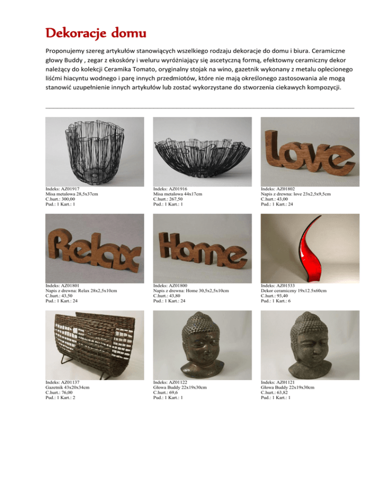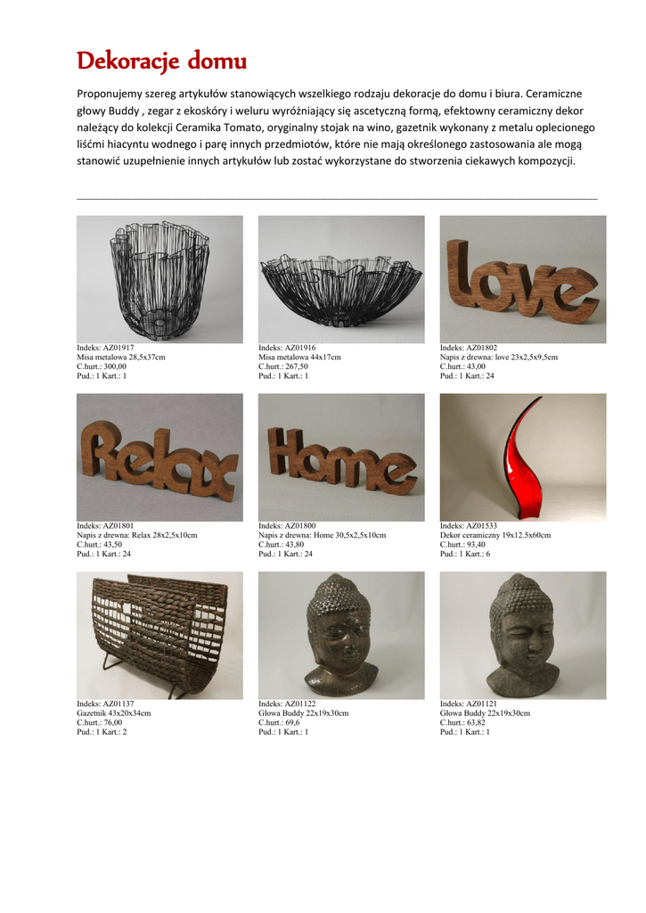 Dekoracje domu Proponujemy szereg artykułów stanowiących wszelkiego rodzaju dekoracje do domu i biura. Ceramiczne głowy Buddy , zegar z ekoskóry i weluru wyróżniający się ascetyczną formą, efektowny ceramiczny dekor należący do kolekcji Ceramika Tomato, oryginalny stojak na wino, gazetnik wykonany z metalu oplecionego liśćmi hiacyntu wodnego i parę innych przedmiotów, które nie mają określonego zastosowania ale mogą stanowić uzupełnienie innych artykułów lub zostać wykorzystane do stworzenia ciekawych kompozycji. ________________________________________________________________________________ Indeks: AZ01917 Misa metalowa 28,5x37cm C.hurt.: 300,00 Pud.: 1 Kart.: 1 Indeks: AZ01916 Misa metalowa 44x17cm C.hurt.: 267,50 Pud.: 1 Kart.: 1 Indeks: AZ01802 Napis z drewna: love 23x2,5x9,5cm C.hurt.: 43,00 Pud.: 1 Kart.: 24 Indeks: AZ01801 Napis z drewna: Relax 28x2,5x10cm C.hurt.: 43,50 Pud.: 1 Kart.: 24 Indeks: AZ01800 Napis z drewna: Home 30,5x2,5x10cm C.hurt.: 43,80 Pud.: 1 Kart.: 24 Indeks: AZ01533 Dekor ceramiczny 19x12.5x60cm C.hurt.: 93,40 Pud.: 1 Kart.: 6 Indeks: AZ01137 Gazetnik 43x20x34cm C.hurt.: 76,00 Pud.: 1 Kart.: 2 Indeks: AZ01122 Głowa Buddy 22x19x30cm C.hurt.: 69,6 Pud.: 1 Kart.: 1 Indeks: AZ01121 Głowa Buddy 22x19x30cm C.hurt.: 63,82 Pud.: 1 Kart.: 1 Indeks: AZ01071 Stojak na wino 56x12,5x17,5cm C.hurt.: 81,13 Pud.: 1 Kart.: 8 Indeks: AZ00851 Kula metalowa 10cm C.hurt.: 23,60 Pud.: 6 Kart.: 24 Indeks: AZ00734 Kula drewniana 13cm C.hurt.: 30,4 Pud.: 1 Kart.: 27 Indeks: AZ00713 Zegar ścienny 37x5cm C.hurt.: 100,25 Pud.: 1 Kart.: 4 Wszystkie ceny są wyrażone w złotówkach, są cenami netto bez podatku VAT i nie stanowią oferty w rozumieniu przepisów prawa polskiego.
