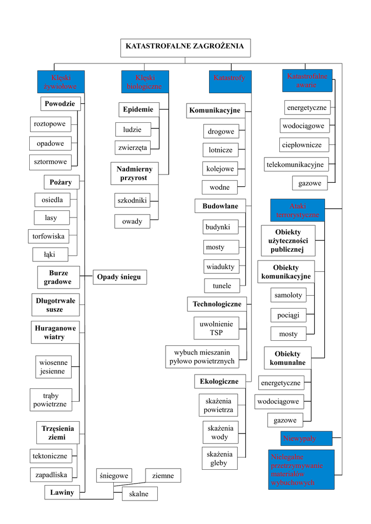 KATASTROFALNE ZAGROŻENIA Klęski żywiołowe Powodzie roztopowe opadowe sztormowe Pożary Klęski biologiczne Katastrofy Epidemie Komunikacyjne ludzie drogowe zwierzęta lotnicze Nadmierny przyrost kolejowe szkodniki lasy owady Budowlane budynki torfowiska mosty łąki wiadukty Opady śniegu ciepłownicze telekomunikacyjne gazowe Ataki terrorystyczne Obiekty użyteczności publicznej Obiekty komunikacyjne samoloty Technologiczne pociągi uwolnienie TSP Huraganowe wiatry wybuch mieszanin pyłowo powietrznych wiosenne jesienne Ekologiczne trąby powietrzne skażenia powietrza skażenia wody Trzęsienia ziemi skażenia gleby tektoniczne Lawiny wodociągowe tunele Długotrwałe susze zapadliska energetyczne wodne osiedla Burze gradowe Katastrofalne awarie śniegowe ziemne skalne mosty Obiekty komunalne energetyczne wodociągowe gazowe Niewypały Nielegalne przetrzymywanie materiałów wybuchowych