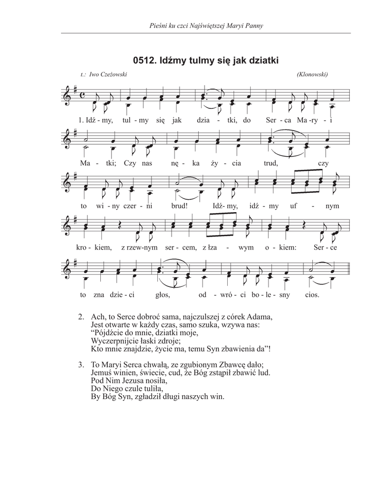 Pieśni ku czci Najświętszej Maryi Panny 0512. Idźmy tulmy się jak dziatki t.: Iwo Czeżowski 1. Idź - my, tul - my Ma - Czy nas to tki; 2. 3. się jak nę - wi - ny czer - ni kro - kiem, to (Klonowski) ka brud! z rzew-nym zna dzie - ci dzia - ży - cia Idź- my, ser - cem, z łza głos, tki, do od - Ser - ca Ma -ry - i trud, idź - my wym czy uf o - kiem: - wró - ci bo - le - sny Ach, to Serce dobroć sama, najczulszej z córek Adama, Jest otwarte w każdy czas, samo szuka, wzywa nas: “Pójdźcie do mnie, dziatki moje, Wyczerpnijcie łaski zdroje; Kto mnie znajdzie, życie ma, temu Syn zbawienia da”! To Maryi Serca chwałą, ze zgubionym Zbawcę dało; Jemuś winien, świecie, cud, że Bóg zstąpił zbawić lud. Pod Nim Jezusa nosiła, Do Niego czule tuliła, By Bóg Syn, zgładził długi naszych win. - nym Ser - ce cios.