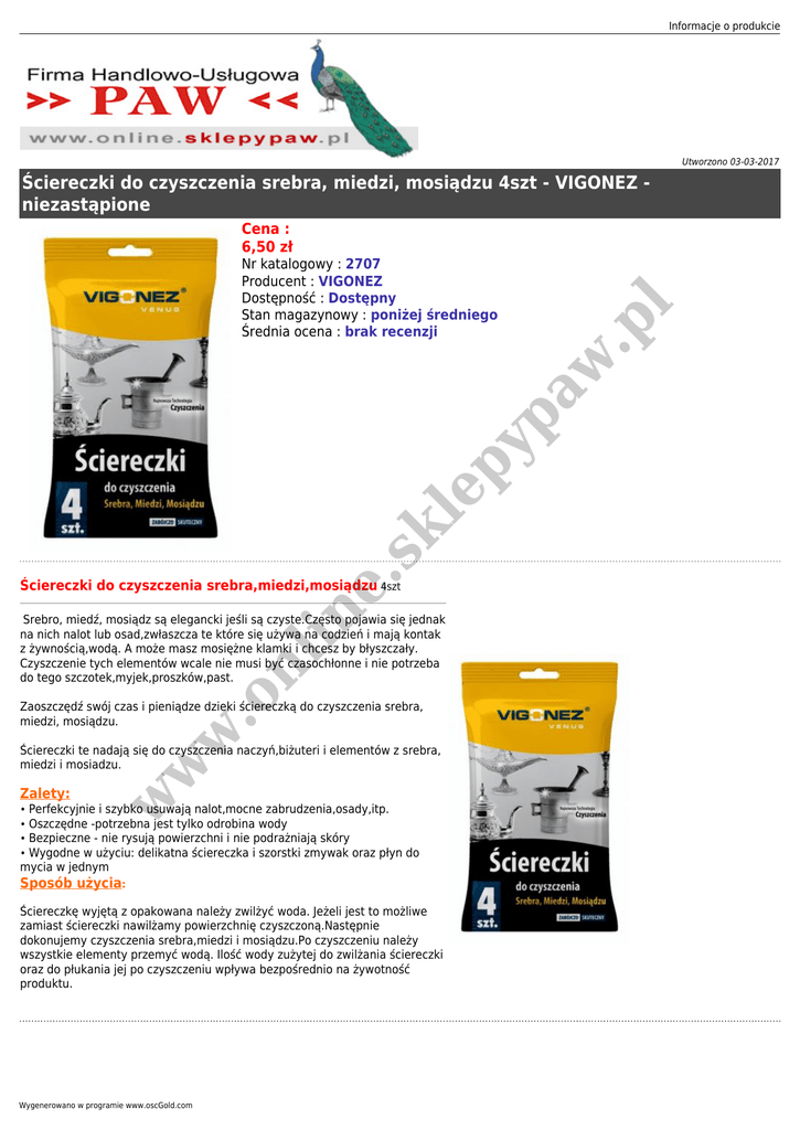 Informacje o produkcie Utworzono 03-03-2017 Ściereczki do czyszczenia srebra, miedzi, mosiądzu 4szt - VIGONEZ niezastąpione e. sk le py pa w Nr katalogowy : 2707 Producent : VIGONEZ Dostępność : Dostępny Stan magazynowy : poniżej średniego Średnia ocena : brak recenzji .p l Cena : 6,50 zł in Ściereczki do czyszczenia srebra,miedzi,mosiądzu 4szt .o nl Srebro, miedź, mosiądz są elegancki jeśli są czyste.Często pojawia się jednak na nich nalot lub osad,zwłaszcza te które się używa na codzień i mają kontak z żywnością,wodą. A może masz mosiężne klamki i chcesz by błyszczały. Czyszczenie tych elementów wcale nie musi być czasochłonne i nie potrzeba do tego szczotek,myjek,proszków,past. w Zaoszczędź swój czas i pieniądze dzieki ściereczką do czyszczenia srebra, miedzi, mosiądzu. Zalety: w w Ściereczki te nadają się do czyszczenia naczyń,biżuteri i elementów z srebra, miedzi i mosiadzu. • Perfekcyjnie i szybko usuwają nalot,mocne zabrudzenia,osady,itp. • Oszczędne -potrzebna jest tylko odrobina wody • Bezpieczne - nie rysują powierzchni i nie podrażniają skóry • Wygodne w użyciu: delikatna ściereczka i szorstki zmywak oraz płyn do mycia w jednym Sposób użycia: Ściereczkę wyjętą z opakowana należy zwilżyć woda. Jeżeli jest to możliwe zamiast ściereczki nawilżamy powierzchnię czyszczoną.Następnie dokonujemy czyszczenia srebra,miedzi i mosiądzu.Po czyszczeniu należy wszystkie elementy przemyć wodą. Ilość wody zużytej do zwilżania ściereczki oraz do płukania jej po czyszczeniu wpływa bezpośrednio na żywotność produktu. Wygenerowano w programie www.oscGold.com