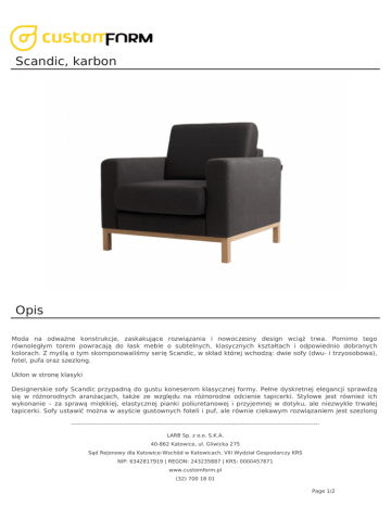 Scandic, karbon Opis Moda na odważne konstrukcje, zaskakujące rozwiązania i nowoczesny design wciąż trwa. Pomimo tego równoległym torem powracają do łask meble o subtelnych, klasycznych kształtach i odpowiednio dobranych kolorach. Z myślą o tym skomponowaliśmy serię Scandic, w skład której wchodzą: dwie sofy (dwu- i trzyosobowa), fotel, pufa oraz szezlong. Ukłon w stronę klasyki Designerskie sofy Scandic przypadną do gustu koneserom klasycznej formy. Pełne dyskretnej elegancji sprawdzą się w różnorodnych aranżacjach, także ze względu na różnorodne odcienie tapicerki. Stylowe jest również ich wykonanie – za sprawą miękkiej, elastycznej pianki poliuretanowej i przyjemnej w dotyku, ale niezwykle trwałej tapicerki. Sofy ustawić można w asyście gustownych foteli i puf, ale równie ciekawym rozwiązaniem jest szezlong ----------------------------------------------------------------------------------------------------------------------------------LARB Sp. z o.o. S.K.A. 40-862 Katowice, ul. Gliwicka 275 Sąd Rejonowy dla Katowice-Wschód w Katowicach, VIII Wydział Gospodarczy KRS NIP: 6342817919 | REGON: 243235887 | KRS: 0000457871 www.customform.pl (32) 700 18 01 Page 1/2 Scandic. Wywodzący się z baroku mebel, który służył popołudniowej sjeście, to połączenie kanapy z fotelem. Dzięki swojej konstrukcji umożliwia wypoczynek w pozycji półleżącej, zachowując walory mebla salonowego. Uwaga! Wybierz kolor, który najbardziej Ci odpowiada! Dostępna kolorystyka tapicerki w załącznikach: "Próbnik tkanin - I, II, III grupa cenowa”. Cena uzależniona jest od rodzaju wybranej tkaniny. Drewniane element wykończenia produktu możemy wykonać w kolorach naturalny - jasne drewno, orzech - ciemne drewno, biały oraz czarny. Specyfikacja Wysokość 90/s. 46 cm Szerokość 90 cm Głębokość 82 cm Głębokość siedziska 60 cm Wykończenie Siedzisko tkanina: 100% wysokoelestyczna tkanina Podstawa drewno poliester, wypełnienie: Dodatkowe zdjęcia ----------------------------------------------------------------------------------------------------------------------------------LARB Sp. z o.o. S.K.A. 40-862 Katowice, ul. Gliwicka 275 Sąd Rejonowy dla Katowice-Wschód w Katowicach, VIII Wydział Gospodarczy KRS NIP: 6342817919 | REGON: 243235887 | KRS: 0000457871 www.customform.pl (32) 700 18 01 Page 2/2 Powered by TCPDF (www.tcpdf.org) pianka
