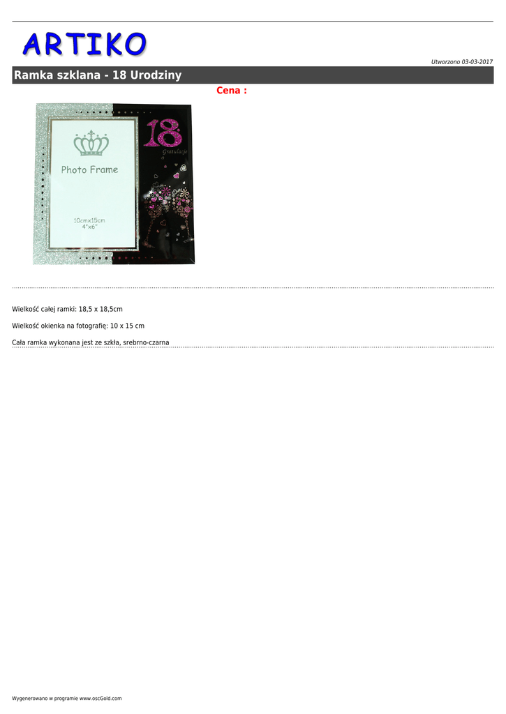 Utworzono 03-03-2017 Ramka szklana - 18 Urodziny Cena : Wielkość całej ramki: 18,5 x 18,5cm Wielkość okienka na fotografię: 10 x 15 cm Cała ramka wykonana jest ze szkła, srebrno-czarna Wygenerowano w programie www.oscGold.com