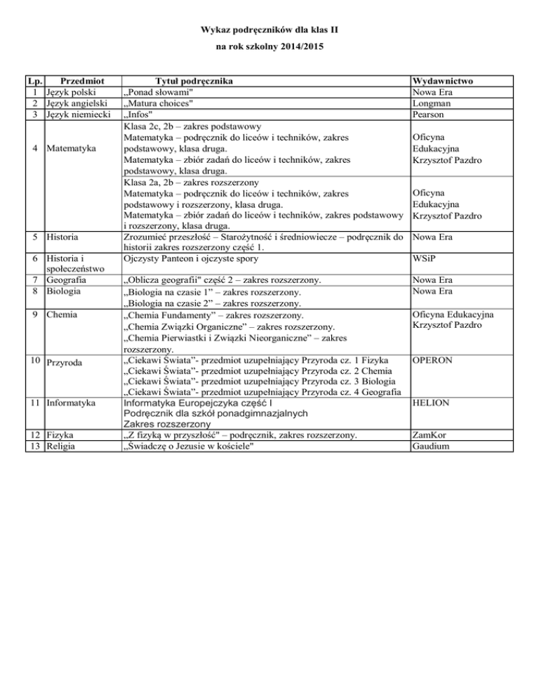 Wykaz podręczników dla klas II na rok szkolny 2014/2015 Lp