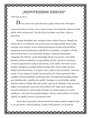 „NIEPOTRZEBNE DZIECKO” Michał Gruszka, klasa V D awno, dawno temu żyła sobie dziewczynka o imieniu Ania. Mieszkała w zniszczonym domu na strychu, razem z mama Grażyną i tatą Wojciechem. Rodzina ich była biedna, rodzice nie pracowali. Nie było ich stać na ubranie, nowy dom, a także na pożywienie. Pewnego dnia głodna Ania, wracając do domu znalazła 10 groszy. Pieniędzy nie wystarczyło na nic do jedzenia, więc przeznaczyła je na zakup zapałek. Dziewczynka wspinając się po stromych, starych schodach prowadzących do domu usłyszała kłótnię pomiędzy jej rodzicami, którzy jak zwykle kłócili się o pieniądze , szczególnie o ich brak. Gdy wróciła do domu nic nie powiedziała dorosłym o znalezionych pieniążkach. Następnego dnia Wojciech - jej tato dał jej kilka złotych na pożywienie, Ania oddała pieniądze, ponieważ pamiętała wczorajszą kłótnię rodziców. Rozzłoszczeni Grażyna i Wojciech wygonili dziewczynkę na ulicę mówiąc, że jest zbędna. Ania bardzo się tym przejęła, rozpłakała się i pobiegła daleko od swojego domu. Dziewczynka cały dzień błąkała się po ulicach miasta. A, że była to zima, szybko zaczęło się ściemniać i robić coraz zimniej. W nocy temperatura spadła znacznie poniżej zera. Ania przypomniała sobie o zapałkach schowanych głęboko w połatanym palcie. Przysiadła obok wysokiego parkanu przy miejskim parku i zapaliła jedną zapałkę. Zamykając oczy ujrzała pokój z pięknie nakrytym stołem na Wigilię, obok stołu stał piec rozgrzany do maksimum. Zaraz po tym do pokoju weszła jakaś pani i postawiła nowe posiłki na stół. Nagle zgasła zapałka i wszystko znikło jak sen. Dziewczynka otwierając oczy chciała zapalić jeszcze jedną zapałkę po to, aby wrócić do przytulnej atmosfery. Niestety zmarnowała przez to dziesięć zapałek, nie odpaliły, ponieważ był naprawdę zimno. Nastał słoneczny poranek. Ania postanowiła się rozejrzeć, ponieważ nigdy nie była w tej części miasta. Znalazła piekarnię ,w której chciała poprosić o coś do jedzenia. Sprzedawca ulitował się nad biednym dzieckiem i dał jej ciepłą bułkę i gorącą herbatę. Po zjedzeniu posiłku Ania podziękowała piekarzowi i wyruszyła w poszukiwaniu schronienia na jakiś czas. Znów nastała noc. Ponownie dziewczynka przytuliwszy się do muru jakiegoś domu zapaliła jedną zapałkę. Tym razem ujrzała piękny dom i przez szybkę zamarzniętego okna zobaczyła kochającą się rodzinę, która zaczęła otwierać prezenty od św. Mikołaja. Chwilę potem delikatny wiaterek zdmuchnął jej zapałkę i znowu wszystko znikło. Następnego dnia dziewczynka krążyła po ulicach miasta. Nikt nie zwracał na nią uwagi. Wieczorem Ania zjadła starą suchą bułkę, którą ktoś wyrzucił pod sklepem. W nocy Ania zziębnięta i głodna zasnęła. We śnie dziewczynka ujrzała, że jakaś dobra rodzina zabiera ją do swojego domu. Rankiem Ania została potraktowana okropnie, ponieważ dwóch chłopców w jej wieku wyśmiewało się z niej i dokuczało. Zawstydzona Ania szybko uciekła od dręczycieli. W noc przed Wigilią dziewczynce zabrakło zapałek nie mogła ani choć na chwilę się ogrzać, była głodna , upokorzona swym losem. Znużona zasnęła. W tym czasie, gdy Ania już spała, obok niej przechodziła pani, która spieszyła się robiąc spóźnione zakupy świąteczne. Kobieta zatrzymała się i zdziwiona tym, co tak małe dziecko robi samo w nocy na ulicy zaczęła budzić dziewczynkę. Dobra pani nie mogła dobudzić dziewczynki, więc wzięła ją na ręce i zaniosła do swego domu. Pani Marysia, bo tak miała na imię ta dobra kobieta odziała dziewczynkę w piękne, nowe ubranie, nakarmiła ją i dała jej wszystko czego potrzebowała. Ania Wigilię spędziła w taki sposób jaki marzyła. W trakcie tej uroczystej kolacji okazało się , że pani Maria i jej mąż nie mogli mieć własnych dzieci,
