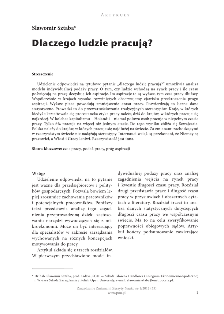 A Sławomir Sztaba* Dlaczego ludzie pracują? Streszczenie Udzielenie odpowiedzi na tytułowe pytanie „dlaczego ludzie pracują?” umożliwia analiza modelu indywidualnej podaży pracy. O tym, czy ludzie wchodzą na rynek pracy i ile czasu poświęcają na pracę decydują ich aspiracje. Im aspiracje te są wyższe, tym czas pracy dłuższy. Współcześnie w krajach wysoko rozwiniętych obserwujemy zjawisko przekroczenia progu aspiracji. Wyższe płace powodują zmniejszenie czasu pracy. Potwierdzają to liczne dane statystyczne. Prowadzi to do przewartościowania tradycyjnych stereotypów. Kraje, w których kiedyś ukształtowała się protestancka etyka pracy należą dziś do krajów, w których pracuje się najkrócej. W kolebce kapitalizmu – Holandii – niemal połowa osób pracuje w niepełnym czasie pracy. Tylko 6% pracuje na więcej niż jednym etacie. Do tego wyniku zbliża się Szwajcaria. Polska należy do krajów, w których pracuje się najdłużej na świecie. Za zmianami zachodzącymi w rzeczywistym świecie nie nadążają stereotypy. Internauci wciąż są przekonani, że Niemcy są pracowici, a Włosi i Grecy leniwi. Rzeczywistość jest inna. Słowa kluczowe: czas pracy, podaż pracy, próg aspiracji Wstęp Udzielenie odpowiedzi na to pytanie jest ważne dla przedsiębiorców i polityków gospodarczych. Pozwala bowiem lepiej zrozumieć zachowania pracowników i potencjalnych pracowników. Poniższy tekst przedstawia analizę tego zagadnienia przeprowadzoną dzięki zastosowaniu narzędzi wywodzących się z mikroekonomii. Może on być interesujący dla specjalistów w zakresie zarządzania wychowanych na różnych koncepcjach motywowania do pracy. Artykuł składa się z trzech rozdziałów. W pierwszym przedstawiono model in- dywidualnej podaży pracy oraz analizę zagadnienia wejścia na rynek pracy i kwestię długości czasu pracy. Rozdział drugi przedstawia pracę i długość czasu pracy w przysłowiach i obszernych cytatach z literatury. Rozdział trzeci to analiza danych statystycznych dotyczących długości czasu pracy we współczesnym świecie. Ma to na celu zweryfikowanie poprawności obiegowych sądów. Artykuł kończy podsumowanie zawierające wnioski. * Dr hab. Sławomir Sztaba, prof. nadzw., SGH — Szkoła Główna Handlowa (Kolegium Ekonomiczno-Społeczne) i Wyższa Szkoła Zarządzania / Polish Open University, e-mail: [email protected]. Zarządzanie Zmianami Zeszyty Naukowe 1/2012 (55) www.pou.pl 1 Z Z / 1. Modelowa analiza wejścia na rynek pracy i czasu pracy W mikroekonomii analizuje się wybór między czasem wolnym a dochodem. Przedstawia to rysunek 1. Rozważmy obiektywne uwarunkowania podjęcia pracy, analizując decyzje jednostki, która dokonuje wyboru między czasem wolnym a dochodem. Jej ograniczenie budżetowe zwane w tym modelu krzywą możliwości rynkowych ilustruje pogrubiona łamana linia na rysunku. Jeżeli badana przez nas osoba nie pracuje, ma wtedy 24 godziny czasu wolnego, a dochody uzyskuje z innych źródeł niż praca w wysokości Y0 (odcinek AB). Dochody te mogą pochodzić z kapitału (czynsze, odsetki, dywidendy), od rodziny lub od państwa (pomoc społeczna, zasiłki dla bezrobotnych). Jeżeli osoba ta podejmie pracę, poniesie koszty podjęcia pracy w wysokości Y0 - Y1 (odcinek BC). Koszty podjęcia pracy to utrata zasiłku dla bezrobotnych, koszty dojazdów do pracy, koszty opieki nad dziećmi, wydatki reprezentacyjne itp. W zamian za przepracowany czas osoba nasza będzie uzyskiwała wynagrodzenie. Wyrażenie |∆Y/∆t| — bezwzględna wartość współczynnika kierunkowego krzywej możliwości rynkowych — oznacza jej godzinową stawkę płac. Im wyższa godzinowa stawka płac, tym krzywa możliwości rynkowych będzie bardziej stroma. Zaznaczony czas t0 oznacza minimum biologiczne, które należy poświęcić na załatwienie potrzeb fizjologicznych, przede wszystkim na sen. W tym czasie nie można pracować. Rysunek 1. Krzywa możliwośći rynkowych na rynku pracy Źródło: Rysunek ten jest zamieszczony w większości podręczników mikroekonomii. Ukształtował się on w ramach długoletniej praktyki dydaktycznej. Trudno jednak jednoznacznie dociec, kto sporządził go jako pierwszy. Dlatego rezygnuję z podania źródła. Oczywiście nie roszczę sobie prawa do jego autorstwa. 2 Zarządzanie Zmianami Zeszyty Naukowe 1/2012 (55) www.pou.pl A Rysunek 2. Skrajne typy preferencji na rynku pracy Rysunek 3. domatora Źródło: opracowanie własne. Źródło: opracowanie własne. Subiektywne czynniki wpływające na decyzje o podjęciu pracy odzwierciedlają preferencje osobnika. Ilustruje je rysunek 2. Widzimy dwa skrajne typy preferencji. Pracuś — płaska krzywa obojętności — za nieznaczny wzrost dochodów zrezygnuje ze znacznej ilości czasu wolnego. Domator (leń) — stroma krzywa obojętności — skłonny jest zrezygnować z nieznacznej ilości czasu wolnego w zamian za bardzo wysokie wynagrodzenie. Zilustrujmy wpływ preferencji na decyzję o podjęciu pracy. Zakładamy, że obiektywne warunki podjęcia pracy są takie same, ale dwie osoby różnią się preferencjami. Na rysunku 3 przez punkt B pokazujący wielkość dochodów z innych źródeł niż praca przechodzi wyjściowa krzywa obojętności domatora U1. Jest ona stroma, gdyż wartość czasu wolnego jest dla domatora względnie wysoka. Żeby zdecydował się on na podjęcie pracy musiałby przejść na wyższą krzywą obojętności. Krzywa możliwości rynkowych styczna do wyższej krzywej obojętności (przerywana linia) musiałaby być bardzo stroma, tzn. godzinowa stawka płac musiałaby być niezwykle wysoka. Nikt takiej stawki płac domatorowi nie zaoferuje. Z kolei przy rynkowej stawce płac nie podejmie on pracy, gdyż oznaczałoby to, dla niego zmniejszenie użyteczności. Pracuś (rys. 4) przejdzie z krzywej obojętność U1 na U2 i podejmie pracę w wymiarze 24h — t1, podczas gdy przy tych samych obiektywnych warunkach