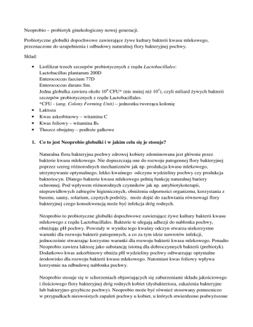 Neoprobio – probiotyk ginekologiczny nowej generacji. Probiotyczne globulki dopochwowe zawierające żywe kultury bakterii kwasu mlekowego, przeznaczone do uzupełnienia i odbudowy naturalnej flory bakteryjnej pochwy. Skład: • • • • • Liofilizat trzech szczepów probiotycznych z rzędu Lactobacillales: Lactobacillus plantarum 200D Enterococcus faecium 77D Enterococcus durans Sm. Jedna globulka zawiera około 109 CFU* (nie mniej niż 107), czyli miliard żywych bakterii szczepów probiotycznych z rzędu Lactobacillales. *CFU - (ang. Colony Forming Unit) – jednostka tworząca kolonię Laktoza Kwas askorbinowy – witamina C Kwas foliowy – witamina B9 Tłuszcz obojętny – podłoże gałkowe 1. Co to jest Neoprobio globulki i w jakim celu się je stosuje? Naturalna flora bakteryjna pochwy zdrowej kobiety zdominowana jest głównie przez bakterie kwasu mlekowego. Nie dopuszczają one do rozwoju patogennej flory bakteryjnej poprzez szereg różnorodnych mechanizmów jak np. produkcja kwasu mlekowego, utrzymywanie optymalnego, lekko kwaśnego odczynu wydzieliny pochwy czy produkcja bakteriocyn. Dlatego bakterie kwasu mlekowego pełnią funkcję naturalnej bariery ochronnej. Pod wpływem różnorodnych czynników jak np. antybiotykoterapii, nieprawidłowych zabiegów higienicznych, obniżenia odporności organizmu, korzystania z basenu, sauny, solarium, częstych podróży, może dojść do zachwiania równowagi flory bakteryjnej czego konsekwencją może być infekcja dróg rodnych. Neoprobio to probiotyczne globulki dopochwowe zawierające żywe kultury bakterii kwasu mlekowego z rzędu Lactobacillales. Bakterie te ulegają adhezji do nabłonka pochwy, obniżając pH pochwy. Powstały w wyniku tego kwaśny odczyn stwarza niekorzystne warunki dla rozwoju bakterii patogennych, a co za tym idzie nawrotów infekcji, jednocześnie stwarzając korzystne warunki dla rozwoju bakterii kwasu mlekowego. Ponadto Neoprobio zawiera laktozę jako substancję istotną dla dobroczynnych bakterii (prebiotyk). Dodatkowo kwas askorbinowy obniża pH wydzieliny pochwy odtwarzając optymalne środowisko dla rozwoju bakterii kwasu mlekowego. Natomiast kwas foliowy wpływa korzystnie na odbudowę nabłonka pochwy. Neoprobio stosuje się w schorzeniach objawiających się zaburzeniami składu jakościowego i ilościowego flory bakteryjnej dróg rodnych kobiet (dysbakterioza, zakażenia bakteryjne lub bakteryjno-grzybicze pochwy). Neoprobio może być również stosowany pomocniczo w przypadkach nieswoistych zapaleń pochwy u kobiet, u których stwierdzono podwyższone pH wydzieliny pochwy. Neoprobio stosowany profilaktycznie pomaga utrzymywać dogodne warunki dla rozwoju naturalnej flory bakteryjnej pochwy. 2. Jak stosować globulki Neoprobio? DAWKOWANIE: Wspomaganie leczenia infekcji dróg rodnych w celu zredukowania patologicznej flory bakteryjnej pochwy oraz przywrócenia naturalnego pH dróg rodnych: jedna (najlepiej przed snem) do dwóch globulek dziennie (jedną rano a drugą na noc) przez 10 dni. Profilaktycznie w celu utrzymania prawidłowego składu flory bakteryjnej dróg rodnych oraz fizjologicznego pH: jedna globulka (najlepiej przed snem) przez pięć dni. Można stosować także w trakcie antybiotykoterapii oraz po jej zakończeniu. SPOSÓB UŻYCIA: Przed zastosowaniem preparatu dokładnie umyć dłonie. Globulkę umieścić głęboko w pochwie. W przypadku wątpliwości co do dawkowania i sposobu użycia należy zasięgnąć porady lekarza lub farmaceuty. Jeżeli po kilkudniowym stosowaniu preparatu dolegliwości nasilą się lub nie ustąpią, należy skonsultować się z lekarzem. Stosowanie preparatu u młodych dziewcząt należy skonsultować z lekarzem ginekologiem. MOŻLIWE DZIAŁANIA NIEPOŻĄDANE: Preparat jest na ogół bardzo dobrze tolerowany. Bardzo rzadko mogą wystąpić objawy nadwrażliwości przejawiające się pieczeniem, świądem, podrażnieniem błony śluzowej pochwy i sromu. W przypadku wystąpienia takich objawów należy zaprzestać stosowania preparatu i powiadomić lekarza lub farmaceutę. Nie stosować w przypadku uczulenia na którykolwiek ze składników preparatu. 3. Przechowywanie: Ze względu na obecność żywych kultur bakterii probiotycznych Neoprobio należy przechowywać w lodówce (2-8°C). Nie należy stosować preparatu po upływie terminu ważności określonego na wytłoczce i opakowaniu zewnętrznym. Przechowywać w miejscu niedostępnym i niewidocznym dla dzieci. Opakowanie zawiera 10 globulek dopochwowych. W celu uzyskania bardziej szczegółowych informacji należy zwrócić się do producenta: FARMINA SP. Z O.O. UL. LIPSKA 44 30-721 KRAKÓW tel. 12 290 90 00 fax 12 290 90 50 e-mail: [email protected] www.farmina.pl Data ostatniej aktualizacji instrukcji używania: 08.2015 Wyprodukowano na licencji NEOPROBIOCARE, KANADA. Wyrób medyczny CE
