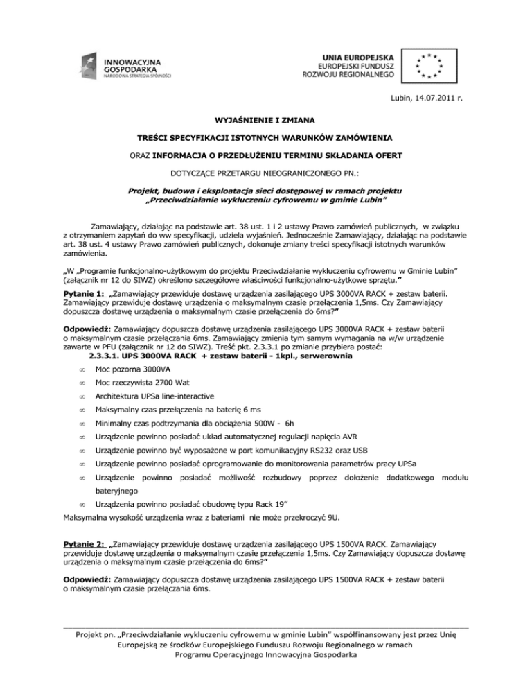 Lubin, 14.07.2011 r. WYJAŚNIENIE I ZMIANA TREŚCI SPECYFIKACJI ISTOTNYCH WARUNKÓW ZAMÓWIENIA ORAZ INFORMACJA O PRZEDŁUŻENIU TERMINU SKŁADANIA OFERT DOTYCZĄCE PRZETARGU NIEOGRANICZONEGO PN.: Projekt, budowa i eksploatacja sieci dostępowej w ramach projektu „Przeciwdziałanie wykluczeniu cyfrowemu w gminie Lubin” Zamawiający, działając na podstawie art. 38 ust. 1 i 2 ustawy Prawo zamówień publicznych, w związku z otrzymaniem zapytań do ww specyfikacji, udziela wyjaśnień. Jednocześnie Zamawiający, działając na podstawie art. 38 ust. 4 ustawy Prawo zamówień publicznych, dokonuje zmiany treści specyfikacji istotnych warunków zamówienia. „W „Programie funkcjonalno-użytkowym do projektu Przeciwdziałanie wykluczeniu cyfrowemu w Gminie Lubin” (załącznik nr 12 do SIWZ) określono szczegółowe właściwości funkcjonalno-użytkowe sprzętu.” Pytanie 1: „Zamawiający przewiduje dostawę urządzenia zasilającego UPS 3000VA RACK + zestaw baterii. Zamawiający przewiduje dostawę urządzenia o maksymalnym czasie przełączenia 1,5ms. Czy Zamawiający dopuszcza dostawę urządzenia o maksymalnym czasie przełączenia do 6ms?” Odpowiedź: Zamawiający dopuszcza dostawę urządzenia zasilającego UPS 3000VA RACK + zestaw baterii o maksymalnym czasie przełączania 6ms. Zamawiający zmienia tym samym wymagania na w/w urządzenie zawarte w PFU (załącznik nr 12 do SIWZ). Treść pkt. 2.3.3.1 po zmianie przybiera postać: 2.3.3.1. UPS 3000VA RACK + zestaw baterii - 1kpl., serwerownia • Moc pozorna 3000VA • Moc rzeczywista 2700 Wat • Architektura UPSa line-interactive • Maksymalny czas przełączenia na baterię 6 ms • Minimalny czas podtrzymania dla obciążenia 500W - 6h • Urządzenie powinno posiadać układ automatycznej regulacji napięcia AVR • Urządzenie powinno być wyposażone w port komunikacyjny RS232 oraz USB • Urządzenie powinno posiadać oprogramowanie do monitorowania parametrów pracy UPSa • Urządzenie powinno posiadać możliwość rozbudowy poprzez dołożenie dodatkowego modułu bateryjnego • Urządzenia powinno posiadać obudowę typu Rack 19’’ Maksymalna wysokość urządzenia wraz z bateriami nie może przekroczyć 9U. Pytanie 2: „Zamawiający przewiduje dostawę urządzenia zasilającego UPS 1500VA RACK. Zamawiający przewiduje dostawę urządzenia o maksymalnym czasie przełączenia 1,5ms. Czy Zamawiający dopuszcza dostawę urządzenia o maksymalnym czasie przełączenia do 6ms?” Odpowiedź: Zamawiający dopuszcza dostawę urządzenia zasilającego UPS 1500VA RACK + zestaw baterii o maksymalnym czasie przełączania 6ms. ___________________________________________________________________________________________ Projekt pn. „Przeciwdziałanie wykluczeniu cyfrowemu w gminie Lubin” współfinansowany jest przez Unię Europejską ze środków Europejskiego Funduszu Rozwoju Regionalnego w ramach Programu Operacyjnego Innowacyjna Gospodarka Pytanie 3: „Zamawiający przewiduje dostawę urządzenia zasilającego UPS 1500VA RACK. Zamawiający przewiduje dostawę urządzenia o mocy rzeczywistej 980 W. Czy Zamawiający dopuszcza dostawę urządzenia o mocy rzeczywistej 900W?” Odpowiedź: Zamawiający dopuszcza dostawę urządzenia zasilającego UPS 1500VA RACK + zestaw baterii o mocy rzeczywistej 900 W. W związku z odpowiedziami udzielonymi na pytania 2 i 3 Zamawiający zmienia tym samym wymagania na urządzenie zasilające UPS 1500VA RACK + zestaw baterii zawarte w PFU (załącznik nr 12 do SIWZ). Treść pkt. 2.3.3.2 PFU po zmianie przybiera postać: 2.3.3.2. UPS 1500VA RACK - 20 kpl., węzły dostępowe • Moc pozorna 1500VA • Moc rzeczywista 900 W • Architektura UPSa line-interactive • Maksymalny czas przełączenia na baterię 6 ms • Minimalny czas podtrzymania dla obciążenia 100W - 3h • Urządzenie powinno posiadać układ automatycznej regulacji napięcia AVR • Urządzenie powinno być wyposażone w port komunikacyjny RS232 oraz USB • Urządzenie powinno posiadać oprogramowanie do monitorowania parametrów pracy UPSa • Urządzenie powinno posiadać obudowę typu Rack 19’’ Maksymalna wysokość urządzenia 3U. Zamawiający, działając na podstawie art. 38 ust. 6 ustawy Prawo zamówień publicznych, w związku z otrzymaniem zapytań do specyfikacji istotnych warunków zamówienia oraz dokonaniem zmiany treści specyfikacji nieprowadzącej do zmiany treści ogłoszenia o zamówieniu informuje, o przedłużeniu terminu składania ofert w niniejszym postępowaniu. Zamawiający przedłuża termin składania ofert do dnia: 19.07.2011 r. do godz. 10,00. Otwarcie ofert odbędzie się 19.07.2011 r. o godz. 10,15 (Ogłoszenie o zmianie ogłoszenia w zakresie terminu składania ofert zostało zamieszczone na stronie internetowej Zamawiającego – www.bip.ug-lubin.dolnyslask.pl). Powyższą zmianę terminu należy uwzględnić przy składaniu i określaniu terminu ważności wadium. WÓJT GMINY /-/ Irena Rogowska Otrzymują: 1. Wykonawcy, którzy zadali pytania, 2. www.bip.ug-lubin.dolnyslask.pl, 3. a/a. ___________________________________________________________________________________________ Projekt pn. „Przeciwdziałanie wykluczeniu cyfrowemu w gminie Lubin” współfinansowany jest przez Unię Europejską ze środków Europejskiego Funduszu Rozwoju Regionalnego w ramach Programu Operacyjnego Innowacyjna Gospodarka