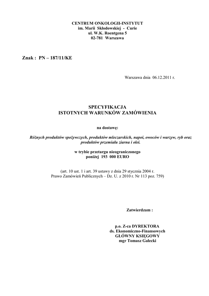 CENTRUM ONKOLOGII-INSTYTUT im. Marii Skłodowskiej - Curie ul. W.K. Roentgena 5 02-781 Warszawa Znak : PN – 187/11/KE Warszawa dnia 06.12.2011 r. SPECYFIKACJA ISTOTNYCH WARUNKÓW ZAMÓWIENIA na dostawę: Różnych produktów spożywczych, produktów mleczarskich, napoi, owoców i warzyw, ryb oraz produktów przemiału ziarna i olei. w trybie przetargu nieograniczonego poniżej 193 000 EURO (art. 10 ust. 1 i art. 39 ustawy z dnia 29 stycznia 2004 r. Prawo Zamówień Publicznych – Dz. U. z 2010 r. Nr 113 poz. 759) Zatwierdzam : p.o. Z-ca DYREKTORA ds. Ekonomiczno-Finansowych GŁÓWNY KSIĘGOWY mgr Tomasz Gałecki I. Nazwa i adres Zamawiającego CENTRUM ONKOLOGII – INSTYTUT im. Marii Skłodowskiej – Curie ul. W. K. Roentgena 5, 02 – 781 Warszawa NIP 525 000 80 57, REGON 000 288 366 NIP – jako podatnika VAT UE: PL 5250008057 Dział Zamówień Publicznych i Zaopatrzenia – Sekcja ds. Zamówień Publicznych Tel. (22) 546 32 64, fax. (22) 546 25 00 strona internetowa www.coi.waw.pl, poczta elektroniczna: [email protected] 1. Tryb udzielenia zamówienia Postępowanie o udzielenie zamówienia publicznego na dostawę : Różnych produktów spożywczych, produktów mleczarskich, napoi, owoców i warzyw, ryb oraz produktów przemiału ziarna i olei dla Hotelu Szkoleniowego w Centrum Onkologii prowadzone jest w trybie przetargu nieograniczonego PN – 187/11/KE na podstawie art. 10 ust. 1 oraz art. 39 ustawy z dnia 29 stycznia 2004 r. Prawo Zamówień Publicznych (Dz. U. z 2010 r. Nr 113 poz. 759.). 2. Przedmiot zamówienia 1. Przedmiot zamówienia obejmuje dostawę: Różnych produktów spożywczych, produktów mleczarskich, napoi, owoców i warzyw, ryb oraz produktów przemiału ziarna i olei dla Hotelu Szkoleniowego w Centrum Onkologii. Przedmiot zamówienia szczegółowo określony w załączniku nr 1 do SIWZ. 03.20.00.00-3 - zboża, ziemniaki, warzywa, owoce i orzechy, 03.22.21.15-2 – rodzynki, 03.30.00.00-2 – produkty hodowli, łowiectwa i rybołówstwa, 03.31.10.00-2 – ryby, 15.30.00.00-1 – owoce, warzywa i podobne produkty, 15.31.23.00-1 – chipsy ziemniaczane, 15.32.10.00-4 – soki owocowe, 15.32.21.00-2 – sok pomidorowy, 15.33.11.70-9 – warzywa mrożone, 15.33.23.10-0 orzechy palone lub solone, 15.33.24.00-8 owoce konserwowane. 15.40.00.00.-2 – oleje, tłuszcze zwierzęce lub roślinne, 15.41.11.10-6 oliwa z oliwek, 15.50.00.00-3 – produkty mleczarskie, 15.51.00.00-6 – mleko i śmietana, 15.51.12.10-8 – mleko UHT, 15.54.00.00-5 – produkty serowarskie, 15.60.00.00-4 – produkty przemiału ziarna, skrobi i produktów skrobiowych, 15.80.00.00-6 – różne produkty spożywcze, 15.81.21.00-4 – wyroby ciastkarskie, 15.82.11.00-0 pieczywo tostowe, 15.84.10.00-5 – kakao, 15.84.22.20-0 – batony czekoladowe, 15.84.23.00-5 – wyroby cukiernicze, 15.86.00.00-4 kawa, herbata i podobne produkty, 15.87.10.00-4 – ocet, sosy, mieszanki przypraw, mąka i mączka z gorczycy, gotowa musztarda, 15.90.00.00-7 – napoje, tytoń i produkty podobne, 15.98.00.00-1 – napoje bezalkoholowe, 15.98.20.00-5 napoje orzeźwiające, 15.99.10.00-8 – wody mineralne. 2. Zamawiający nie dopuszcza składania ofert częściowych . 3. Zamawiający dopuszcza składanie ofert równoważnych, spełniających warunki dotyczące przedmiotu zamówienia zawartego w niniejszej SIWZ. Zamawiający używając określenia „typu” dopuszcza składanie ofert równoważnych w danym asortymencie. IV. Informacja o zamówieniach uzupełniających Zamawiający nie przewiduje zamówień uzupełniających, o których mowa w art. 67 ust. 1 pkt. 7 ustawy prawo zamówień publicznych. V. Oferty wariantowe Zamawiający nie dopuszcza składania ofert wariantowych. VI. Termin wykonania zamówienia W terminie 12 miesięcy od dnia podpisania umowy. Zamówienie należy realizować sukcesywnie, zgodnie z bieżącym zapotrzebowaniem Hotelu Szkoleniowego w Centrum Onkologii przy ul. Roentgena 5. VII. Opis warunków udziału w postępowaniu oraz opis sposobu dokonywania oceny spełniania tych warunków 1. O zamówienie mogą ubiegać się Wykonawcy, którzy spełniają następujące warunki: a) posiadania uprawnień do wykonywania określonej działalności lub czynności, jeżeli przepisy prawa nakładają obowiązek ich posiadania; b) posiadania wiedzy i doświadczenia; c) dysponowania odpowiednim potencjałem technicznym oraz osobami zdolnymi do wykonania zamówienia; d) sytuacji ekonomicznej i finansowej. 2. Instrukcja dla Wykonawców: a) Wykonawca może złożyć tylko jedną ofertę z tym, że nie dopuszcza się składania ofert częściowych na wybrane części zamówienia. Złożenie więcej niż jednej oferty spowoduje odrzucenie każdej z nich. b) Wykonawca przedstawia ofertę zgodnie z wymogami określonymi w SIWZ. c) Wszelkie koszty związane z przygotowaniem i złożeniem oferty ponosi Wykonawca. d) Nie przewiduje się zwoływania zebrania Wykonawców. e) Ofertę składa się, pod rygorem nieważności, w formie pisemnej. f) Treść oferty musi odpowiadać treści Specyfikacji Istotnych Warunków Zamówienia. 3. Sposób oceny oferty: Oferta oceniana będzie pod względem: 1. formalnym, tj. spełnienia warunków podanych w Specyfikacji Istotnych Warunków Zamówienia (wymagana dokumentacja wyszczególniona poniżej); 2. merytorycznym, tj. wyboru najkorzystniejszej oferty zgodnie z podanymi kryteriami. Zamawiający przy ocenie spełniania warunków udziału w postępowaniu zastosuje formułę spełnia / nie spełnia. Nie spełnienie chociażby jednego z wymienionych warunków skutkować będzie wykluczeniem Wykonawcy z postępowania o udzielenie zamówienia w oparciu o przesłanki zawarte w art. 24 ustawy Prawo Zamówień Publicznych. Ofertę Wykonawcy wykluczonego uzna się za odrzuconą zgodnie z art. 24 ust. 4 przytaczanej ustawy. VIII. Wykaz oświadczeń i dokumentów, jakie mają dostarczyć Wykonawcy w celu potwierdzenia spełniania warunków udziału w postępowaniu, i wykazania braku podsta