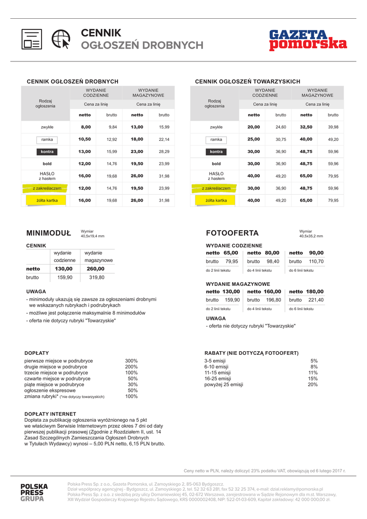 CENNIK OGŁOSZEŃ DROBNYCH CENNIK OGŁOSZEŃ DROBNYCH Rodzaj ogłoszenia CENNIK OGŁOSZEŃ TOWARZYSKICH WYDANIE CODZIENNE WYDANIE MAGAZYNOWE Cena za linię Cena za linię netto brutto netto brutto zwykłe 8,00 9,84 13,00 15,99 ramka 10,50 12,92 18,00 kontra 13,00 15,99 bold 12,00 HASŁO z hasłem Rodzaj ogłoszenia WYDANIE CODZIENNE WYDANIE MAGAZYNOWE Cena za linię Cena za linię netto brutto netto brutto zwykłe 20,00 24,60 32,50 39,98 22,14 ramka 25,00 30,75 40,00 49,20 23,00 28,29 kontra 30,00 36,90 48,75 59,96 14,76 19,50 23,99 bold 30,00 36,90 48,75 59,96 16,00 19,68 26,00 31,98 HASŁO z hasłem 40,00 49,20 65,00 79,95 z zakreślaczem 12,00 14,76 19,50 23,99 z zakreślaczem 30,00 36,90 48,75 59,96 żółta kartka 16,00 19,68 26,00 31,98 żółta kartka 40,00 49,20 65,00 79,95 MINIMODUŁ CENNIK wydanie codzienne Wymiar 40,5x19,4 mm wydanie magazynowe netto130,00260,00 brutto 159,90 FOTOOFERTA Wymiar 40,5x35,2 mm WYDANIE CODZIENNE netto65,00 netto80,00 netto 90,00 brutto brutto 79,95 do 2 linii tekstu brutto 98,40 do 4 linii tekstu 110,70 do 6 linii tekstu 319,80 UWAGA -m inimoduły ukazują się zawsze za ogłoszeniami drobnymi we wskazanych rubrykach i podrubrykach -m ożliwe jest połączenie maksymalnie 8 minimodułów - oferta nie dotyczy rubryki "Towarzyskie" WYDANIE MAGAZYNOWE netto130,00 netto160,00 netto180,00 brutto 159,90 brutto 196,80 brutto do 2 linii tekstu do 4 linii tekstu do 6 linii tekstu 221,40 UWAGA - oferta nie dotyczy rubryki "Towarzyskie" DOPŁATY RABATY (NIE DOTYCZĄ FOTOOFERT) pierwsze miejsce w podrubryce 300% drugie miejsce w podrubryce 200% trzecie miejsce w podrubryce 100% czwarte miejsce w podrubryce 50% piąte miejsce w podrubryce 30% ogłoszenie ekspresowe 50% zmiana rubryki* (*nie dotyczy towarzyskich)100% 3-5 emisji 6-10 emisji 11-15 emisji 16-25 emisji powyżej 25 emisji 5% 8% 11% 15% 20% DOPŁATY INTERNET Dopłata za publikację ogłoszenia wyróżnionego na 5 pkt we właściwym Serwisie Internetowym przez okres 7 dni od daty pierwszej publikacji prasowej (Zgodnie z Rozdziałem II, ust. 14 Zasad Szczególnych Zamieszczania Ogłoszeń Drobnych w Tytułach Wydawcy) wynosi – 5,00 PLN netto, 6,15 PLN brutto. Ceny netto w PLN, należy doliczyć 23% podatku VAT, obowiązują od 6 lutego 2017 r. Polska Press Sp. z o.o., Gazeta Pomorska, ul. Zamoyskiego 2, 85-063 Bydgoszcz. Dział współpracy agencyjnej - Bydgoszcz, ul. Zamoyskiego 2, tel. 52 32 63 281, fax 52 32 25 374, e-mail: [email protected] Polska Press Sp. z o.o. z siedzibą przy ulicy Domaniewskiej 45, 02-672 Warszawa, zarejestrowana w Sądzie Rejonowym dla m.st. Warszawy, XIII Wydział Gospodarczy Krajowego Rejestru Sądowego, KRS 0000002408, NIP: 522-01-03-609, Kapitał zakładowy: 42 000 000,00 zł.
