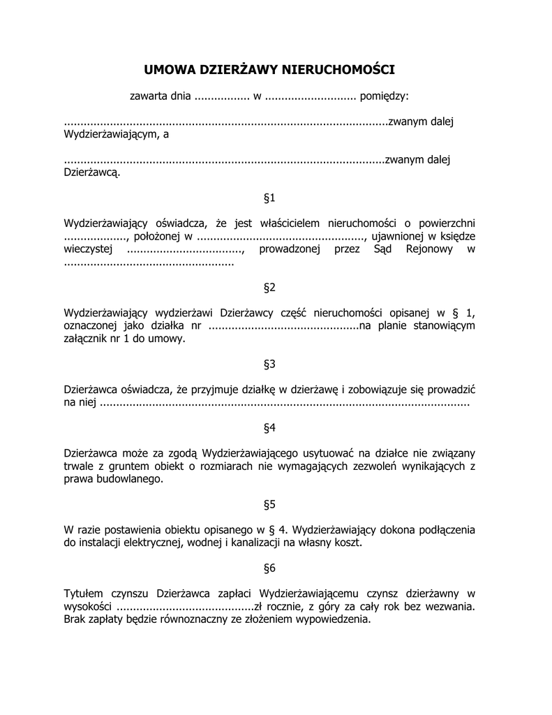 UMOWA DZIERŻAWY NIERUCHOMOŚCI zawarta dnia ................. w ............................ pomiędzy: ...................................................................................................zwanym dalej Wydzierżawiającym, a ..................................................................................................zwanym dalej Dzierżawcą. §1 Wydzierżawiający oświadcza, że jest właścicielem nieruchomości o powierzchni ..................., położonej w ..................................................., ujawnionej w księdze wieczystej ..................................., prowadzonej przez Sąd Rejonowy w .................................................... §2 Wydzierżawiający wydzierżawi Dzierżawcy część nieruchomości opisanej w § 1, oznaczonej jako działka nr ..............................................na planie stanowiącym załącznik nr 1 do umowy. §3 Dzierżawca oświadcza, że przyjmuje działkę w dzierżawę i zobowiązuje się prowadzić na niej ................................................................................................................. §4 Dzierżawca może za zgodą Wydzierżawiającego usytuować na działce nie związany trwale z gruntem obiekt o rozmiarach nie wymagających zezwoleń wynikających z prawa budowlanego. §5 W razie postawienia obiektu opisanego w § 4. Wydzierżawiający dokona podłączenia do instalacji elektrycznej, wodnej i kanalizacji na własny koszt. §6 Tytułem czynszu Dzierżawca zapłaci Wydzierżawiającemu czynsz dzierżawny w wysokości ..........................................zł rocznie, z góry za cały rok bez wezwania. Brak zapłaty będzie równoznaczny ze złożeniem wypowiedzenia. §7 Dzierżawca bez zgody Wydzierżawiającego nie może poddzierżawić przedmiotu niniejszej umowy. §8 Umowa zostaje zawarta na okres od ....................................... do........................... §9 Umowa może być rozwiązana za pisemnym wypowiedzeniem złożonym przed zakończeniem roku kalendarzowego. §10 Wydzierżawiający może rozwiązać umowę bez wypowiedzenia w przypadku: 1. postawienia obiektu innego niż w § 4, 2. prowadzenia innej działalności niż określona w §3 , 3. nie zrealizowania zobowiązań czynszowych. §11 Wszelkie zmiany niniejszej umowy wymagają formy pisemnej pod rygorem nieważności. §12 Ewentualne spory wynikłe na tle stosowania niniejszej umowy strony poddają rozstrzygnięciu Sądu właściwego dla miejsca zawarcia umowy. §13 W sprawach nieuregulowanych niniejszą umową stosuje się przepisy Kodeksu Cywilnego. §14 Umowę sporządzono w dwóch jednobrzmiących egzemplarzach, po jednym dla każdej ze stron. ............................................. Wydzierżawiający ....................................................... Dzierżawca