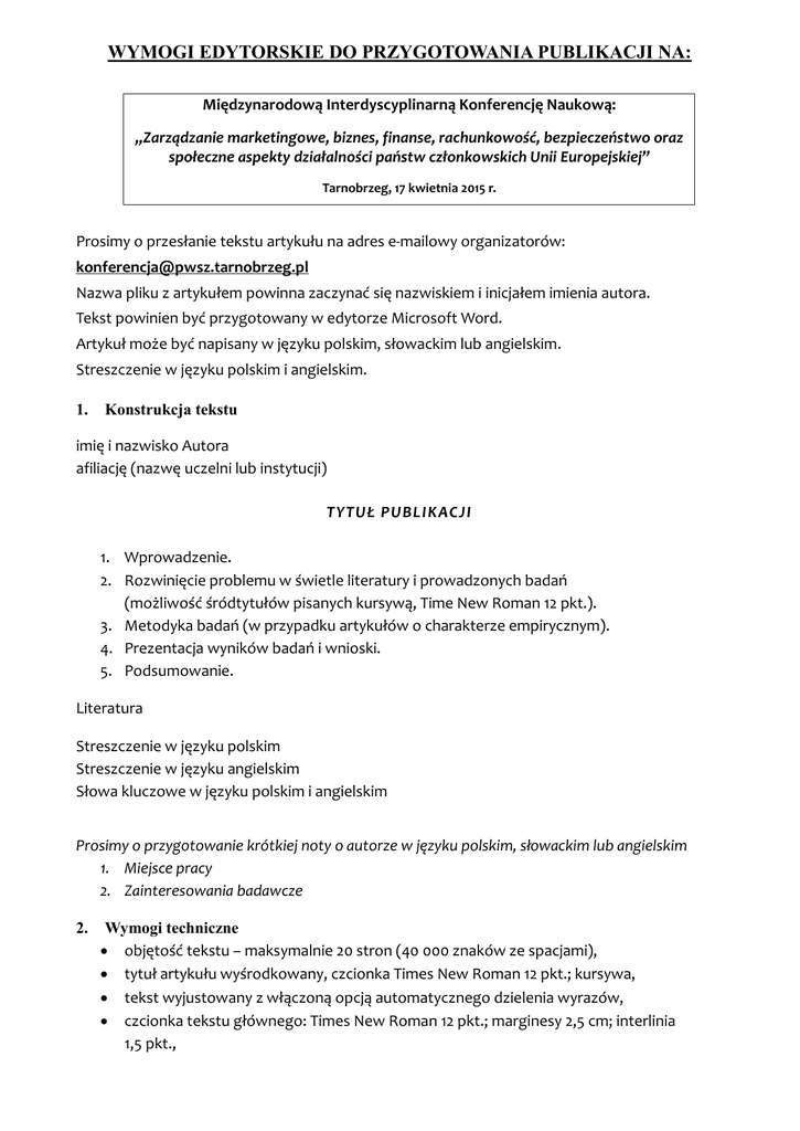 WYMOGI EDYTORSKIE DO PRZYGOTOWANIA PUBLIKACJI NA: Międzynarodową Interdyscyplinarną Konferencję Naukową: „Zarządzanie marketingowe, biznes, finanse, rachunkowość, bezpieczeństwo oraz społeczne aspekty działalności państw członkowskich Unii Europejskiej” Tarnobrzeg, 17 kwietnia 2015 r. Prosimy o przesłanie tekstu artykułu na adres e-mailowy organizatorów: [email protected] Nazwa pliku z artykułem powinna zaczynać się nazwiskiem i inicjałem imienia autora. Tekst powinien być przygotowany w edytorze Microsoft Word. Artykuł może być napisany w języku polskim, słowackim lub angielskim. Streszczenie w języku polskim i angielskim. 1. Konstrukcja tekstu imię i nazwisko Autora afiliację (nazwę uczelni lub instytucji) TYTUŁ PUBLIKACJI 1. Wprowadzenie. 2. Rozwinięcie problemu w świetle literatury i prowadzonych badań (możliwość śródtytułów pisanych kursywą, Time New Roman 12 pkt.). 3. Metodyka badań (w przypadku artykułów o charakterze empirycznym). 4. Prezentacja wyników badań i wnioski. 5. Podsumowanie. Literatura Streszczenie w języku polskim Streszczenie w języku angielskim Słowa kluczowe w języku polskim i angielskim Prosimy o przygotowanie krótkiej noty o autorze w języku polskim, słowackim lub angielskim 1. Miejsce pracy 2. Zainteresowania badawcze 2. Wymogi techniczne objętość tekstu – maksymalnie 20 stron (40 000 znaków ze spacjami), tytuł artykułu wyśrodkowany, czcionka Times New Roman 12 pkt.; kursywa, tekst wyjustowany z włączoną opcją automatycznego dzielenia wyrazów, czcionka tekstu głównego: Times New Roman 12 pkt.; marginesy 2,5 cm; interlinia 1,5 pkt., cytaty pisane kursywą, tekst bez pogrubień i podkreśleń, tabele i wykresy opisane (nad tabelą / wykresem nazwa, a pod tabelą / wykresem źródło), wyrazy zaczerpnięte z języków obcych pisane kursywą, przypisy harwardzkie (Kowalski 2013, s. 12). 3. Streszczenie w języku polskim i angielskim maksymalna objętość streszczenia: 1000 znaków ze spacjami, przetłumaczony tytuł artykułu wyśrodkowany, pisany kursywą, czcionka Times New Roman 12 pkt., tekst wyjustowany z włączoną opcją automatycznego dzielenia wyrazów, czcionka Times New Roman 12 pkt.; interlinia 1,5, marginesy 2,5 cm. 4. Bibliografia monografia: Nazwisko Inicjał imienia., Tytuł monografii kursywą, Wydawnictwo, Warszawa 2000. artykuł w pracy zbiorowej: Nazwisko Inicjał imienia., Tytuł artykułu kursywą, w: Inicjał imienia. Nazwisko (red.), Tytuł pracy zbiorowej kursywą, Wydawnictwo, Warszawa 2001, s. 15 – 38. artykuł w czasopiśmie: Nazwisko Inicjał imienia., Tytuł artykułu kursywą, „Tytuł czasopisma" 2010, nr 4, s. 12 - 26. publikacja prasowa: Nazwisko Inicjał imienia., Tytuł publikacji kursywą, „Tytuł gazety", z dn. 12.11.2011, (opcjonalnie nr 2), s. 3 - 4. źródła internetowe: http://www.bbn.gov.pl/portal/pl/610/18/Rada_Bezpieczenstwa_Narodowego.html (dostęp: 15.04.2014 r.). źródła prawne: nazwa (ustawy, rozporządzenia), Dz. U. nr poz. Do publikacji dopuszczone zostaną artykuły po otrzymaniu pozytywnej recenzji i podpisaniu umowy o przeniesienie autorskich praw majątkowych. O wyniku recenzji Autorzy artykułów zostaną powiadomieni pocztą elektroniczną. Przesyłanie artykułu Tekst artykułu należy przesłać w nieprzekraczalnym terminie do 17 kwietnia 2015 roku na adres: Państwowa Wyższa Szkoła Zawodowa im. prof. Stanisława Tarnowskiego w Tarnobrzegu ul. Sienkiewicza 50, 39-400 Tarnobrzeg e-mail: [email protected]
