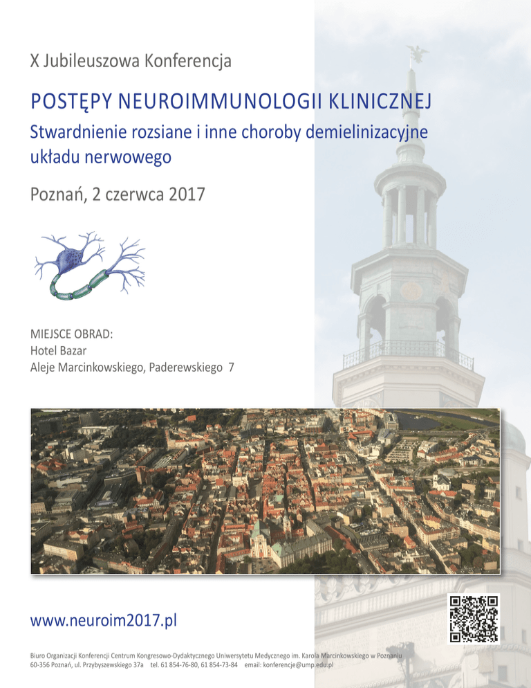 X Jubileuszowa Konferencja POSTĘPY NEUROIMMUNOLOGII KLINICZNEJ Stwardnienie rozsiane i inne choroby demielinizacyjne układu nerwowego Poznań, 2 czerwca 2017 MIEJSCE OBRAD: Hotel Bazar Aleje Marcinkowskiego, Paderewskiego 7 www.neuroim2017.pl Biuro Organizacji Konferencji Centrum Kongresowo-Dydaktycznego Uniwersytetu Medycznego im. Karola Marcinkowskiego w Poznaniu 60-356 Poznań, ul. Przybyszewskiego 37a tel. 61 854-76-80, 61 854-73-84 email: [email protected]