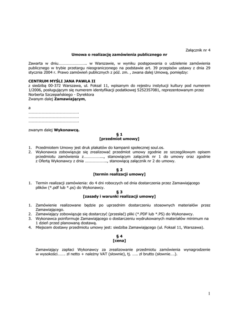 Umowa o realizację zamówienia publicznego nr Załącznik nr 4 Zawarta w dniu…………………….. w Warszawie, w wyniku postępowania o udzielenie zamówienia publicznego w trybie przetargu nieograniczonego na podstawie art. 39 przepisów ustawy z dnia 29 stycznia 2004 r. Prawo zamówień publicznych z póź. zm. , zwana dalej Umową, pomiędzy: CENTRUM MYŚLI JANA PAWŁA II z siedzibą 00-372 Warszawa, ul. Foksal 11, wpisanym do rejestru instytucji kultury pod numerem 1/2006, posługującym się numerem identyfikacji podatkowej 5252357081, reprezentowanym przez Norberta Szczepańskiego - Dyrektora Zwanym dalej Zamawiającym, a ………………………………………. ………………………………………. ………………………………………. zwanym dalej Wykonawcą. §1 [przedmiot umowy] 1. Przedmiotem Umowy jest druk plakatów do kampanii społecznej soul.os. 2. Wykonawca zobowiązuje się zrealizować przedmiot umowy zgodnie ze szczegółowym opisem przedmiotu zamówienia z……………..., stanowiącym załącznik nr 1 do umowy oraz zgodnie z Ofertą Wykonawcy z dnia ……………….., stanowiącą załącznik nr 2 do umowy. §2 [termin realizacji umowy] 1. Termin realizacji zamówienia: do 4 dni roboczych od dnia dostarczenia przez Zamawiającego plików (*.pdf lub *.ps) do Wykonawcy. §3 [zasady i warunki realizacji umowy] 1. Zamówienie realizowane będzie po uprzednim dostarczeniu stosownych materiałów przez Zamawiającego. 2. Zamawiający zobowiązuje się dostarczyć (przesłać) pliki (*.PDF lub *.PS) do Wykonawcy. 3. Wykonawca poinformuje Zamawiającego o dostarczeniu wydrukowanych materiałów minimum na 1 dzień przed planowaną dostawą. 4. Miejscem dostawy przedmiotu umowy jest: siedziba Zamawiającego (ul. Foksal 11, Warszawa). §4 [cena] Zamawiający zapłaci Wykonawcy za zrealizowanie przedmiotu zamówienia wynagrodzenie w wysokości……. zł netto + należny VAT (słownie), tj. ….. zł brutto (słownie….). 1 1. 2. 3. 4. §5 [warunki płatności] Cena obejmuje wszystkie koszty związane z realizacją przedmiotu umowy, w tym w szczególności: wartość usługi, wszelkie koszty dostarczenia przedmiotu umowy do Zamawiającego, należne podatki, w tym podatek VAT, zysk, narzuty, ewentualne upusty oraz pozostałe czynniki cenotwórcze związane z realizacja przedmiotu umowy. Zamawiający zapłaci cenę przelewem na rachunek bankowy Wykonawcy wskazany w fakturze. Płatności będą dokonywane w terminie do 14 dni od jej doręczenia Zamawiającemu. Podstawą do wystawienia faktury VAT jest podpisanie przez Zamawiającego i Wykonawcę protokołu odbioru. Dniem zapłaty jest dzień obciążenia rachunku bankowego Zamawiającego. §6 [kara umowna] 1. W przypadku uchybienia przez Wykonawcę terminowi, o którym mowa w § 2 Zamawiający może naliczyć kary umowne w wysokości 1% ceny brutto danej części zamówienia objętej zwłoką za każdy dzień zwłoki albo odstąpić od umowy bez wyznaczania dodatkowego terminu i naliczyć karę umowną w wysokości 10% ceny brutto, o której mowa w § 4. 2. W przypadku gdy Zamówienie ma wady, Zamawiający może żądać ich usunięcia zgodnie z przepisami kodeksu cywilnego lub od umowy odstąpić w każdym czasie niezależnie od rodzaju wad. W przypadku odstąpienia od umowy przez Zamawiającego z powodu wad Zamówienia, Zamawiający może żądać od Wykonawcy zapłaty kary umownej w wysokości 20% ceny brutto, o której mowa w § 4. 3. W przypadku gdy Zamawiający wezwie Wykonawcę do usunięcia wad Zamówienia, a Wykonawca nie usunie ich w terminie wyznaczonym przez Zamawiającego, Zamawiający może żądać od Wykonawcy zapłaty kary umownej w wysokości 0,05% ceny brutto danej części zamówienia objętej zwłoką za każdy dzień zwłoki w usunięciu wad. 4. Zapłata kary umownej nie wyklucza prawa Zamawiającego do dochodzenia odszkodowania w pełnej wysokości na zasadach ogólnych przewidzianych w kodeksie cywilnym. §7 [nadzór prawidłowego wykonania przedmiotu umowy] 1. Osobami odpowiedzialnymi za prawidłową realizację umowy są: a) po stronie Zamawiającego: Urszula Murawska, tel.:22 826 42 21, email: [email protected] b) po stronie Wykonawcy: …………………………………………………………….. 2. Każda ze stron oświadcza, iż reprezentujące ją osoby są umocowane przez stronę do dokonywania czynności faktycznie związanych z realizacja przedmiotu umowy. Osoby wymienione w ust. 1 niniejszego paragrafu nie są upoważnione do dokonywania czynności, które mogłyby powodować zmiany w umowie. §8 [postanowienia końcowe] 1. Postanowienia umowy mogą być zmienione jedynie w przypadkach określonych w art. 144 ustawy Prawo Zamówień Publicznych. 2. Wszelkie zmiany Umowy wymagają formy pisemnej, pod rygorem nieważności. 2 3. W sprawach nie uregulowanych Umową zastosowanie mają przepisy kodeksu cywilnego oraz ustawy Prawo Zamówień Publicznych. 4. Wszelkie spory wynikające z umowy rozstrzygane będą przez sąd powszechny właściwy miejscowo ze względu na siedzibę Zamawiającego. 5. Umowę sporządzono w trzech jednobrzmiących egzemplarzach, dwa egzemplarze dla Zamawiającego, jeden dla Wykonawcy. §9 [załączniki do umowy] Integralną częścią umowy są następujące załączniki: 1. Załącznik nr 1 – Szczegółowy opis przedmiotu zamówienia z dnia ………………………… 2. Załącznik nr 2 – Oferta Wykonawcy z dnia ………………………….. Zamawiający Wykonawca 3