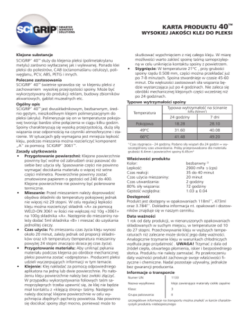 KARTA PRODUKTU 40™ WYSOKIEJ JAKOŚCI KLEJ DO PLEKSI Klejone substancje SCIGRIP® 40™ służy do klejenia pleksi (polimetakrylanu metylu) zarówno wytłaczanej jak i wylewanej. Ponado klei pleksi do poliestrów, CAB (octanomaślanu celulozy), poliwęglanu, PCV, ABS, PETG i innych. Polecane zastosowania SCIGRIP® 40™ świetnie sprawdza się w klejeniu pleksi z zachowaniem wysokiej przejrzystości spoiny. Może być wykorzystywany do produkcji reklam, budowy zbiorników akwariowych, gablot muzealnych etc. Ogólny opis SCIGRIP® 40™ jest dwuskładnikowym, bezbarwnym, średnio gęstym, nieszkodliwym klejem polimeryzacyjnym do pleksi (akrylu). Polimeryzuje się on w temperaturze pokojowej tworząc bardzo silne połączenia w ciągu kilku godzin. Spoiny charakteryzują się wysoką przejrzystością, dużą siłą wiązania oraz odpornością na czynniki atmosferyczne i starzenie. W sytuacjach gdy wymagana jest mniejsza lepkość kleju, podczas mieszania można rozcieńczyć komponent „A” za pomocą SCIGRIP® 3061™. Zasady użytkowania • Przygotowanie powierzchni: Klejone powierzchnie powinny być wolne od zabrudzeń oraz pasować do siebie bez użycia siły. Spasowanie części nie powinno wymagać dociskania materiału o więcej niż setne części milimetra. Powierzchnie powinny zostać zmatowione papierem o gęstości od 240 do 400. Klejone powierzchnie nie powinny być polerowane termicznie. • Mieszanie: Przed mieszaniem należy doprowadzić obydwa składniki do temperatury pokojowej jednak nie więcej niż 29 stopni. W celu regulacji lepkości kleju można rozcieńczyć składnik «A» za pomocą WELD-ON 3061 w ilości nie większej niż 10g «3061» na 100g składnika «A». Następnie do mieszaniny należy dodać 5ml składnika «B» i mieszać do uzyskania jednolitej cieczy. • Czas użycia: Po zmieszaniu czas życia kleju wynosi około 20 minut, zależy jednak od proporcji składników oraz ich temperatury (temperatura mieszaniny powyżej 24 stopni znacząco skraca jej czas życia). • Przygotowanie materiału: Aby uniknąć pękania materiału podczas klejenia po obróbce mechanicznej pleksi powinna zostać «odprężona». Producent pleksi udzieli wyczerpujących informacji w tym temacie. • Klejenie: Klej nakładać za pomocą odpowiedniego aplikatora na jedną lub dwie powierzchnie. Po nałożeniu kleju powierzchnie należy bez zwłoki złączyć. W przypadku wykorzystywania foliowych taśm samoprzylepnych trzeba upewnić się, że klej nie będzie miał kontaktu z «klejącą stroną» taśmy. Następnie należy docisnąć klejone powierzchnie w celu wypchnięcia zbędnych pęcherzy powietrza. Nie powinno się dociskać spoiny zbyt mocno, ponieważ może to skutkować wypchnięciem z niej całego kleju. W miarę możliwości warto zakleić spoinę taśmą samoprzylepną w celu uniknięcia kontaktu spoiny z powietrzem. • Stygnięcie: W temperaturze 21°C , przy grubości spoiny rzędu 0.508 mm, części można przekładać już po 7-8 minutach. Spoina stwardnieje w czasie 45-60 minut. Dla większości zastosowań siła wiązania będzie wystarczająca już po 4 godzinach. Nie zaleca się obróbki mechanicznej klejonych części wcześniej niż po 24 godzinach. Typowe wytrzymałości spoiny Typowa wytrzymałość na ścinanie MPa (N/mm2) Temperatura 24 godziny 7 dni Pokojowa 18.28 28.10 49°C 31.60 40.08 66°C 41.48 49.20 !) Czas stygnięcia - 24 godziny. Podano siły wiązań dla 24 godzin + wyszczególnony czas utwardzania. Próby przeprowadzano dla materiału grubości 6.4mm i powierzchni spoiny 6.45cm2. Właściwości produktu Kolor: bezbarwny 2) Lepkość: 2900 mPa . s (cps) Czas reakcji: 35 do 40 minut Czas użycia mieszaniny: 20 minut Czas utwardzania: 2 godziny 80% siły wiązania: 72 godziny Gęstość względna: 1.03 ± 0.04 Dostępność Produkt jest dostępny w opakowaniach 118ml**, 473ml oraz 3.784l**. Dokładna informacja nt. opakowań i dozowników znajduje się w naszym cenniku. Data ważności 1 rok od daty produkcji, w nienaruszonych opakowaniach składowanych w suchym miejscu, w temperaturze od 10 do 27 stopni. Przechowywanie kleju w wyższych temperaturach niż zalecane może skrócić jego datę ważności. Analogicznie trzymanie kleju w warunkach chłodniczych wydłuża jego przydatność . UWAGA! Trzymać z dala od źródeł ciepła, otwartego płomienia, iskier i bezpośredniego słońca. Produktu nie należy zamrażać. Po przekroczeniu daty ważności produkt zachowuje swoje właściwości fizyczne i chemiczne. Nadal pozostaje używalny, jednakże bez gwarancji producenta. Informacje o transporcie Numer UN: 1133 Nazwa wysyłkowa: kleje zawierające materiały ciekłe zapalne Klasa: 3 Grupa pakowania: II szczegółowe informacje na transportu można znaleźć w karcie charakterystyki produktu niebezpiecznego