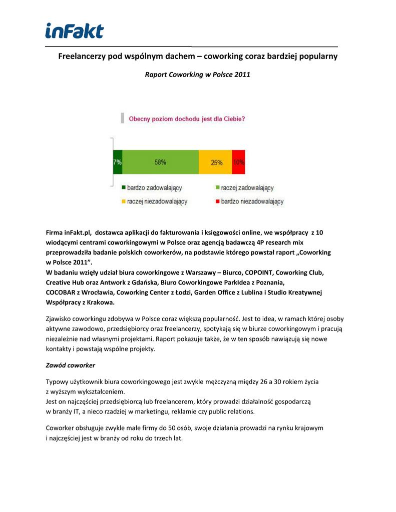 Freelancerzy pod wspólnym dachem – coworking coraz bardziej popularny Raport Coworking w Polsce 2011 Firma inFakt.pl, dostawca aplikacji do fakturowania i księgowości online, we współpracy z 10 wiodącymi centrami coworkingowymi w Polsce oraz agencją badawczą 4P research mix przeprowadziła badanie polskich coworkerów, na podstawie którego powstał raport „Coworking w Polsce 2011”. W badaniu wzięły udział biura coworkingowe z Warszawy – Biurco, COPOINT, Coworking Club, Creative Hub oraz Antwork z Gdańska, Biuro Coworkingowe ParkIdea z Poznania, COCOBAR z Wrocławia, Coworking Center z Łodzi, Garden Office z Lublina i Studio Kreatywnej Współpracy z Krakowa. Zjawisko coworkingu zdobywa w Polsce coraz większą popularność. Jest to idea, w ramach której osoby aktywne zawodowo, przedsiębiorcy oraz freelancerzy, spotykają się w biurze coworkingowym i pracują niezależnie nad własnymi projektami. Raport pokazuje także, że w ten sposób nawiązują się nowe kontakty i powstają wspólne projekty. Zawód coworker Typowy użytkownik biura coworkingowego jest zwykle mężczyzną między 26 a 30 rokiem życia z wyższym wykształceniem. Jest on najczęściej przedsiębiorcą lub freelancerem, który prowadzi działalność gospodarczą w branży IT, a nieco rzadziej w marketingu, reklamie czy public relations. Coworker obsługuje zwykle małe firmy do 50 osób, swoje działania prowadzi na rynku krajowym i najczęściej jest w branży od roku do trzech lat. Coworking sposobem na pracę Aż 71% pytanych, jako główny powód skorzystania z biura coworkingowego wymienia chęć oddzielenia pracy od życia prywatnego. Najczęściej wymienianą zaletą biura jest możliwość wymiany doświadczeń zawodowych z innymi użytkownikami ,twórcza atmosfera pracy oraz nawiązywanie nowych kontaktów. Istotny dla coworkerów jest także niski koszt wynajmu powierzchni biurowej oraz satysfakcjonujące warunki do spotkań biznesowych. Moda na coworking jest stosunkowo nowa - ponad 60% respondentów korzysta z biura coworkingowego od pół roku do roku, najczęściej codziennie lub kilka razy w tygodniu. Ponad połowa coworkerów posiada wykupiony miesięczny abonament (59%), a pozostali wynajmują biurko na godziny, korzystają z sal konferencyjnych czy urządzeń biurowych. Licz na siebie Większość coworkerów jest zadowolonych ze swojego obecnego dochodu ( 65%). Jako średni miesięczny dochód ze wszystkich prowadzonych działalności najczęściej wskazywali oni przedział powyżej 4 000 do 6 000 zł netto, a niewiele mniej ankietowanych zarabia od 6 000 do 8 500 zł netto miesięcznie. Polskich coworkerów cechuje też duży optymizm co do przyszłości - aż 72% z nich prognozuje wzrost dochodu w ciągu najbliższego roku. Główne przeszkody w prowadzeniu firmy coworkerzy upatrują w biurokracji i konieczności samodzielnego pozyskiwania zleceń, a ich największe koszty generuje ZUS oraz podatki. Mimo, że większość coworkerów zatrudnia obecnie biuro rachunkowe do prowadzenia księgowości to aż 30% z nich rozważa wprowadzenie aplikacji internetowej do samodzielnego prowadzenia księgowości. „ Celem naszego badania było poznanie specyfiki polskiego coworkingu oraz popularyzacji tego zjawiska. Do naszej inicjatywy przyłączyło się 10 biur - z Krakowa, Gdańska, Warszawy, Poznania, Wrocławia, Łodzi i Lublina, dzięki którym udało się przeprowadzić badanie i opracować raport. Wnioski z badania są bardzo interesujące. Okazuje się, że coworking to doskonała okazja do nawiązywania nowych kontaktów oraz wymiany doświadczeń zawodowych. W przypadku osób samodzielnie pozyskujących zlecenia jest to szczególnie ważne. Coworkerzy wyznaczają nowy trend w prowadzeniu biznesu – są nie tylko niezależni, ale i mobilni.” – komentuje Wiktor Sarota, prezes inFakt.pl, dostawcy aplikacji do fakturowania i księgowości online. Badanie przeprowadzone zostało metodą wywiadów internetowych (CAWI); uzyskano 96 ankiet. Czas realizacji badania: Listopad 2010 - Marzec 2011. Kontakt Prasowy www.infakt.pl/biuro_prasowe O INFAKT INFAKT jest twórcą aplikacji do wystawiania faktur i prowadzenia księgowości online dla freelancerów, samozatrudnionych oraz mikro i małych firm www.infakt.pl. Z serwisu www.infakt.pl korzysta obecnie 120 000 użytkowników. Więcej na www.infakt.pl