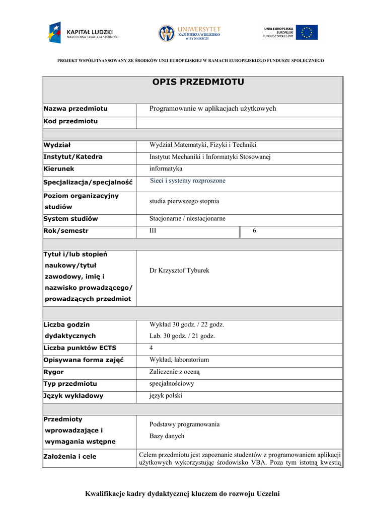 PROJEKT WSPÓŁFINANSOWANY ZE ŚRODKÓW UNII EUROPEJSKIEJ W RAMACH EUROPEJSKIEGO FUNDUSZU SPOŁECZNEGO OPIS PRZEDMIOTU Nazwa przedmiotu Programowanie w aplikacjach użytkowych Kod przedmiotu Wydział Wydział Matematyki, Fizyki i Techniki Instytut/Katedra Instytut Mechaniki i Informatyki Stosowanej Kierunek informatyka Specjalizacja/specjalność Sieci i systemy rozproszone Poziom organizacyjny studiów studia pierwszego stopnia System studiów Stacjonarne / niestacjonarne Rok/semestr III 6 Tytuł i/lub stopień naukowy/tytuł zawodowy, imię i Dr Krzysztof Tyburek nazwisko prowadzącego/ prowadzących przedmiot Liczba godzin Wykład 30 godz. / 22 godz. dydaktycznych Lab. 30 godz. / 21 godz. Liczba punktów ECTS 4 Opisywana forma zajęć Wykład, laboratorium Rygor Zaliczenie z oceną Typ przedmiotu specjalnościowy Język wykładowy język polski Przedmioty wprowadzające i wymagania wstępne Założenia i cele Podstawy programowania Bazy danych Celem przedmiotu jest zapoznanie studentów z programowaniem aplikacji użytkowych wykorzystując środowisko VBA. Poza tym istotną kwestią Kwalifikacje kadry dydaktycznej kluczem do rozwoju Uczelni PROJEKT WSPÓŁFINANSOWANY ZE ŚRODKÓW UNII EUROPEJSKIEJ W RAMACH EUROPEJSKIEGO FUNDUSZU SPOŁECZNEGO przedmiotu (w formie efektów kształcenia) Treści programowe przedmiotu jest wprowadzenie do technologii WIKI oraz WORDPRESS. Głownym dążeniem w trakcie realizacji przedmiotu jest projektowanie oraz implementacja aplikacji użytkowych dedykowanych konkretnym rozwiązaniom (np. aplikacje menadżerskie zarządzające czasem pracy) wykorzystując do tego celu dostępne aplikacje współpracujące z językiem programowania VBA. Ponadto w trakcie realizacji przedmiotu zostaną uwzględnione zagadnienia sieciowe (architektura klient-server) mające na celu wskazanie możliwości współpracy stworzonych aplikacji z serwerem baz danych (MySQL). Ważnym elementem przedmiotu będzie wykorzystanie interfejsu ODBC (Open DataBase Connectivity), jako mechanizmu pozwalającego stworzonym programom łączyć się z dowolnym systemem zarządzania bazami danych (również MySQL). Założeniem przedmiotu jest praktyczna nauka programowania i wyżej wymienionych technologii w stopniu wystarczającym do realizacji samodzielnych projektów przez osoby, które taki ukończą niniejszy przedmiot. Zakres obejmuje: 1. Programowanie w języku VBA 2. integrację baz danych z aplikacjami klienckimi bazującym na programach użytkowych 3. Modelowanie i implementacja baz danych 4. Umiejętność wykorzystania technologii WIKI oraz WORDPRESS Metody dydaktyczne Forma i warunki zaliczenia przedmiotu – wymagania i system Wykład jest realizowany przy pomocy audiowizualnych środków nauczania (w postaci projektora multimedialnego), podczas którego prezentowane są slajdy przedstawiające treść przedmiotu. Prowadzący w trakcie wykładu przedstawia kluczowe zagadnienia niezbędne do realizacji oprogramowania fuzytowego. Przedstawiane są listingi kodu źródłowego VBA oraz różne sposoby realizacji konkretnego zagadnienia. Wskazane są również krótkie ćwiczenia do samodzielnej realizacji przez studentów. Spośród wszystkich zaproponowanych przez studentów rozwiązań wybierane są najlepsze i szczegółowo omawiane. W trakcie ćwiczeń studenci są wprowadzani do konkretnych zagadnień (np. metodologia programowania, w VBA) oraz są zaproponowane najkorzystniejsze z punktu widzenia optymalizacji rozwiązania. Ponadto zostają zaprezentowane kody programu wraz z ich bardzo szczegółowym komentarzem. Do celów realizacji ćwiczeń wykorzystane zostaną aplikacje użytkowe MS Office oraz MySql Wykład: egzamin pisemny. Laboratorium: 1. Zaliczenie z oceną na podstawie praktycznego zaliczenia kolokwium 2. Pozytywne wykonanie projektu.. oceniania Literatura podstawowa Charles E. Brown „Access. Programowanie w VBA” Helion ISBN: 83-7361-807-4 Michael Alexander "Microsoft Access. Przewodnik dla użytkowników Excela" Helion ISBN: 978-83-246-2847-6 Kwalifikacje kadry dydaktycznej kluczem do rozwoju Uczelni PROJEKT WSPÓŁFINANSOWANY ZE ŚRODKÓW UNII EUROPEJSKIEJ W RAMACH EUROPEJSKIEGO FUNDUSZU SPOŁECZNEGO Larry Ullman "MySQL. Szybki start" Helion ISBN: 83-7361040-5 Marcin Lis "MySQL. Darmowa baza danych. Ćwiczenia praktyczne" Helion ISBN: 83-246-0600-9 Literatura uzupełniająca (w tym portale internetowe) ..................................................... data Marcin Lis "SQL. Ćwiczenia praktyczne. Wydanie II" Helion ISBN: 978-83-246-3051-6 Mary Jackson, Mike Staunton "Zaawansowane modele finansowe z wykorzystaniem Excela i VBA"Helion ISBN: 837361-340-4 http://www.theofficeexperts.com/officevba.htm http://dev.mysql.com/doc/refman/5.6/en/sql-syntax.html ......................................................................................................................................... podpis prowadzącego przedmiot/ koordynatora przedmiotu* Kwalifikacje kadry dydaktycznej kluczem do rozwoju Uczelni PROJEKT WSPÓŁFINANSOWANY ZE ŚRODKÓW UNII EUROPEJSKIEJ W RAMACH EUROPEJSKIEGO FUNDUSZU SPOŁECZNEGO PROGRAM NAUCZANIA PRZEDMIOTU Nazwa przedmiotu Opisywana forma zajęć Liczba godzin dydaktycznych Programowanie aplikacji użytkowych Wykład 30 godzin / 22 godzin Tytuł i/lub stopień naukowy/tytuł zawodowy, imię i Dr Krzysztof Tyburek nazwisko prowadzącego Szczegółowa tematyka zajęć W ramach wykładów są omawiane następujące zagadnienia: 1. Ogólne pojęcia związane z językiem VBA i jego zastosowaniem w aplikacjach użytkowych. 2. Bezpieczeństwo kodu VBA oraz interfejs Microsoft Visual Basic. Omówienie Project Explorer, okno kodu oraz operacje na modułach. 3. 4. 5. 6. 7. 8. Omówienie podstaw składni języka VBA – definiowanie zmiennych o różnym zasięgu, definiowanie procedur, instrukcje iteracyjne, warunkowe, wyboru oraz tworzenie funkcji. Szczegółowe omówienie funkcji MsgBox oraz InputBox Tworzenie własnych formularzy w VBA (wykor