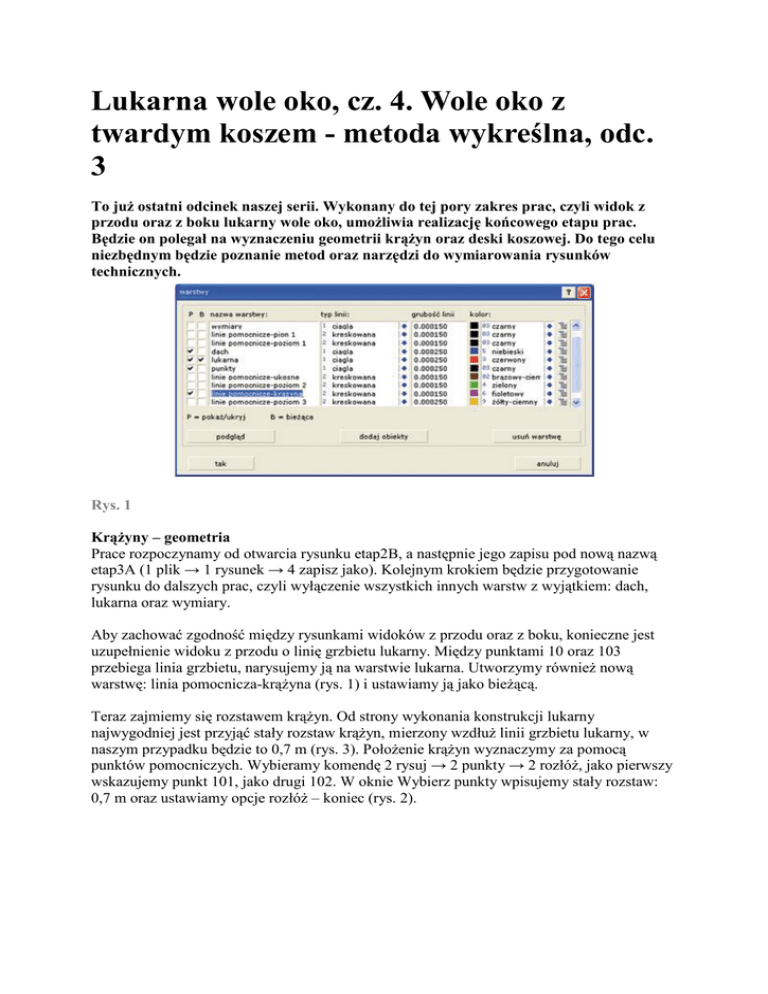 Lukarna wole oko, cz. 4. Wole oko z twardym koszem - metoda wykreślna, odc. 3 To już ostatni odcinek naszej serii. Wykonany do tej pory zakres prac, czyli widok z przodu oraz z boku lukarny wole oko, umożliwia realizację końcowego etapu prac. Będzie on polegał na wyznaczeniu geometrii krążyn oraz deski koszowej. Do tego celu niezbędnym będzie poznanie metod oraz narzędzi do wymiarowania rysunków technicznych. Rys. 1 Krążyny – geometria Prace rozpoczynamy od otwarcia rysunku etap2B, a następnie jego zapisu pod nową nazwą etap3A (1 plik → 1 rysunek → 4 zapisz jako). Kolejnym krokiem będzie przygotowanie rysunku do dalszych prac, czyli wyłączenie wszystkich innych warstw z wyjątkiem: dach, lukarna oraz wymiary. Aby zachować zgodność między rysunkami widoków z przodu oraz z boku, konieczne jest uzupełnienie widoku z przodu o linię grzbietu lukarny. Między punktami 10 oraz 103 przebiega linia grzbietu, narysujemy ją na warstwie lukarna. Utworzymy również nową warstwę: linia pomocnicza-krążyna (rys. 1) i ustawiamy ją jako bieżącą. Teraz zajmiemy się rozstawem krążyn. Od strony wykonania konstrukcji lukarny najwygodniej jest przyjąć stały rozstaw krążyn, mierzony wzdłuż linii grzbietu lukarny, w naszym przypadku będzie to 0,7 m (rys. 3). Położenie krążyn wyznaczymy za pomocą punktów pomocniczych. Wybieramy komendę 2 rysuj → 2 punkty → 2 rozłóż, jako pierwszy wskazujemy punkt 101, jako drugi 102. W oknie Wybierz punkty wpisujemy stały rozstaw: 0,7 m oraz ustawiamy opcje rozłóż – koniec (rys. 2). Rys. 2 Nowe punkty opisujemy odpowiednio K1-10 oraz K2-10 (rys. 3). Przez nowe punkty kreślimy pionowe linie, będą one reprezentowały krążyny K1 oraz K2. Podpowiedź: zamiast rysować, wygodniej jest skopiować dwa razy pionową linię deski czołowej. Linie krążyn są za długie i wystają poniżej połaci. Przytniemy je komendą 3 edycja → 5 przytnij, elementem granicznym jest linia połaci. Po wskazaniu końców linii krążyn poniżej połaci, linie zostaną docięte; nowe punkty oznaczamy odpowiednio K1-20 oraz K2-20. Na widoku z boku mamy już gotowe krążyny. Teraz wyznaczymy położenie i gabaryty krążyn na widoku z przodu (rys. 3). Ustawiamy jako bieżącą warstwę linia pomocnicza-krążyna. Z punktu K1-20 kreślimy poziomą linię do przecięcia z linią kosza i oznaczamy punkt K1-21. Drugą linię pomocniczą kreślimy z punktu K1-10 do przecięcia z linią grzbietu lukarny; nowy punkt otrzymuje oznaczenie K1-11 (rys. 3). Rys. 3 W kolejnym etapie prac wykorzystamy jedną z podstawowych zasad obowiązujących przy budowie lukarny wole oko z twardym koszem. Kształt wszystkich krążyn jest jednakowy, a poszczególne krążyny różnią się jedynie wysokością. Dlatego możemy wykorzystać kształt deski czołowej i na jej podstawie zbudować kolejne krążyny. Kopiujemy deskę czołową (rys. 4), jako punkt bazowy wybierając punkt 10, punktem docelowym będzie najwyższy punkt krążyny K1-11. Łuki krążyny są zbyt długie, wystają poza kosz, dlatego należy je dociąć do linii kosza. Po wykonaniu tej operacji pierwsza krążyna K1 jest gotowa. Wykonanie kolejnej krążyny K2 będzie stanowiło zadanie do samodzielnego wykonania. Rys. 4 Wymiarowanie rysunku W rysunku technicznym linie wymiarowe stanowią kluczowy element obok treści rysunku. Dzięki nim można przenieść treść rysunku na rzeczywiste obiekty. Przed przystąpieniem do wymiarowania czegokolwiek dobrze jest poznać podstawowe sposoby wymiarowania i ich zastosowanie. W budownictwie wymiaruje się wielkości liniowe, kątowe, promienie i średnice. Wśród wymiarów liniowych należy wyróżnić wymiary od bazy oraz szeregowe. Wymiary od bazy posiadają punkt początkowy, od którego odmierzane są wszystkie odległości. Z kolei wymiar szeregowy podaje bezpośrednie odległości między punktami na linii wymiarowej. Programy CAD zawsze mają do dyspozycji cały szereg funkcji wymiarowych, z których za każdym razem możemy wybrać tą, która nam odpowiada. Standardowo przy wymiarowaniu odcinków mamy do wyboru wymiarowanie poziome, pionowe i ukośne dla odcinków, które są pod kątem. Wszystkie funkcje, które dotyczą wymiarowania znajdują się w menu w sekcji wymiary. Wymiarowanie konstrukcji rozpoczniemy od definicji własnego stylu wymiarowego. Styl wymiarowania określa wygląd linii wymiarowej: czcionkę, jednostkę oraz dokładność wymiaru, itd. Komenda 5 wymiary → 1 styl wymiarowania otwiera okno Styl wymiarowania do definicji i zarządzania stylami wymiarowania. Stwórzmy teraz nowy styl wymiarowania. Naciskamy przycisk NOWY, następnie w polu nazwa wpisujemy naszą nazwę D-wymiary, wielkość czcionki ustawiamy na 0,0015. Aby wymiarować według nowego stylu, należy ustawić go jak „bieżący”. Po prawej stronie przy nazwie D-wymiary stawiamy „ptaszka”. Funkcje wymiarowania są bardzo ważne, dlatego powinny być systematycznie używane. Deska koszowa – geometria Do wyznaczania geometrii deski koszowej konieczne będzie wykonanie widoku prostopadłego do połaci dachowej. Na początku pomierzymy odległości między punktami linii kosza (01, 12, 22 itd.) na widoku z boku (rys. 5). Do tego celu wykorzystamy funkcję wymiarowania 5 wymiary → 2 wymiary → 8 ukośnie od bazy. Wymiarowanie rozpoczniemy od najwyższego punktu deski koszowej 102 przyjmując go jako punkt bazowy, następnie wskazujemy kolejne punkty na desce koszowej, kończąc na punkcie 01. Prawym przyciskiem myszy kończymy wymiarowanie i wykazujemy położenie linii wymiarowej (rys. 5). Widok prostopadły do połaci narysujemy poniżej widoku z przodu (rys. 6), umożliwi to nam wykorzystanie istniejących pionowych linii pomocniczych oraz klarowny przegląd zależności między punktami. Włączamy warstwę linie pomocnicze-pion 1 i zapisujemy ją jako bieżącą. Z punktu 0 po prawej stronie kreślimy pionową linię w dół o dług