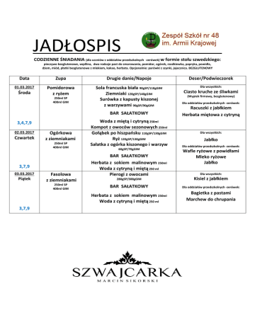 JADŁOSPIS CODZIENNE ŚNIADANIA (dla uczniów z oddziałów przedszkolnych -zerówek) w formie stołu szwedzkiego: pieczywo bezglutenowe, wędlina, dwa rodzaje past do smarowania, pomidor, ogórek, rzodkiewka, papryka, powidła, dżem, miód, płatki bezglutenowe z mlekiem, kakao, herbata. Opcjonalnie: parówki z szynki, jajecznica. BEZGLUTENOWY Data Zupa Drugie danie/Napoje 01.03.2017 Pomidorowa z ryżem Sola francuska biała 90gSP/110gGIM Ziemniaki 120gSP/140gGIM Surówka z kapusty kiszonej z warzywami 90gSP/90gGIM Środa 250ml SP 400ml GIM BAR SAŁATKOWY 3,4,7,9 02.03.2017 Czwartek Ogórkowa z ziemniakami 250ml SP 400ml GIM 3,7,9 03.03.2017 Piątek Fasolowa z ziemniakami 250ml SP 400ml GIM Woda z miętą i cytryną 250ml Kompot z owoców sezonowych 250ml Gołąbek po hiszpańsku 110gSP/130gGIM Ryż 120gSP/130gGIM Sałatka z ogórka kiszonego i warzyw 60gSP/70gGIM BAR SAŁATKOWY Herbata z sokiem malinowym 250ml Woda z cytryną i miętą 250 ml Pierogi z owocami Dla wszystkich: Ciasto kruche ze śliwkami (Wypiek firmowy, bezglutenowy) Dla oddziałów przedszkolnych -zerówek: Racuszki z jabłkiem Herbata miętowa z cytryną Dla wszystkich: Jabłko Dla oddziałów przedszkolnych -zerówek: Wafle ryżowe z powidłami Mleko ryżowe Jabłko Dla wszystkich: 280gSP/300gGIM Kisiel z jabłkiem BAR SAŁATKOWY Dla oddziałów przedszkolnych -zerówek: Herbata z sokiem malinowym 250ml Woda z cytryną i miętą 250 ml 3,7,9 Deser/Podwieczorek Bagietka z pastami Marchew do chrupania JADŁOSPIS CODZIENNE ŚNIADANIA (dla uczniów z oddziałów przedszkolnych -zerówek) w formie stołu szwedzkiego: pieczywo bezglutenowe, wędlina, dwa rodzaje past do smarowania, pomidor, ogórek, rzodkiewka, papryka, powidła, dżem, miód, płatki bezglutenowe z mlekiem, kakao, herbata. Opcjonalnie: parówki z szynki, jajecznica. BEZGLUTENOWY Data Zupa 06.03.2017 Barszcz Poniedziałek czerwony z ziemniakami 250ml SP 400ml GIM 3,7,9 07.03.2017 Wtorek Krem z warzyw 250ml SP 400ml GIM 3,7,9 08.03.2017 Środa Tradycyjna ogórkowa 250ml SP 400ml GIM Drugie danie/Napoje Deser/Podwieczorek Pyzy z mięsem i delikatną okrasą Dla wszystkich: 280gSP/300gGIM Mandarynka Surówka z czerwonej kapusty i jogurtem Dla oddziałów przedszkolnych -zerówek: 60gSP/70gGIM Jabłko pieczone z miodem BAR SAŁATKOWY Woda z miętą i cytryną 250ml Lemoniada z pomarańczami 250 m Kotlet schabowy 90gSP/100gGIM Puree ziemniaczane 120gSP/130gGIM Bukiet warzyw gotowanych na parze 60gSP/70gGIM BAR SAŁATKOWY Woda z miętą i cytryną 250ml Kompot z owoców sezonowych 250ml Sznycelki w sosie własnym 90gSP/100gGIM Kasza gryczana 100gSP/110gGIM Buraczki zasmażane na masełku 70gSP/80gGIM BAR SAŁATKOWY 3,7,9 09.03.2017 Czwartek Kapuśniaczek z ziemniakami 250ml SP 400ml GIM 3,7,9 10.03.2017 Piątek Rosół z makaronem 250ml SP 400ml GIM Woda z miętą i cytryną 250ml Kompot z owoców sezonowych 250ml Spaghetti bolognese z serem żółtym 280gSP/300gGIM Ogórek kiszony 60gSP/70gGIM BAR SAŁATKOWY Woda z miętą i cytryną 250ml Kompot z owoców sezonowych 250ml Filet z soli francuskiej 90gSP/100gGIM Ziemniaki 120gSP/130gGIM Surówka z kapusty kiszonej 90gSP/90gGIM BAR SAŁATKOWY 3,4,7,9 Woda z miętą i cytryną 250ml Kompot z owoców sezonowych 250ml Dla wszystkich: Ciasto marchewkowe (Wypiek firmowy, bezglutenowy) Dla oddziałów przedszkolnych -zerówek: Jogurt naturalny ze świeżymi owocami Bagietka z masłem Dla wszystkich: Jabłko Dla oddziałów przedszkolnych -zerówek: Ciasteczka bezglutenowe Herbatka Dla wszystkich: Kisiel z owocami Dla oddziałów przedszkolnych- zerówek: Bułeczka z serem i chudą wędliną Herbatka z cytryną Dla wszystkich: Ciasto piaskowe (Wypiek firmowy, bezglutenowy) Dla oddziałów przedszkolnych- zerówek: Kisiel z jabłkiem Banan JADŁOSPIS CODZIENNE ŚNIADANIA (dla uczniów z oddziałów przedszkolnych -zerówek) w formie stołu szwedzkiego: pieczywo bezglutenowe, wędlina, dwa rodzaje past do smarowania, pomidor, ogórek, rzodkiewka, papryka, powidła, dżem, miód, płatki bezglutenowe z mlekiem, kakao, herbata. Opcjonalnie: parówki z szynki, jajecznica. BEZGLUTENOWY Data Zupa Drugie danie/Napoje Deser/Podwieczorek 13.03.2017 Krem z selera Makaron z delikatnym serkiem i polewą truskawkową 280gSP/300gGIM Mandarynka Poniedziałek 250ml SP 400ml GIM 3,7,9 14.03.2017 Wtorek Barszcz biały na wędzonce z ziemniakami 250ml SP 400ml GIM 3,7,9 15.03.2017 Środa Jarzynowa z ziemniakami 250ml SP 400ml GIM 16.03.2017 Czwartek Grochowa z ziemniakami 250ml SP 400ml GIM Dla oddziałów przedszkolnych- zerówek BAR SAŁATKOWY Woda z miętą i cytryną 250ml Kompot z owoców sezonowych 250ml Jogurt naturalny ze owocami Bagietka z masłem Herbata z cytryną Kotlet mielony w chrupiącej panierce 90gSP/100gGIM Ziemniaki 120gSP/130gGIM Buraczki na ciepło 70gSP/80gGIM BAR SAŁATKOWY Dla wszystkich: Woda z miętą i cytryną 250ml Kompot z owoców sezonowych 250ml Gulasz domowy z mięskiem i warzywami 110gSP/120gGIM Kasza gryczana ekologiczna 90gSP/100gGIM Marchew gotowana na parze 70gSP/80gGIM BAR SAŁATKOWY 3,7,9 Dla wszystkich: Woda z miętą i cytryną 250ml Kompot z owoców sezonowych 250ml Kotlet schabowy 90gSP/100gGIM Ziemniaki 120gSP/130gGIM Surówka z kapusty białej jogurtem i warzywami 70gSP/80gGIM Ciasto biszkoptowe z owocami (Wypiek firmowy, bezglutenowy) Dla oddziałów przedszkolnych- zerówek: Sałatka tęczowa z owocami i jogurtem Dla wszystkich: Jabłko Dla oddziałów przedszkolnych -zerówek: Placuszki podane z musem malinowym Herbata Dla wszystkich: Budyń pitny Dla oddziałów przedszkolnych -zerówek: Jabłko pieczone z miodem BAR SAŁATKOWY 3,7,9 17.03.2017 Piątek Pomidorowa z makaronem 250ml SP 400ml GIM 3,4,7,9 Woda z miętą i cytryną 250ml Kompot z owoców sezonowych 250ml Sola francuska biała 90gSP/100gGIM Ziemniaki 120gSP/130gGIM Surówka z kapusty kiszonej z warzywami Dla wszystkich: Kisiel z owocami Dla oddziałów przedszkolnych -zerówek: 90gSP/90gGIM Tosty z serem i szynką BAR SAŁATKOW