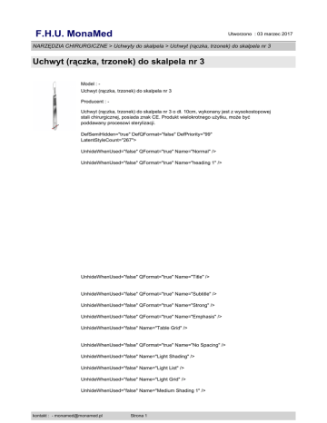F.H.U. MonaMed Utworzono : 03 marzec 2017 NARZĘDZIA CHIRURGICZNE > Uchwyty do skalpela > Uchwyt (rączka, trzonek) do skalpela nr 3 Uchwyt (rączka, trzonek) do skalpela nr 3 Model : Uchwyt (rączka, trzonek) do skalpela nr 3 Producent : Uchwyt (rączka, trzonek) do skalpela nr 3 o dł. 10cm, wykonany jest z wysokostopowej stali chirurgicznej, posiada znak CE. Produkt wielokrotnego użytku, może być poddawany procesowi sterylizacji. DefSemiHidden="true" DefQFormat="false" DefPriority="99" LatentStyleCount="267"> UnhideWhenUsed="false" QFormat="true" Name="Normal" /> UnhideWhenUsed="false" QFormat="true" Name="heading 1" /> UnhideWhenUsed="false" QFormat="true" Name="Title" /> UnhideWhenUsed="false" QFormat="true" Name="Subtitle" /> UnhideWhenUsed="false" QFormat="true" Name="Strong" /> UnhideWhenUsed="false" QFormat="true" Name="Emphasis" /> UnhideWhenUsed="false" Name="Table Grid" /> UnhideWhenUsed="false" QFormat="true" Name="No Spacing" /> UnhideWhenUsed="false" Name="Light Shading" /> UnhideWhenUsed="false" Name="Light List" /> UnhideWhenUsed="false" Name="Light Grid" /> UnhideWhenUsed="false" Name="Medium Shading 1" /> kontakt : - [email protected] Strona 1 F.H.U. MonaMed Utworzono : 03 marzec 2017 NARZĘDZIA CHIRURGICZNE > Uchwyty do skalpela > Uchwyt (rączka, trzonek) do skalpela nr 3 Uchwyt (rączka, trzonek) do skalpela nr 3 UnhideWhenUsed="false" Name="Medium Shading 2" /> UnhideWhenUsed="false" Name="Medium List 1" /> UnhideWhenUsed="false" Name="Medium List 2" /> UnhideWhenUsed="false" Name="Medium Grid 1" /> UnhideWhenUsed="false" Name="Medium Grid 2" /> UnhideWhenUsed="false" Name="Medium Grid 3" /> UnhideWhenUsed="false" Name="Dark List" /> UnhideWhenUsed="false" Name="Colorful Shading" /> UnhideWhenUsed="false" Name="Colorful List" /> UnhideWhenUsed="false" Name="Colorful Grid" /> UnhideWhenUsed="false" Name="Light Shading Accent 1" /> UnhideWhenUsed="false" Name="Light List Accent 1" /> UnhideWhenUsed="false" Name="Light Grid Accent 1" /> UnhideWhenUsed="false" Name="Medium Shading 1 Accent 1" /> UnhideWhenUsed="false" Name="Medium Shading 2 Accent 1" /> UnhideWhenUsed="false" Name="Medium List 1 Accent 1" /> UnhideWhenUsed="false" QFormat="true" Name="List Paragraph" /> UnhideWhenUsed="false" QFormat="true" Name="Quote" /> UnhideWhenUsed="false" QFormat="true" Name="Intense Quote" /> UnhideWhenUsed="false" Name="Medium List 2 Accent 1" /> UnhideWhenUsed="false" Name="Medium Grid 1 Accent 1" /> UnhideWhenUsed="false" Name="Medium Grid 2 Accent 1" /> UnhideWhenUsed="false" Name="Medium Grid 3 Accent 1" /> UnhideWhenUsed="false" Name="Dark List Accent 1" /> UnhideWhenUsed="false" Name="Colorful Shading Accent 1" /> UnhideWhenUsed="false" Name="Colorful List Accent 1" /> UnhideWhenUsed="false" Name="Colorful Grid Accent 1" /> kontakt : - [email protected] Strona 2 F.H.U. MonaMed Utworzono : 03 marzec 2017 NARZĘDZIA CHIRURGICZNE > Uchwyty do skalpela > Uchwyt (rączka, trzonek) do skalpela nr 3 Uchwyt (rączka, trzonek) do skalpela nr 3 UnhideWhenUsed="false" Name="Light Shading Accent 2" /> UnhideWhenUsed="false" Name="Light List Accent 2" /> UnhideWhenUsed="false" Name="Light Grid Accent 2" /> UnhideWhenUsed="false" Name="Medium Shading 1 Accent 2" /> UnhideWhenUsed="false" Name="Medium Shading 2 Accent 2" /> UnhideWhenUsed="false" Name="Medium List 1 Accent 2" /> UnhideWhenUsed="false" Name="Medium List 2 Accent 2" /> UnhideWhenUsed="false" Name="Medium Grid 1 Accent 2" /> UnhideWhenUsed="false" Name="Medium Grid 2 Accent 2" /> UnhideWhenUsed="false" Name="Medium Grid 3 Accent 2" /> UnhideWhenUsed="false" Name="Dark List Accent 2" /> UnhideWhenUsed="false" Name="Colorful Shading Accent 2" /> UnhideWhenUsed="false" Name="Colorful List Accent 2" /> UnhideWhenUsed="false" Name="Colorful Grid Accent 2" /> UnhideWhenUsed="false" Name="Light Shading Accent 3" /> UnhideWhenUsed="false" Name="Light List Accent 3" /> UnhideWhenUsed="false" Name="Light Grid Accent 3" /> UnhideWhenUsed="false" Name="Medium Shading 1 Accent 3" /> UnhideWhenUsed="false" Name="Medium Shading 2 Accent 3" /> UnhideWhenUsed="false" Name="Medium List 1 Accent 3" /> UnhideWhenUsed="false" Name="Medium List 2 Accent 3" /> UnhideWhenUsed="false" Name="Medium Grid 1 Accent 3" /> UnhideWhenUsed="false" Name="Medium Grid 2 Accent 3" /> UnhideWhenUsed="false" Name="Medium Grid 3 Accent 3" /> UnhideWhenUsed="false" Name="Dark List Accent 3" /> UnhideWhenUsed="false" Name="Colorful Shading Accent 3" /> UnhideWhenUsed="false" Name="Colorful List Accent 3" /> kontakt : - [email protected] Strona 3 F.H.U. MonaMed Utworzono : 03 marzec 2017 NARZĘDZIA CHIRURGICZNE > Uchwyty do skalpela > Uchwyt (rączka, trzonek) do skalpela nr 3 Uchwyt (rączka, trzonek) do skalpela nr 3 UnhideWhenUsed="false" Name="Colorful Grid Accent 3" /> UnhideWhenUsed="false" Name="Light Shading Accent 4" /> UnhideWhenUsed="false" Name="Light List Accent 4" /> UnhideWhenUsed="false" Name="Light Grid Accent 4" /> UnhideWhenUsed="false" Name="Medium Shading 1 Accent 4" /> UnhideWhenUsed="false" Name="Medium Shading 2 Accent 4" /> UnhideWhenUsed="false" Name="Medium List 1 Accent 4" /> UnhideWhenUsed="false" Name="Medium List 2 Accent 4" /> UnhideWhenUsed="false" Name="Medium Grid 1 Accent 4" /> UnhideWhenUsed="false" Name="Medium Grid 2 Accent 4" /> UnhideWhenUsed="false" Name="Medium Grid 3 Accent 4" /> UnhideWhenUsed="false" Name="Dark List Accent 4" /> UnhideWhenUsed="false" Name="Colorful Shading Accent 4" /> UnhideWhenUsed="false" Name="Colorful List Accent 4" /> UnhideWhenUsed="false" Name="Colorful Grid Accent 4" /> UnhideWhenUsed="false" Name="Light Shading Accent 5" /> UnhideWhenUsed="false" Name="Light List Accent 5" /> UnhideWhenUsed="false" Name="Light Grid Accent 5" /> UnhideWhenUsed="false" Name="Medium Shading 1 Accent 5" /> UnhideWhenUsed="false" Name="Medium Shading 2 Accent 5" /> UnhideWhenUsed="false" Name="Medium List 1 Accent 5" /> UnhideWhenUsed="false" Name="Medium List 2 Accent 5" /> UnhideWhenUsed="false" Name="Medium