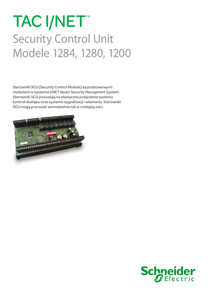 TAC I/NET TM Security Control Unit Modele 1284, 1280, 1200 Sterowniki SCU (Security Control Module) są podstawowymi modułami w systemie I/NET Seven Security Managment System. Sterowniki SCU pozwalają na elastyczne połączenie systemu kontroli dostępu oraz systemu sygnalizacji i włamania. Sterowniki SCU mogą pracować samodzielnie lub w rozległej sieci. 02 TAC I/NET Security Control Unit Modele 1284, 1280, 1200 Opis produktu Dostępne są trzy wersje sterowników SCU. Sterownik SCU 1284 jest sterownikiem drzwiowym do kontrolowania maksymalnie 4 drzwi, monitorowania 12 wejść oraz sterowania 8 wyjściami przekaźnikowymi NC/NO. SCU1280 jest sterownikiem z wejściami/wyjściami posiadający 12 wejść nadzorowanych oraz 8 wyjść przekaźnikowych NC/NO. Sterownik SCU1200 posiada 12 wejść nadzorowanych. CHARAKTERYSTYKA PRODUKTU • Samodzielny sterownik obsługujący do czterech drzwi • Do czterech czytników i czterech drzwi w różnych konfiguracjach • Pamięć flash do łatwej aktualizacji online • Zawiera konfigurację śluzy oraz wejście pod nadzorem • Konfigurowalne dźwięki określające prawidłowy odczyt karty, nieprawidłową kartę i inne rodzaje zdarzeń • Duży bufor alarmowy chroni integralność danych alarmowych • Łatwa instalacja • Dynamiczne zarządzanie pamięcią pozwala na zwiększenie ilości przechowywanych użytkowników lub zdarzeń • Szeroki wybór obudów, opcji baterii, oraz zasilania obniża koszty instalacji Wszystkie modele SCU mogą pracować samodzielnie lub mogą być połączone w rozległą sieć LAN. SCU zezwala na wejście i wyjście ze strefy na podstawie odczytania stanu wejść oraz wykonania programu. Sterownik może monitorować stan rygla, drzwi oraz szeroką gamę innych urządzeń wejściowych takich jak np. czujniki PIR. SCU wraz ze sterownikiem obiektowym zapewnia pełny Anti-Passback oraz wiele innych zaawansowanych funkcji. Alarmy oraz zdarzenia nie są tracone podczas zaniku napięcia i mogą być rozsyłane do wskazanej stacji komputerowej I/NET Seven oraz na drukarkę, generując komunikaty o błędach tak jak zostało to zaprogramowane. SCU może obsługiwać maksymalnie 96,000 lokalnie przechowywanych kart użytkowników. Oprogramowanie SCU, gdy jest to wymagane, można wymienić zdalnie wgrywając odpowiednie pliki binarne ze stacji I/NET Seven. Zalecana obudowa Model ENCLSCU Model ENCLSCU Zalecane transformatory Model XFMR6 (115V) Montowane w obudowie Model XFMR7 (220/240V) ENCLSCU Sterowniki SCU są dostępne w trzech rodzajach zestawów, fabrycznie zamontowane w obudowie UNCLSCU razem z transformatorem oraz opcjonalnie z bateriami - Model na szynie DIN Model TR32 (220/240V) SCU12xxE1 – w obudowie, 115VAC SCU12xxE2 – w obudowie, 115VAC, bateria SCU12xxE3 – w obudowie, 230VAC Patrz SCU Installation Guide (TCON312) Schneider Electric Buildings Polska Sp. z o.o. , ul. Rzymowskiego 53, 02-697 Warszawa, tel.: +48 22 313 24 10, fax: +48 22 313 24 11 www.schneider-electric.com/buildings SDS-INET-SCU-A4.BU.N.EN.2.2006.0.00.CC 03 TAC I/NET Security Control Unit Modele 1284, 1280, 1200 Opis produktu (ciąg dalszy) Wymiary (szkic) Diagram przedstawiający SCU z opcjonalnym zasilaniem, baterią i obudową Schneider Electric Buildings Polska Sp. z o.o. , ul. Rzymowskiego 53, 02-697 Warszawa, tel.: +48 22 313 24 10, fax: +48 22 313 24 11 www.schneider-electric.com/buildings SDS-INET-SCU-A4.BU.N.EN.2.2006.0.00.CC 04 TAC I/NET Security Control Unit Modele 1284, 1280, 1200 Specyfikacja 1284, 1280, 1200 Porty komunikacyjne Specyfikacja sprzętowa Parametry fizyczne Port podsieci LANAN Procesor: Renesas H8S Sterownik na szynę DIN Prędkość: 9,600 Statyczny RAM: 2Mb Protokół: Producenta Pamięć Flash: 1/2Mb Transport Podtrzymanie bateryjne RAM RS485 magistrala asynchroniczna z 2 x baterie akumulatorowe Ni-Mh, odpytywaniem (otwarta lub zamknięta pętla) 30 dniowe podtrzymanie Zegar/Kalendarz Wymiary 216mm x 127mm x 64mm Waga 0.6 Kg Złącza Wyjmowalne bloki złączy Zegar czasu rzeczywistego. Rodzaj obudowy: 1,500m max dla 0.35 mm² Warunki pracy Wymiary 1,200m max dla 0.25 mm² Temperatura Przekrój 0°C do 50°C bez baterii podtrzymującej, 0.35 lub 0.25mm² 10°C do 40°C z bateriami Impedancja: 85 do 150Ω kwasowoołowiowymi Pojemność Wilgotność <100pF/m pomiędzy przewodami i 10-80% RH, bez kondensacji Okablowanie sieci Długość <180pF/m przewód do ekranu Rodzaj kabla Opcje podtrzymania Belden 9184 - 0.35 mm² Typ Belden 9841 - 0.25 mm² Baterie kwasowoołowiowe lub zamiennik - ekranowana para skręcona Pojemność Okablowanie czytników I\DISC 2 ekranowane pary skręcone, maks. 60m Belden 9184 lub 9855 Wiegand 8 żyłowy ekranowany maks. 150m Belden 9536 lub 9537 Wiegand – Prox 8 żyłowy ekranowany, maks. 50-100m (patrz dokumentacja czytnika) Belden 9536 lub 9537 Nema 1 (IP10) Style - wewnętrzna 362mm x 413mm x 108mm Waga Tylko ENCLSCU - 6 kg SCU12xxE1 z Xfmr - 7.5 kg SCU12xxE2 Bat. i Xfmr - 9.3kg Montaż 330mm na szynie DIN (35mm) Górna szyna na SCU Dolna szyna na peryferia Montaż transformatora W przegródce pod przykryciem 4AH, 12Vdc 4 godz. pracy min. (bez zamków zasilanych osobno) Dane sterownika Prąd ładowania Liczba drzwi 2A maks., 0.8A typowo 4 wejścia, lub 2 wejścia i 2 wyjścia Liczba czytników: 4 Zasilanie SCU Liczba wind: 4 na SCU Zasilanie Liczba najemców: do 255 SCU12xx - 24VAC 1.2A max SCU12xxE1 lub Karty użytkowników: 96,000 (48,000/drzwi) E2-115Vac 75 VA max Przechowywanie komunikatów: 5,000 do SCU12xxE3 –230Vac 75VA max 95,000 (50/60 Hz +-15%) Wejścia: 12 wejść nadzorowanych Powiadomienie o zaniku zasilania Wyjścia: 8 przekaźników – NC/NO Standardowe, wewnętrzne monitorowanie zasilania AC ABA 115 & 85 8 żyłowy ekranowany, maks. 60m Belden 9305 lub 8725 Schneider Electric Buildings Polska Sp. z o.o. , ul. Rzymowskiego 53, 02-697 Warszawa, tel.: +48 22 313 24 10, fax: +48 22 313 24 11 www.schneider-electric.com/buildings SDS-INET-SCU-A4.BU.N.EN.2.2006.0.00