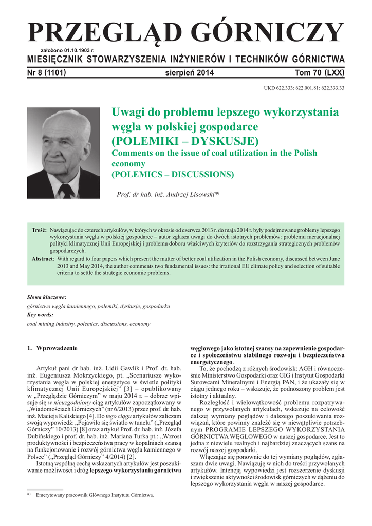 PRZEGLĄD GÓRNICZY Nr 8 PRZEGLĄD GÓRNICZY 1 założono 01.10.1903 r. MIESIĘCZNIK STOWARZYSZENIA INŻYNIERÓW I TECHNIKÓW GÓRNICTWA Nr 8 (1101) sierpień 2014 Tom 70 (LXX) UKD 622.333: 622.001.81: 622.333.33 Uwagi do problemu lepszego wykorzystania węgla w polskiej gospodarce (POLEMIKI – DYSKUSJE) Comments on the issue of coal utilization in the Polish economy (polemics – discussions) Prof. dr hab. inż. Andrzej Lisowski*) Treść: Nawiązując do czterech artykułów, w których w okresie od czerwca 2013 r. do maja 2014 r. były podejmowane problemy lepszego wykorzystania węgla w polskiej gospodarce – autor zgłasza uwagi do dwóch istotnych problemów: problemu nieracjonalnej polityki klimatycznej Unii Europejskiej i problemu doboru właściwych kryteriów do rozstrzygania strategicznych problemów gospodarczych. Abstract: With regard to four papers which present the matter of better coal utilization in the Polish economy, discussed between June 2013 and May 2014, the author comments two fundamental issues: the irrational EU climate policy and selection of suitable criteria to settle the strategic economic problems. Słowa kluczowe: górnictwo węgla kamiennego, polemiki, dyskusje, gospodarka Key words: coal mining industry, polemics, discussions, economy 1. Wprowadzenie Artykuł pani dr hab. inż. Lidii Gawlik i Prof. dr. hab. inż. Eugeniusza Mokrzyckiego, pt. „Scenariusze wykorzystania węgla w polskiej energetyce w świetle polityki klimatycznej Unii Europejskiej” [3] – opublikowany w „Przeglądzie Górniczym” w maju 2014 r. – dobrze wpisuje się w nieuzgodniony ciąg artykułów zapoczątkowany w „Wiadomościach Górniczych” (nr 6/2013) przez prof. dr. hab. inż. Macieja Kaliskiego [4]. Do tego ciągu artykułów zaliczam swoją wypowiedź: „Pojawiło się światło w tunelu” („Przegląd Górniczy” 10/2013) [8] oraz artykuł Prof. dr. hab. inż. Józefa Dubińskiego i prof. dr. hab. inż. Mariana Turka pt.: „Wzrost produktywności i bezpieczeństwa pracy w kopalniach szansą na funkcjonowanie i rozwój górnictwa węgla kamiennego w Polsce” („Przegląd Górniczy” 4/2014) [2]. Istotną wspólną cechą wskazanych artykułów jest poszukiwanie możliwości i dróg lepszego wykorzystania górnictwa *) Emerytowany pracownik Głównego Instytutu Górnictwa. węglowego jako istotnej szansy na zapewnienie gospodarce i społeczeństwu stabilnego rozwoju i bezpieczeństwa energetycznego. To, że pochodzą z różnych środowisk: AGH i równocześnie Ministerstwo Gospodarki oraz GIG i Instytut Gospodarki Surowcami Mineralnymi i Energią PAN, i że ukazały się w ciągu jednego roku – wskazuje, że podnoszony problem jest istotny i aktualny. Rozległość i wielowątkowość problemu rozpatrywanego w przywołanych artykułach, wskazuje na celowość dalszej wymiany poglądów i dalszego poszukiwania rozwiązań, które powinny znaleźć się w niewątpliwie potrzebnym PROGRAMIE LEPSZEGO WYKORZYSTANIA GÓRNICTWA WĘGLOWEGO w naszej gospodarce. Jest to jedna z niewielu realnych i najbardziej znaczących szans na rozwój naszej gospodarki. Włączając się ponownie do tej wymiany poglądów, zgłaszam dwie uwagi. Nawiązuję w nich do treści przywołanych artykułów. Intencją wypowiedzi jest rozszerzenie dyskusji i zwiększenie aktywności środowisk górniczych w dążeniu do lepszego wykorzystania węgla w naszej gospodarce. 2 PRZEGLĄD GÓRNICZY 2. Uwaga 1 Polska nie powinna poddawać się wymaganiom polityki klimatycznej narzucanej przez Unię Europejską Prof. Kaliski we wspomnianym artykule bierze pod uwagę wymagania pakietu klimatycznego Unii Europejskiej jako znaczący (niemal zasadniczy) czynnik kształtujący naszą politykę elektro-energetyczną. Podobnie dr hab. Lidia Gawlik i prof. Eugeniusz Mokrzycki ukierunkowali przeprowadzoną scenariuszową analizę polskiej polityki elektro-energetycznej do roku 2050 – dostosowując ją do wymagań polityki klimatycznej Unii Europejskiej. Nie solidaryzuję się z tą uległością. Prowadzoną przez polski rząd w kolejnych kadencjach po wdrożeniu rynkowej transformacji – politykę degradacji górnictwa węgla kamiennego – uważałem i uważam za błędną [9]. Także dotychczasową zgodę kolejnych rządów na antywęglową politykę klimatyczną prowadzoną przez Unię Europejską uważam za błąd. W tym kontekście i aspekcie – przekaz zawarty w obydwóch przywołanych artykułach – oceniam krytycznie. Uważam, że aktualnie funkcjonujący rząd nie powinien dopuścić do dalszego podporządkowywania Polski – polityce klimatycznej Unii Europejskiej – zabiegając też o zmianę tej polityki w całej Unii. Równocześnie nasze środowiska górnicze powinny otwarcie i stanowczo wskazywać na wszystkie negatywy tej antywęglowej polityki. Twierdzę, że klimatyczna polityka Unii Europejskiej jest utopijna i nieracjonalna z dwóch istotnych powodów. Po pierwsze, dlatego, że gdyby nawet ograniczenie spalania węgla mogło rzeczywiście wpłynąć znacząco na klimat planety – to warunkiem koniecznym osiągnięcia tego rezultatu byłoby przyjęcie unijnej polityki przez cały świat, który w roku 2012 zużywał już blisko 8 miliardów ton węgla (energetycznego, koksowego i brunatnego). Ale świat nie może i nie chce rezygnować z węgla jako nośnika najpowszechniej występującego i zapewniającego dostępność energii po najniższym koszcie. Największe potęgi w zużyciu tego paliwa (Chiny 3 665, USA 0,821, Indie 0,765, Rosja 0,249 miliardów ton) – podobnie jak większość pozostałych państw – odrzucają politykę zwalczania najtańszego i najpowszechniej dostępnego nośnika energii. W tej sytuacji Unia ze swoją antywęglową polityką klimatyczną jest skazana na jej wycofanie. Termin wycofania będzie tym krótszy, im szybszy będzie rozwój technologii zmniejszających emisję CO2 oraz rozwiązań umożliwiających utylizację bądź wykorzystanie tego 