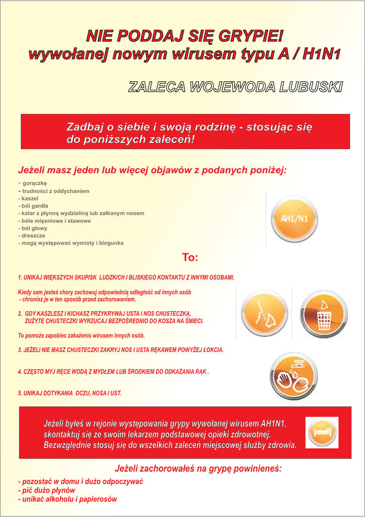 NIE PODDAJ SIÊ GRYPIE! wywo³anej nowym wirusem typu A / H1N1 ZALECA WOJEWODA LUBUSKI Zadbaj o siebie i swoj¹ rodzinê - stosuj¹c siê do poni¿szych zaleceñ! Je¿eli masz jeden lub wiêcej objawów z podanych poni¿ej: - gor¹czkê - trudnoœci z oddychaniem - kaszel - ból gard³a - katar z p³ynn¹ wydzielin¹ lub zatkanym nosem - bóle miêsniowe i stawowe - ból g³owy - dreszcze - mog¹ wystêpowaæ wymioty i biegunka To: 1. UNIKAJ WIÊKSZYCH SKUPISK LUDZKICH I BLISKIEGO KONTAKTU Z INNYMI OSOBAMI. Kiedy sam jesteœ chory zachowuj odpowiedni¹ odleg³oœæ od innych osób - chronisz je w ten sposób przed zachorowaniem. 2. GDY KASZLESZ I KICHASZ PRZYKRYWAJ USTA I NOS CHUSTECZK¥. ZU¯YTE CHUSTECZKI WYRZUCAJ BEZPOŒREDNIO DO KOSZA NA ŒMIECI. To pomo¿e zapobiec zaka¿eniu wirusem innych osób. 3. JE¯ELI NIE MASZ CHUSTECZKI ZAKRYJ NOS I USTA RÊKAWEM POWY¯EJ £OKCIA. 4. CZÊSTO MYJ RÊCE WOD¥ Z MYD£EM LUB ŒRODKIEM DO ODKA¯ANIA R¥K . 5. UNIKAJ DOTYKANIA OCZU, NOSA I UST. Je¿eli by³eœ w rejonie wystêpowania grypy wywo³anej wirusem AH1N1, skontaktuj siê ze swoim lekarzem podstawowej opieki zdrowotnej. Bezwzglêdnie stosuj siê do wszelkich zaleceñ miejscowej s³u¿by zdrowia. Je¿eli zachorowa³eœ na grypê powinieneœ: - pozostaæ w domu i du¿o odpoczywaæ - piæ du¿o p³ynów - unikaæ alkoholu i papierosów