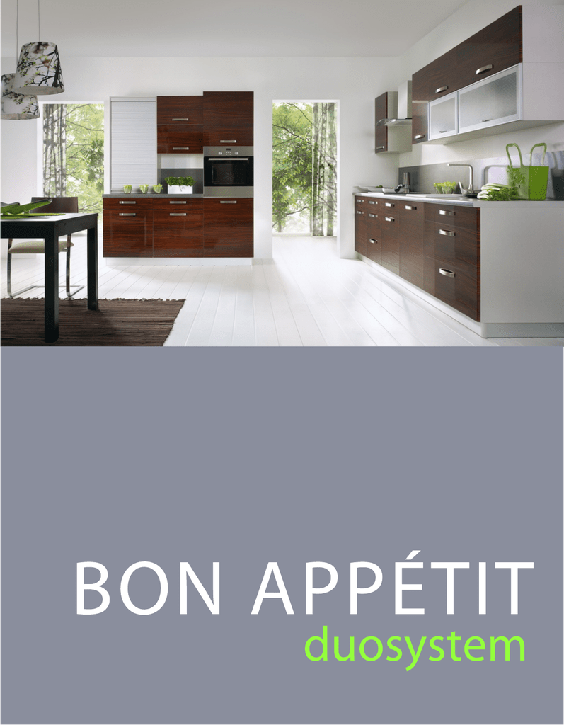 MEBLE KUCHENNE / KITCHEN FURNITURE meble do samodzielnego montażu / furniture for self-assemblage kolor korpusu: szary filigrane / body colour: grey filigrane kolor frontu: dąb szczotkowany / front colour: brushed oak typ frontu: tafla / front type: surface BON APPÉTIT duosystem: kuchnia / kitchen szer./gł.(dł.)/wys. = width/depth(lenght)/height BON APPÉTIT 172 Meble kuchenne BON APPÉTIT to meble do samodzielnego montażu o podwyższonym standardzie. Dzięki kreatywnym rozwiązaniom produkcyjnym, technologicznym i funkcjonalnym kryją w sobie wiele sekretów kuchennego komfortu. Nowy standard Szafki górne: B29/BF23, B30/BF24, B30/BF25, B30/BF26, B31/BF27, B31/ BF28, B31/BF29 z drzwiami otwieranymi w płaszczyźnie poziomej zostały The kitchen furniture BON APPÉTIT is the self-assembly furniture of high standard. Thanks to creative production, technological and functional solutions, it provides a lot of secrets of kitchen comfort. wyposażone w dwa podnośniki gazowe. Podnośniki gazowe wspomagają i ułatwiają proces otwierania szafek. Po otwarciu utrzymują front w stałej pozycji poziomej. New standard Wall BF24, cupboards: B29/BF23, B30/ B30/BF25, B30/BF26, B31/ BF27, B31 BF28, B31/BF29 with horizontally opening doors were equipped with two gas elevators. The gas elevators support and facilitate the process of opening of the cupboards. After opening, they keep a front in a stable horizontal position. BON APPÉTIT duosystem: kuchnia / kitchen meble do samodzielnego montażu / furniture for self-assemblage kolor korpusu: szary filigrane / body colour: grey filigrane kolor frontu: dąb szczotkowany / front colour: brushed oak typ frontu: tafla / front type: surface szer./gł.(dł.)/wys. = width/depth(lenght)/height 173 BON APPÉTIT MEBLE KUCHENNE / KITCHEN FURNITURE MEBLE KUCHENNE / KITCHEN FURNITURE BON APPÉTIT duosystem: kuchnia / kitchen BON APPÉTIT 174 Nowy standard Wyposażeniem dodatkowym szafki narożnej B21/BF16 są dwa kosze obrotowe w kształcie pełnego koła osadzone na osi rurowej. Kosze obrotowe ułatwiają dostęp do przechowywanych w szafce narożnej akcesoriów kuchennych. Wyposażenie standardowe szafki narożnej B21/BF16 stanowi pojedyncza półka. New standard The additional fittings of the corner unit B21/BF16 are two revolving baskets of a shape of a full circle placed on an tubular axis. The revolving baskets facilitate access to kitchen accessories stored in a corner unit. The standard fittings of the corner unit B21/BF16 is a single shelf. meble do samodzielnego montażu / furniture for self-assemblage kolor korpusu: szary filigrane / body colour: grey filigrane kolor frontu: miedziano-srebrny / front colour: copper and silver typ frontu: tafla / front type: surface szer./gł.(dł.)/wys. = width/depth(lenght)/height BON APPÉTIT duosystem: kuchnia / kitchen meble do samodzielnego montażu / furniture for self-assemblage kolor korpusu: szary filigrane / body colour: grey filigrane kolor frontu: miedziano-srebrny / front colour: copper and silver typ frontu: tafla / front type: surface szer./gł.(dł.)/wys. = width/depth(lenght)/height 175 BON APPÉTIT MEBLE KUCHENNE / KITCHEN FURNITURE MEBLE KUCHENNE / KITCHEN FURNITURE BON APPÉTIT duosystem: kuchnia / kitchen BON APPÉTIT 176 meble do samodzielnego montażu / furniture for self-assemblage kolor korpusu: szary filigrane / body colour: grey filigrane kolor frontu: sorano zielono-kremowe / front colour: green and cream sorano typ frontu: ekran / front type: screen szer./gł.(dł.)/wys. = width/depth(lenght)/height BON APPÉTIT duosystem: kuchnia / kitchen meble do samodzielnego montażu / furniture for self-assemblage kolor korpusu: szary filigrane / body colour: grey filigrane kolor frontu: sorano zielono-kremowe / front colour: green and cream sorano typ frontu: ekran / front type: screen szer./gł.(dł.)/wys. = width/depth(lenght)/height 177 BON APPÉTIT MEBLE KUCHENNE / KITCHEN FURNITURE MEBLE KUCHENNE / KITCHEN FURNITURE BON APPÉTIT duosystem: kuchnia / kitchen BON APPÉTIT 178 meble do samodzielnego montażu / furniture for self-assemblage kolor korpusu: szary filigrane / body colour: grey filigrane kolor frontu: jaśmin / front colour: jasmine typ frontu: tafla / front type: surface szer./gł.(dł.)/wys. = width/depth(lenght)/height BON APPÉTIT duosystem: kuchnia / kitchen meble do samodzielnego montażu / furniture for self-assemblage kolor korpusu: szary filigrane / body colour: grey filigrane kolor frontu: jaśmin / front colour: jasmine typ frontu: tafla / front type: surface szer./gł.(dł.)/wys. = width/depth(lenght)/height 179 BON APPÉTIT MEBLE KUCHENNE / KITCHEN FURNITURE MEBLE KUCHENNE / KITCHEN FURNITURE BON APPÉTIT duosystem: kuchnia / kitchen BON APPÉTIT 180 Nowy standard Szafka B47 jest wyposażona w nowoczesny system żaluzji o biegu pionowym, który wyznacza nowe trendy w zakresie systemów żaluzji do szafek meblowych. Zastosowanie specjalnej techniki łączenia umożliwia optymalizację ruchu żaluzji nawet w małych łukach. Oznacza to minimalną przestrzeń niezbędną do zrolowania żaluzji przy najwyższym komforcie obsługi. Zastosowanie żaluzji w szafkach górnych znacznie ułatwia poruszanie się po wąskiej kuchni. New standard The cupboard B47 is equipped with a modern system of vertical blinds which sets a new trend as regards a system of blinds for furniture cupboards. The application of a special technique of joining enables the optimalization of movement of blinds even in small arches. It means a minimal surface necessary for rolling up blinds at the simultaneous highest comfort of use. The application of blinds in wall cupboards largely facilitates moving in a narrow kitchen. meble do samodzielnego montażu / furniture for self-assemblage kolor korpusu: szary filigrane / body colour: grey filigrane kolor frontu: jesion włoski / front colour: Italian ash typ frontu: tafla / front type: surface szer./gł.(dł.)/wys. = width/depth(lenght)/height BON APPÉTIT du