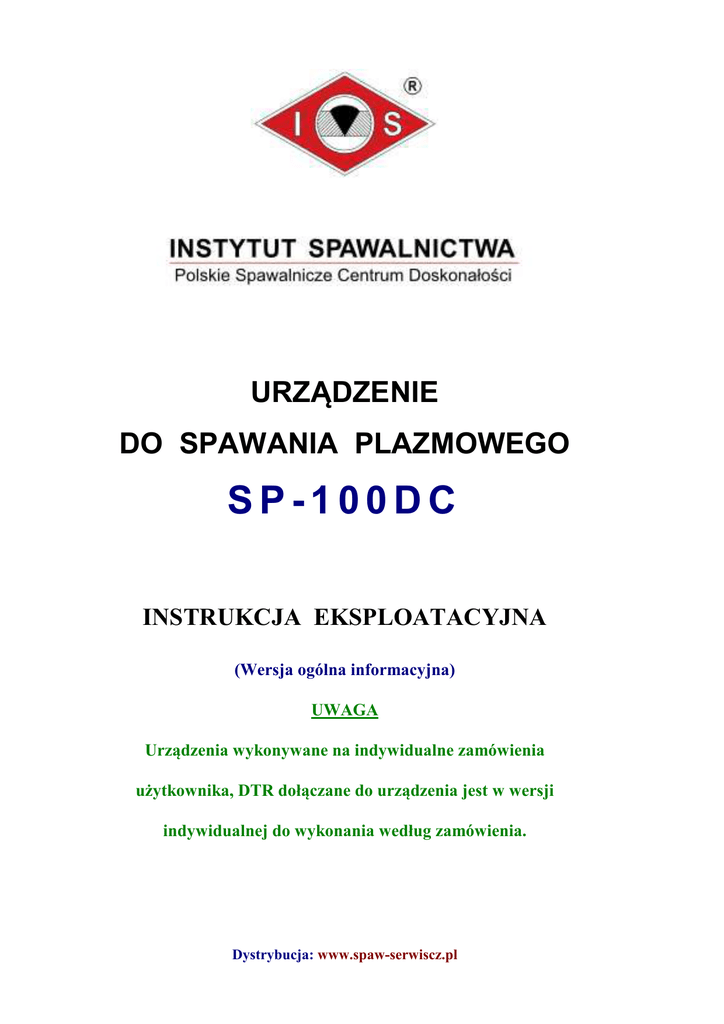 URZĄDZENIE DO SPAWANIA PLAZMOWEGO SP-100DC INSTRUKCJA EKSPLOATACYJNA (Wersja ogólna informacyjna) UWAGA Urządzenia wykonywane na indywidualne zamówienia użytkownika, DTR dołączane do urządzenia jest w wersji indywidualnej do wykonania według zamówienia. Dystrybucja: www.spaw-serwiscz.pl Urządzenie do spawania plazmowego -3- typ SP-100DC Urządzenie do spawania plazmowego typ SP-100DC OSTRZEŻENIE Urządzenie SP-100DC może być użytkowane tylko przez wykwalifikowany personel. Należy być pewnym, że instalacja, obsługa, przeglądy i naprawy są przeprowadzane tylko przez osoby wykwalifikowane. Instalacji i eksploatacji tego urządzenia można dokonywać tylko po dokładnym zapoznaniu się z tą instrukcją obsługi. Nieprzestrzeganie zaleceń zawartych w tej instrukcji może narazić użytkownika na poważne obrażenia ciała, śmierć lub uszkodzenie samego urządzenia. Instytut Spawalnictwa nie ponosi odpowiedzialności za uszkodzenia spowodowane niewłaściwą instalacją, niewłaściwą konserwacją lub nienormalną obsługą. -4- Urządzenie do spawania plazmowego typ SP-100DC SPIS TREŚCI 1. INSTRUKCJA BHP..................................................................................................... 7 1.1. SZKODLIWE GAZY I PYŁY.............................................................................. 7 1.2. PROMIENIOWANIE ŁUKU ............................................................................... 8 1.3. PORAŻENIE ELEKTRYCZNE ........................................................................... 8 1.4. ZAGROŻENIE POŻAROWE .............................................................................. 8 2. CHARAKTERYSTYKA URZĄDZENIA SP-100DC ................................................ 9 3. DANE TECHNICZNE URZĄDZENIA SP-100DC.................................................. 10 4. OPIS TECHNICZNY URZĄDZENIA SP-100DC.................................................... 11 4.1. ZASILACZ SPAWARKI SP-100DC ................................................................. 12 4.1.1. Elementy przyłączeniowe, nastawcze i sygnalizacyjne........................... 12 4.2. UCHWYT DO SPAWANIA PLAZMOWEGO................................................. 16 4.2.1. Dane techniczne uchwytu do spawania plazmowego ABIPLAS WELD 100W ......................................................................... 16 4.3. CHŁODNICA DO UCHWYTU SPAWALNICZEGO ...................................... 17 4.3.1. Dane techniczne chłodnicy do uchwytów spawalniczych UChW-2 ................................................................................................. 17 5. INSTALOWANIE URZĄDZENIA SP-100DC......................................................... 19 5.1. PODŁĄCZENIE UKŁADU CHŁODZENIA..................................................... 19 5.2. PODŁĄCZENIE UCHWYTU DO SPAWANIA PLAZMOWEGO.................. 20 5.3. PODŁĄCZENIE GAZÓW TECHNOLOGICZNYCH ...................................... 20 5.4. PODŁĄCZENIE MASOWEGO PRZEWODU SPAWALNICZEGO............... 20 6. PRZYGOTOWANIE URZĄDZENIA SP-100DC DO PRACY ............................... 21 6.1. USTAWIANIE PRZEPŁYWÓW GAZÓW TECHNOLOGICZNYCH ............ 21 6.2. PROGRAMOWANIE WARTOŚCI PARAMETRÓW PRZEBIEGU SPAWANIA........................................................................................................ 22 7. EKSPLOATACJA URZĄDZENIA SP-100DC ........................................................ 25 7.1. PROCES SPAWANIA ....................................................................................... 26 7.2. TECHNIKA SPAWANIA (WYTYCZNE TECHNOLOGICZNE) ................... 28 7.2.1. Wytyczne do stosowania dysz i elektrod uchwytu do spawania plazmowego ABIPLAS WELD 100W.................................................... 28 7.3. OBSŁUGA I SPOSÓB WYMIANY UCHWYTU DO SPAWANIA PLAZMOWEGO ................................................................................................ 29 7.3.1. Montaż uchwytu ABIPLAS WELD 100W firmy Abicor Binzel............ 30 8. STANY AWARYJNE URZĄDZENIA..................................................................... 31 9. KONSERWACJA I NAPRAWY URZĄDZENIA.................................................... 32 -5- Urządzenie do spawania plazmowego typ SP-100DC 10. WYKAZ CZĘŚCI ZAMIENNYCH DO URZĄDZENIA SP-100DC ....................... 33 11. WYPOSAŻENIE URZĄDZENIA SP-100DC ........................................................... 36 12. SPECYFIKACJA CZĘŚCI ZUŻYWAJĄCYCH SIĘ UCHWYTU DO SPAWANIA PLAZMOWEGO ........................................................................... 37 SPIS RYSUNKÓW Rys. 1. Widok urządzenia do spawania plazmowego SP-100DC........................................ 11 Rys. 2. Widok płyty frontowej urządzenia SP-100DC ........................................................ 14 Rys. 3. Widok płyty tylnej urządzenia SP-100DC............................................................... 15 Rys. 4. Widok panelu sterowniczego................................................................................... 22 Rys. 5. Części zamienne urządzenia SP-100DC.................................................................. 35 SPIS ZAŁĄCZNIKÓW Załącznik 1. Uproszczony schemat obwodu głównego urządzenia SP-100DC Załącznik 2. Rysunek poglądowy ABIPLAS WELD 100W Załącznik 3. Uchwyt do spawania plazmą ABIPLAS WELD 100W – Instrukcja obsługi (jęz. niemiecki, angielski, francuski, hiszpański) Załącznik 4. Uchwyt do spawania plazmą ABIPLAS WELD 100W – Instrukcja obsługi (jęz. polski) Załącznik 5. Urządzenie do chłodzenia wody typu UChW-2 – Instrukcja obsługi Załącznik 6. Deklaracja zgodności CE Załącznik 7. Karta gwarancyjna uchwytu -6- do spawania plazmowego Urządzenie do spawania plazmowego 1. typ SP-100DC INSTRUKCJA BHP Proces spawania plazmowego stwarza pewne zagrożenia z punktu widzenia bezpieczeństwa i higieny pracy, dlatego personel obsługujący urządzenie zobowiąz