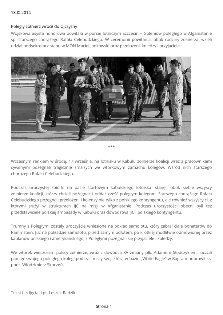 18.IX.2014 Poległy żołnierz wrócił do Ojczyzny Wojskowa asysta honorowa powitała w porcie lotniczym Szczecin – Goleniów poległego w Afganistanie śp. starszego chorążego Rafała Celebudzkiego. W ceremonii powitania, obok rodziny żołnierza, wzięli udział podsekretarz stanu w MON Maciej Jankowski oraz przełożeni, koledzy i przyjaciele. *** Wczesnym rankiem w środę, 17 września, na lotnisku w Kabulu żołnierze koalicji wraz z pracownikami cywilnymi pożegnali tragicznie zmarłych we wtorkowym zamachu kolegów. Wśród nich starszego chorążego Rafała Celebudzkiego. Podczas uroczystej zbiórki na pasie startowym kabulskiego lotniska stanęli obok siebie wszyscy żołnierze koalicji, którzy chcieli pożegnać i oddać cześć poległym kolegom. Starszego chorążego Rafała Celebudzkiego pożegnali przełożeni i koledzy nie tylko z polskiego kontyngentu, ale również wszyscy ci, z którymi służył w strukturach IJC na misji w Afganistanie. Podczas uroczystości obecni byli też przedstawiciele polskiej ambasady w Kabulu oraz dowództwa IJC i polskiego kontyngentu. Trumny z Poległymi zostały uroczyście wniesione na pokład samolotu, który zabrał ciała bohaterów do Rammstein. Już na pokładzie samolotu, przed samym odlotem, po krótkiej modlitwie odmówionej przez kapłanów polskiego i amerykańskiego, z Poległymi pożegnali się przyjaciele i koledzy. We wtorek wieczorem polscy żołnierze, wraz z dowódcą XV zmiany płk. Adamem Słodczykiem, uczcili pamięć swojego poległego kolegi podczas mszy św., którą w bazie „White Eagle” w Bagram odprawił ks. ppor. Włodzimierz Skoczeń. Tekst i zdjęcia: kpt. Leszek Radzik Strona 1 Strona 2