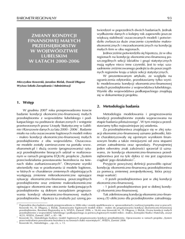 BAROMETR REGIONALNY ZMIANY KONDYCJI FINANSOWEJ MAŁYCH PRZEDSIĘBIORSTW W WOJEWÓDZTWIE LUBELSKIM W LATACH 2000-2006 Mieczysław Kowerski, Jarosław Bielak, Dawid Długosz Wyższa Szkoła Zarządzania i Administracji 1. Wstęp W grudniu 2007 roku przeprowadzono trzecie badanie kondycji ekonomiczno-finansowej małych przedsiębiorstw z województw lubelskiego i podkarpackiego na podstawie dostarczonych i wstępnie przetworzonych przez Urzędy Statystyczne w Lubli1 nie i Rzeszowie danych za lata 2000 - 2006 . Badanie miało na celu oszacowanie logitowych modeli mikro - makro kondycji ekonomiczno-finansowej małych przedsiębiorstw z obu województw. Oszacowane modele zostały zamieszczone na portalu www. ebarometr.pl i służą ocenie (prognozowaniu) sytuacji przedsiębiorstw biorących udział w realizowanym w ramach programu EQUAL projekcie „System przeciwdziałania powstawaniu bezrobocia na terenach słabo zurbanizowanych”. Otrzymane wyniki utwierdziły nas w przekonaniu iż modele logitowe, w których w charakterze zmiennych objaśniających występują zmienne mikroekonomiczne opisujące sytuację ekonomiczno-finansową poszczególnych przedsiębiorstw oraz zmienne makroekonomiczne opisujące ekonomiczne otoczenie funkcjonujących przedsiębiorstw są dobrym narzędziem prognozowania kondycji ekonomiczno-finansowej małych przedsiębiorstw. Hipoteza ta znalazła już szereg po1 2 3 93 twierdzeń w poprzednich dwóch badaniach. Jednak wydłużenie danych o kolejny rok zapewniło jeszcze większą stabilność oszacowanych modeli i potwierdziło zwłaszcza duże znaczenie czynników makroekonomicznych i mezoekonomicznych na kondycję małych firm w obu regionach. Jednocześnie potwierdziła się hipoteza, że w obu regionach na kondycję ekonomiczno-finansową poszczególnych sekcji (działów i grup) statystycznych mają wpływ nieco inne czynniki. Jest to więc uzasadnienie zróżnicowanego podejścia do poszczególnych regionów kraju a także sekcji statystycznych. W prezentowanym artykule, ze względu na ograniczenia edytorskie, przedstawiamy tylko wyniki modelowania kondycji ekonomiczno-finansowej małych przedsiębiorstw z województwa lubelskiego. Wyniki dla województwa podkarpackiego znajdują się w dokumentacji projektu. 2. Metodologia badania Metodologia modelowania i prognozowania kondycji przedsiębiorstw została wypracowana na 2 etapie badania pilotażowego . W tym miejscu przedstawiamy tylko najważniejsze jej ustalenia. Za przedsiębiorstwa znajdujące się w złej sytuacji ekonomiczno-finansowej uznano jednostki, które charakteryzowały się ujemnym wynikiem finansowym brutto a także mniejszymi od zera stopami zmian zatrudnienia oraz sprzedaży. Przynajmniej jeden odwrotny znak zależności sprawiał iż uznawano, że kondycja ekonomiczno-finansowa przedsiębiorstwa jest na tyle dobra iż nie jest zagrożona 3 ciągłość jego działalności . Przyjęcie powyższej definicji pozwoliło opisać kondycję ekonomiczno-finansową przedsiębiorstwa za pomocą zmiennej zerojedynkowej, która przyjmuje wartość: - 0 jeżeli przedsiębiorstwo jest w złej kondycji ekonomiczno-finansowej, - 1 jeżeli przedsiębiorstwo jest w dobrej kondycji ekonomiczno-finansowej. Tak zdefiniowaną kondycję ekonomiczno-finansową (Y) obliczono dla przedsiębiorstw zatrudniają- Poprzednie dwa badania zostały przeprowadzone w 2006 roku i zostały opublikowane w sprawozdaniach z realizacji projektu oraz w pracach: Kowerski M., D. Długosz, J. Bielak, Zastosowanie logitowych modeli mikro - makro do prognozowania kondycji ekonomiczno-finansowej przedsiębiorstw, Barometr Regionalny nr 6, WSZiA, Zamość 2006, s. 56-66 oraz Kowerski M., D. Długosz, J. Bielak, Ocena kondycji małych przedsiębiorstw z województw lubelskiego i podkarpackiego za pomocą logitowych modeli mikro - makro, Zamojskie Studia i Materiały, zeszyt 4(23), WSZiA, Zamość 2007, s. 83 - 98. Kowerski M., Metodologia budowy modeli logitowych prognozowania kondycji przedsiębiorstw, Opracowanie w ramach projektu „System przeciwdziałania powstawaniu bezrobocia na terenach słabo rozwiniętych”, WSZiA, Zamość 2006 Kowerski M., Metodologia…,op. cit., s. 13. 94 cych od 10 do 49 osób w obu województwach w latach 2000-2006. Wybrano tylko te przedsiębiorstwa, które składały sprawozdania a więc funkcjonowały w dwóch kolejnych latach, poczynając od 1999 roku. To znaczy iż kondycję ekonomiczno-finansową w 2000 roku określano tylko dla przedsiębiorstw, które złożyły sprawozdania za rok 1999 oraz za rok 2000. Z kolei kondycję ekonomiczno-finansową w 2001 roku określano tylko dla przedsiębiorstw, które złożyły sprawozdania za rok 2000 oraz za rok 2001 itd. Badaniami objęto przedsiębiorstwa wchodzące w skład pięciu sekcji. Jednocześnie korzystając ze sprawozdań SP dla każdego przedsiębiorstwa obliczano zestaw wskaźników ekonomiczno-finansowych (X). Wskaźniki te zawsze, dla każdego przedsiębiorstwa, pochodziły z okresu o rok wcześniejszego niż określona dla tego przedsiębiorstwa kondycja ekonomiczno-finansowa. A więc każdemu przedsiębiorstwu, dla którego określono kondycję ekonomiczno-finansową w 2000 roku przyporządkowano zestaw wskaźników ekonomiczno-finansowych z roku 1999 itd. Do zestawu zmiennych opisujących indywidualną sytuację przedsiębiorstwa włączono zestaw zmiennych makro i mezoekonomicznych - w każdym roku jednakowy dla wszystkich przedsiębiorstw w regionie (Z). Tak więc każde przedsiębiorstwo było charakteryzowane przez wektor liczb, w którym pierwszy element przyjmował wartość 0 lub 1 i określał jego kondycję ekonomiczno-finansową w roku t, kolejne elementy przyjmowały wartości rzeczywiste i opisywały różne aspekty jego działalności (33 wskaźniki mikroekonomiczne) a także sytuację makroekonomiczną i mezoekonomiczną w roku t-1 (15 zmiennych). Zależności pomiędzy kondycją przedsiębiorstwa w roku t (wartości zmiennych Yi