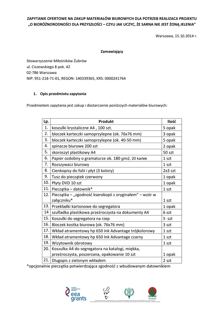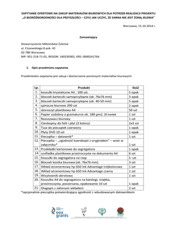 ZAPYTANIE OFERTOWE NA ZAKUP MATERIAŁÓW BIUROWYCH DLA POTRZEB REALIZACJI PROJEKTU „O BIORÓŻNORODNOŚCI DLA PRZYSZŁOŚCI – CZYLI JAK UCZYC, ŻE SARNA NIE JEST ŻONĄ JELENIA” Warszawa, 15.10.2014 r. Zamawiający Stowarzyszenie Miłośników Żubrów ul. Ciszewskiego 8 pok. 42 02-786 Warszawa NIP: 951-218-71-01, REGON: 140339365, KRS: 0000241764 1. Opis przedmiotu zapytania Przedmiotem zapytania jest zakup i dostarczenie poniższych materiałów biurowych: Lp. 1. 2. 3. 4. 5. 6. 7. 8. 9. 10. 11. 12. Produkt Ilość koszulki krystaliczne A4 , 100 szt. 5 opak bloczek karteczki samoprzylepne (ok. 76x76 mm) 3 opak bloczek karteczki samoprzylepne (ok. 40-50 mm) 5 opak spinacze biurowe 200 szt 2 opak skoroszyt plastikowy A4 50 szt Papier ozdobny o gramaturze ok. 180 g/m2, 20 kartek 1 szt Rozszywacz biurowy 1 szt Cienkopisy do folii i płyt (3 kolory) 2x3 szt Tusz do pieczątek czerwony 1 opak Płyty DVD 10 szt 1 opak Pieczątka – datownik* 1 szt Pieczątka – „zgodność kserokopii z oryginałem” – wzór w załączniku* 1 szt 13. Przekładki kartonowe do segregatora 1 opak 14 szufladka plastikowa przeźroczysta na dokumenty A4 6 szt 15. Koszulki do segregatora na rzep 5 szt 16. Bloczek kostka biurowa (ok. 76x76 mm) 3 szt 17. Wkład atramentowy hp 650 Ink Advantage trójkolorowy 1 szt 18. Wkład atramentowy hp 650 Ink Advantage czarny 1 szt 19. Wizytownik obrotowy 1 szt 20. Koszulka A4 do segregatora na katalogi, miękka, przeźroczysta, poszerzana, opakowanie 10 szt 1 opak 21. Dlugopis z zielonym wkładem 2 szt *opcjonalnie pieczątka potwierdzająca zgodność z wbudowanym datownikiem Postępowanie prowadzone jest zgodnie z Wytycznymi Ministra Infrastruktury i Rozwoju w zakresie udzielania zamówień w ramach Mechanizmu Finansowego EOG 2009-2014 oraz Norweskiego Mechanizmu Finansowego 2009-2014, do których nie ma zastosowania ustawa z dnia 29 stycznia 2004 r. – Prawo zamówień publicznych. 2. Kryterium Oceny Jedynym kryterium oceny ofert jest najniższa cena. Cena powinna obejmować wszystkie koszty, jakie poniesie dostawca przy realizacji zamówienia. Nie dopuszcza się składania ofert częściowych. 3. Informacje dotyczące nadsyłanych ofert Oferta powinna obejmować koszt brutto całości zamówienia, zgodnie z opisem przedmiotu zapytania oraz dostawę pod wskazany przez Zamawiającego adres na warszawskim Ursynowie. Oferty należy przesłać pocztą elektroniczną na adres [email protected] w terminie do 22 października 2014 do godziny 15:00. Cena powinna być kompletna i jednoznaczna, powinna obejmować wszystkie koszty, jakie poniesie zamawiający przy realizacji zadania. 4. Kontakt z zamawiającym W sprawach dotyczących realizacji zamówienia dopuszcza się kontakt z Zamawiającym w formie pisemnej (e-mail: [email protected] ) w terminie do 20 października do godziny 15:00. 5. Informacja o wyborze oferty Informacja o wyborze oferty zostanie przesłana drogą mailową. Z wybranym Dostawcą zostanie podpisana umowa, a płatność będzie zrealizowana na podstawie faktury przelewowej po dostarczeniu zamówienia. Zamawiający oczekuje dostarczenia zamówienia w ciągu 7 dni od podpisania umowy. 6. Informacje dodatkowe Zamawiający zastrzega sobie prawo do unieważnienia postępowania bez podania przyczyny. Zał.1 Wzór pieczątki Zał. 2 Formularz ofertowy Załącznik nr 2 …………………………………………………………….. ……………………………………………………………… (Dane oferenta: nazwa firmy, adres, nr telefonu) W związku zapytaniem ofertowym z dnia 15.10.2014 na zakup i dostawę: Materiałów biurowych dla Projektu „O BIORÓŻNORODNOŚCI DLA PRZYSZŁOŚCI – CZYLI JAK UCZYC, ŻE SARNA NIE JEST ŻONĄ JELENIA” Wyceniam wynagrodzenie za dostawę na kwotę brutto* ……………………..……………zł, słownie………………………… ………………………………… ………………………….…….złotych, Lp. Produkt Ilość 1. koszulki krystaliczne A4 , 100 szt. 5 szt 2. bloczek karteczki samoprzylepne (ok. 76x76 mm) 3 opak bloczek karteczki samoprzylepne (ok. 40-50 mm) 5 opak spinacze biurowe 200 szt 2 opak skoroszyt plastikowy A4 50 szt Papier ozdobny o gramaturze ok. 180 g/m2 1 opak Rozszywacz biurowy 1 szt Cienkopisy do folii i płyt (3 kolory) 2x3 szt Tusz do pieczątek czerwony 1 opak Płyty DVD 10 szt 1 opak 3. 4. 5. 6. 7. 8. 9. 10. 11. Pieczątka – datownik* 12. Pieczątka – „zgodność kserokopii z oryginałem” – wzór w załączniku* 13. Przekładki kartonowe do segregatora 14. szufladka plastikowa przeźroczysta na dokumenty A4 15. Koszulki do segregatora na rzep 16. Bloczek kostka biurowa (ok. 76x76 mm) 17. Wkład atramentowy hp 650 Ink Advantage trójkolorowy 18. Wkład atramentowy hp 650 Ink Advantage czarny 19. Wizytownik obrotowy 20. Koszulka A4 do segregatora na katalogi, miękka, przeźroczysta, poszerzana, opakowanie 10 szt 21. Dlugopis z zielonym wkładem Razem Cena netto 1szt. Wartość netto Wartość brutto 1 szt 1 szt 1 opak 6 szt 5 szt 3 szt 1 szt 1 szt 1szt 1 opak 2 szt Oświadczam, że dysponuję odpowiednim potencjałem technicznym do realizacji zamówienia. Wynagrodzenie za dostawę wyceniam na kwotę brutto …………………zł, ………………………………… ………………………….…….złotych, słownie………………………… ………………………….. (podpis oferenta)