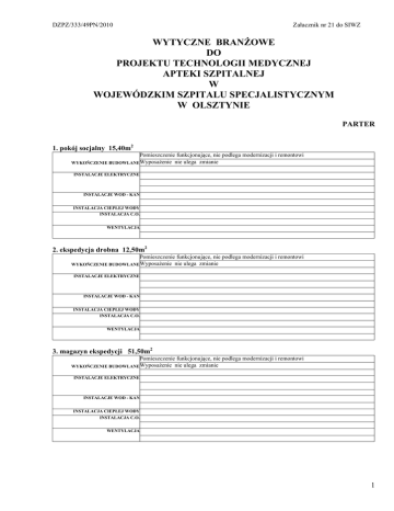 DZPZ/333/49PN/2010 Załacznik nr 21 do SIWZ WYTYCZNE BRANŻOWE DO PROJEKTU TECHNOLOGII MEDYCZNEJ APTEKI SZPITALNEJ W WOJEWÓDZKIM SZPITALU SPECJALISTYCZNYM W OLSZTYNIE PARTER 1. pokój socjalny 15,40m2 Pomieszczenie funkcjonujące, nie podlega modernizacji i remontowi nie ulega zmianie WYKOŃCZENIE BUDOWLANEWyposażenie INSTALACJE ELEKTRYCZNE INSTALACJE WOD - KAN INSTALACJA CIEPŁEJ WODY INSTALACJA C.O. WENTYLACJA 2. ekspedycja drobna 12,50m2 Pomieszczenie funkcjonujące, nie podlega modernizacji i remontowi nie ulega zmianie WYKOŃCZENIE BUDOWLANEWyposażenie INSTALACJE ELEKTRYCZNE INSTALACJE WOD - KAN INSTALACJA CIEPŁEJ WODY INSTALACJA C.O. WENTYLACJA 3. magazyn ekspedycji 51,50m2 Pomieszczenie funkcjonujące, nie podlega modernizacji i remontowi nie ulega zmianie WYKOŃCZENIE BUDOWLANEWyposażenie INSTALACJE ELEKTRYCZNE INSTALACJE WOD - KAN INSTALACJA CIEPŁEJ WODY INSTALACJA C.O. WENTYLACJA 1 DZPZ/333/49PN/2010 Załacznik nr 21 do SIWZ PARTER 4. pomieszczenie porządkowe 3,8m2 Glazura do wys 160cm, powyżej malowanie farbą zmywalną łatwozmywalna, twarda, cokół wys.10cm Izolacja przrciwwilgociowa podłogi INSTALACJE ELEKTRYCZNE Oświetlenie fluorescencyjne WYKOŃCZENIE BUDOWLANEPodłoga Gniazdo wtykowe 230V porządkowe przyborów sanitarnych, kratki ściekowej, krócców z woda ciepłą i zimną INSTALACJE WOD - KANDo INSTALACJA CIEPŁEJ WODYDo zlewu INSTALACJA C.O.+ 16°C 1-komorowego zainstalowanego 50 cm nad posadzką, króćców Ogrzewanie typowe wodno grzejnikowe WENTYLACJA2wym/h 5. komora przyjęć 12,90m2 Pomieszczenie funkcjonujące, nie podlega modernizacji i remontowi WYKOŃCZENIE BUDOWLANEWyposażenie nie ulega zmianie INSTALACJE ELEKTRYCZNE INSTALACJE WOD - KAN INSTALACJA CIEPŁEJ WODY INSTALACJA C.O. WENTYLACJA 6. ekspedycja 15,90m2 Pomieszczenie funkcjonujące, nie podlega modernizacji i remontowi nie ulega zmianie WYKOŃCZENIE BUDOWLANEWyposażenie INSTALACJE ELEKTRYCZNE INSTALACJE WOD - KAN INSTALACJA CIEPŁEJ WODY INSTALACJA C.O. WENTYLACJA 7. destylatornia 14,76m2 Pomieszczenie funkcjonujące, nie podlega modernizacji i remontowi nie ulega zmianie WYKOŃCZENIE BUDOWLANEWyposażenie INSTALACJE ELEKTRYCZNE INSTALACJE WOD - KAN INSTALACJA CIEPŁEJ WODY INSTALACJA C.O. WENTYLACJA 2 DZPZ/333/49PN/2010 Załacznik nr 21 do SIWZ PARTER 8a. CYTOSTATYKI boks jałowy 8,32m2 Pokrycie zmywalne ściany, bezspoinowe - do wys. pomieszczenia , sufitu farbą zmywalną antybakteryjną Podłoga łatwozmywalna, bezspoinowa, cokół wys.10cm, narożniki zaokrąglone INSTALACJE ELEKTRYCZNE Oświetlenie fluorescencyjne, instalacja do lamp bakteriobójczych Połączenie głosowe z pokojem administracyjnym Gniazda wtykowe 230V WYKOŃCZENIE BUDOWLANEMalowanie INSTALACJE WOD - KAN INSTALACJA CIEPŁEJ WODY INSTALACJA C.O.+ 20°C Ogrzewanie typowe wodno grzejnikowe, grzejniki w wykonaniu higienicznym WENTYLACJA20wym/h, załączane na 10 min przed rozpoczęciem pracy w pomieszczeniu Kanał wyciągowy z dygestorium /komory laminarnej/– urządzenie przystosowane do pracy z cytostatykami, filtr adsorpcyjny na wywiewie 8b. CYTOSTATYKI pomieszczenie administracyjne + magazyn 11,60m2 Pokrycie zmywalne ściany, bezspoinowe - do wys. pomieszczenia , sufitu farbą zmywalną antybakteryjną Podłoga łatwozmywalna, bezspoinowa, cokół wys.10cm, narożniki zaokrąglone INSTALACJE ELEKTRYCZNE Oświetlenie fluorescencyjne ,instalacja komputerowa i telefoniczna Instalacja do lamp bakteriobójczych, połączenie głosowe z boksem jałowym Gniazda wtykowe 230V WYKOŃCZENIE BUDOWLANEMalowanie INSTALACJE WOD - KAN INSTALACJA CIEPŁEJ WODY INSTALACJA C.O.+ 20°C Ogrzewanie typowe wodno grzejnikowe WENTYLACJA 5 wym/h 8c. CYTOSTATYKI śluza czysta 3,0m2 Pokrycie zmywalne ściany, bezspoinowe - do wys. pomieszczenia , sufitu farbą zmywalną antybakteryjną Podłoga łatwozmywalna, bezspoinowa, cokół wys.10cm, narożniki zaokrąglone INSTALACJE ELEKTRYCZNE Oświetlenie fluorescencyjne Instalacja do lamp bakteriobójczych Gniazdo wtykowe 230V porządkowe WYKOŃCZENIE BUDOWLANEMalowanie INSTALACJE WOD - KAN INSTALACJA CIEPŁEJ WODY INSTALACJA C.O.+ 20°C Ogrzewanie typowe wodno grzejnikowe WENTYLACJA 5 wym/h 8d. CYTOSTATYKI magazyn leku gotowego 4,39m2 Pokrycie zmywalne ściany, bezspoinowe - do wys. pomieszczenia , WYKOŃCZENIE BUDOWLANEMalowanie sufitu farbą zmywalną antybakteryjną Podłoga łatwozmywalna, bezspoinowa, cokół wys.10cm, narożniki zaokrąglone INSTALACJE ELEKTRYCZNE Oświetlenie fluorescencyjne Instalacja do lamp bakteriobójczych Gniazdo wtykowe 230V porządkowe INSTALACJE WOD - KAN INSTALACJA CIEPŁEJ WODY INSTALACJA C.O.+ 20°C Ogrzewanie typowe wodno grzejnikowe WENTYLACJA 5 wym/h 3 DZPZ/333/49PN/2010 Załacznik nr 21 do SIWZ PARTER 8e. CYTOSTATYKI śluza brudna 3,80m2 Pokrycie zmywalne ściany, bezspoinowe - do wys. pomieszczenia , WYKOŃCZENIE BUDOWLANEMalowanie sufitu farbą zmywalną antybakteryjną,fartuch z glazury przy umywalce do 160cm Podłoga łatwozmywalna, bezspoinowa, cokół wys.10cm, narożniki zaokrąglone INSTALACJE ELEKTRYCZNE Oświetlenie fluorescencyjne , Gniazdo wtykowe 230V Instalacja do lampy bakteriobójczej INSTALACJE WOD - KANDo przyborów sanitarnych Bateria bez kontaktu z dłonią INSTALACJA CIEPŁEJ WODYDo umywalki INSTALACJA C.O.+ 20°C Ogrzewanie typowe wodno grzejnikowe WENTYLACJA 5wym/h 9 . umywalnia 12,1m2 Pomieszczenie funkcjonujące, nie podlega modernizacji i remontowi nie ulega zmianie WYKOŃCZENIE BUDOWLANEWyposażenie INSTALACJE ELEKTRYCZNE INSTALACJE WOD - KAN INSTALACJA CIEPŁEJ WODY INSTALACJA C.O. WENTYLACJA 10. wc personelu 4,5m2 glazura do wys. pomieszczenia ,powyżej malowanie farbą emulsyjną łatwozmywalna, twarda, cokół wys.10cm Izolacja przrciwwilgociowa podłogi INSTALACJE ELEKTRYCZNE Oświetlenie fluorescencyjne, żarowe miejscowe WYKOŃCZENIE BUDOWLANEPodłoga Gniazdo wtykowe 230V do suszarki do rąk przyborów sanitarnych, kratki ściekowej INSTALACJE WOD - KANDo INSTALACJA CIEPŁEJ WODYDo umywalki INSTALACJA C.O.+ 20°C Ogrzew
