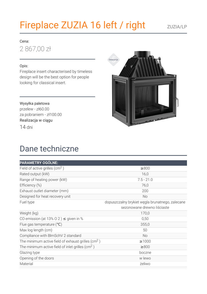 Fireplace ZUZIA 16 left / right ZUZIA/LP Cena: 2 867,00 zł Opis: Fireplace insert characterised by timeless design will be the best option for people looking for classical insert. Wysyłka paletowa przelew - zł60.00 za pobraniem - zł100.00 Realizacja w ciągu 14 dni Dane techniczne PARAMETRY OGÓLNE: Field of active grilles (cm2 ) Rated output (kW) Range of heating power (kW) Ef ciency (%) Exhaust outlet diameter (mm) Designed for heat recovery unit Fuel type Weight (kg) ≥800 16,0 7.5 - 21.0 76,0 200 No dopuszczalny brykiet węgla brunatnego, zalecane sezonowane drewno liściaste 170,0 CO emission (at 13% O 2 ) ≤ given in % Flue gas temperature (℃) 0,50 355,0 Max log length (cm) Compliance with BlmSchV 2 standard 50 No The minimum active eld of exhaust grilles (cm2 ) The minimum active eld of inlet grilles (cm2 ) Glazing type ≥1000 ≥800 boczne Opening of the doors Material w lewo żeliwo Width (cm) 66,50 Height (cm) Depth (cm) 81,00 44,20 External air inlet The liner of the combustion chamber No No Ashpan Decorative printed glass Yes No Zalety MAXIMUM USE OF ENERGY Maximum use of heat due to densely spaced radiators and the wall of the insert made of high quality cast iron with a thickness of 8 mm. Increased heat exchange surface between the hot exhaust gases and the room due to the high ue. Combustion of fuel particles thanks to de ector, which extends the exhaust gas path. Increased ef ciency of the insert through manual control of chimney draft by using the built-in damper. Manual control over the combustion process carried out by ash tray regulator. SAFETY AT THE HIGHEST LEVEL Classic front of insert is equipped with a heat-resistant ceramics that can withstand temperatures up to 800oC. Decorative fence helps to maintain the tidiness and protects against falling out of wood. CONVENIENT TO USE The cold handle system which limits the risk of burns due to the possibility of removing it while burning. Ash drawer / ashtray, where the remains of burnt wood are gathered and grate for easy ash removal. Reduced soot deposition through a system of pure glass (air curtain). 5 year warranty. Rysunek techniczny Opcje dodatkowe Dolot zimnego powietrza opcja 183,00 zł Dolot zimnego powietrza to specjalny króciec montowany na życzenie klienta do każdego z naszych wkładów kominkowych, który ma żeliwną podstawę. Warranty Wszystkie produkty dostępne na www.kratki.com są fabrycznie nowe, wolne od wad zycznych i prawnych oraz zostały legalnie wprowadzone na rynek polski. Producent udziela 5 lat gwarancji od momentu zakupu wkładu na jego sprawne działanie. Ruszt i uszczelnienia kominka objęte są gwarancją na okres 1 roku od momentu zakupu wkładu. Gwarancją nie jest objęta: ceramika żaroodporna. Zastosowanie wkładu kominkowego, sposób podłączenia do komina oraz warunki eksploatacji muszą być zgodne z instrukcją obsługi. Return Klient będący Konsumentem, który zawarł Umowę sprzedaży, może w terminie 14 dni odstąpić od niej bez podawania przyczyny. Bieg terminu na odstąpienie od Umowy sprzedaży rozpoczyna się od chwili objęcia Towaru w posiadanie przez Klienta lub wskazaną przez niego osobę trzecią inną niż przewoźnik. Oświadczenie można złożyć na formularzu, którego wzór został zamieszczony przez Sprzedawcę na Stronie Internetowej Sklepu pod adresem: formularz odstąpienia. Kratki.pl Marek Bal ul. W. Gombrowicza 4 26-660 Wsola/Jedlińsk www.kratki.pl tel. 48 340 10 00 Data publikacji: 25.11.2016