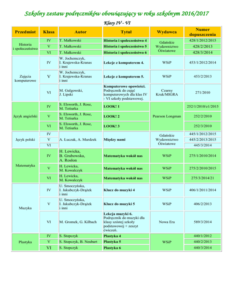 Szkolny zestaw podręczników obowiązujący w roku szkolnym 2016/2017 Klasy IV - VI Przedmiot Historia i społeczeństwo Zajęcia komputerowe Język angielski Klasa Tytuł Autor IV T. Małkowski Historia i społeczeństwo 4 V T. Małkowski Historia i społeczeństwo 5 VI T. Małkowski Historia i społeczeństwo 6 IV W. Jochemczyk, I. Krajewska-Kranas i inni V 428/1/2012/2015 Lekcje z komputerem 4. WSiP 453/1/2012/2014 W. Jochemczyk, I. Krajewska-Kranas i inni Lekcje z komputerem 5. WSiP 453/2/2013 VI M. Gulgowski, J. Lipski Komputerowe opowieści. Podręcznik do zajęć komputerowych dla klas IV - VI szkoły podstawowej. Czarny Kruk/MIGRA 271/2010 IV S. Elsworth, J. Rose, M. Tetiurka LOOK! 1 V S. Elsworth, J. Rose, M. Tetiurka LOOK! 2 VI S. Elsworth, J. Rose, M. Tetiurka LOOK! 3 V A. Łuczak, A. Murdzek Między nami VI Matematyka 428/2/2013 428/3/2014 252/1/2010/z1/2015 Pearson Longman 252/2/2010 252/3/2010 Gdańskie Wydawnictwo Oświatowe 445/1/2012/2015 445/2/2013/2015 445/3/2014 IV H. Lewicka, B. Grabowska, A. Rosłon Matematyka wokół nas WSiP 275/1/2010/2014 V H. Lewicka, M. Kowalczyk Matematyka wokół nas WSiP 275/2/2010/2015 VI H. Lewicka, M. Kowalczyk Matematyka wokół nas WSiP 275/3/2014/21 IV U. Smoczyńska, I. Jakubczyk-Drążek i inni Klucz do muzyki 4 WSiP 406/1/2011/2014 V U. Smoczyńska, I. Jakubczyk-Drążek i inni Klucz do muzyki 5 WSiP 406/2/2013 VI M. Gromek, G. Kilbach Lekcja muzyki 6. Podręcznik do muzyki dla klasy szóstej szkoły podstawowej + zeszyt ćwiczeń. Nowa Era 589/3/2014 IV S. Stopczyk Plastyka 4 V S. Stopczyk, B. Neubart Plastyka 5 VI S. Stopczyk Plastyka 6 Muzyka Plastyka Numer dopuszczenia Gdańskie Wydawnictwo Oświatowe IV Język polski Wydawca 440/1/2012 WSiP 440/2/2013 440/3/2014 Zajęcia techniczne Przyroda Religia IV E. Bubak, M. Duda, E. Królicka Technika na co dzień. Zajęcia techniczne WSiP 496/2,3/2012/2015 V B. Bogacka-Osińska, D. Łazuchiewicz Bądź bezpieczny na drodze WSiP 496/1/2012 VI B. Stanecka, Cz. Stanecki Zajęcia techniczne cz. 2 STANPOL 321/3/2012 IV E. Gromek, E. Kłos i inni Przyrodo, witaj! WSiP 530/1/2012 V E. Gromek, E. Kłos i inni Przyrodo, witaj! WSiP 530/2/2013 VI J. Stawak, F. Szlajfer, H. Kowalczyk Tajemnice przyrody Nowa Era 399/3/2014 IV Ks. prof. J. Szpet, D. Jackowiak Jestem chrześcijaninem V Ks. prof. J. Szpet, D. Jackowiak Wierzę w Boga VI Ks. prof. J. Szpet, D. Jackowiak Wierzę w Kościół AZ-21-01/10-PO-1/11 Święty Wojciech AZ-22-01/10-PO-1/12 AZ-23-01/10-PO-2/13