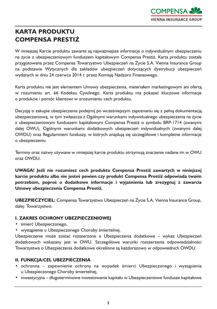 KARTA PRODUKTU COMPENSA PRESTIŻ W niniejszej Karcie produktu zawarte są najważniejsze informacje o indywidualnym ubezpieczeniu na życie z ubezpieczeniowym funduszem kapitałowym Compensa Prestiż. Karta produktu została przygotowana przez Compensa Towarzystwo Ubezpieczeń na Życie S.A. Vienna Insurance Group na podstawie Wytycznych dla zakładów ubezpieczeń dotyczących dystrybucji ubezpieczeń wydanych w dniu 24 czerwca 2014 r. przez Komisję Nadzoru Finansowego. Karta produktu nie jest elementem Umowy ubezpieczenia, materiałem marketingowym ani ofertą w rozumieniu art. 66 Kodeksu Cywilnego. Karta produktu ma pokazać kluczowe informacje o produkcie i pomóc klientowi w zrozumieniu cech produktu. Decyzję o zakupie ubezpieczenia podejmij po wcześniejszym zapoznaniu się z pełną dokumentacją ubezpieczeniową, w tym zwłaszcza z Ogólnymi warunkami indywidualnego ubezpieczenia na życie z ubezpieczeniowym funduszem kapitałowym Compensa Prestiż o symbolu BRP-1714 (zwanymi dalej OWU), Ogólnymi warunkami dodatkowych ubezpieczeń indywidualnych (zwanymi dalej OWDU) oraz Regulaminem funduszy, w których znajdują się szczegółowe i kompletne informacje o ubezpieczeniu. Terminy oraz nazwy używane w niniejszej karcie produktu otrzymują znaczenie nadane im w OWU oraz OWDU. UWAGA! Jeśli nie rozumiesz cech produktu Compensa Prestiż zawartych w niniejszej karcie produktu albo nie jesteś pewien czy produkt Compensa Prestiż odpowiada twoim potrzebom, poproś o dodatkowe informacje i wyjaśnienia lub zrezygnuj z zawarcia Umowy ubezpieczenia Compensa Prestiż. UBEZPIECZYCIEL: Compensa Towarzystwo Ubezpieczeń na Życie S.A. Vienna Insurance Group, dalej: Towarzystwo. I. ZAKRES OCHRONY UBEZPIECZENIOWEJ • śmierć Ubezpieczonego, • wystąpienie u Ubezpieczonego Choroby śmiertelnej. Ubezpieczenie może zostać rozszerzone o Ubezpieczenia dodatkowe – wykaz Ubezpieczeń dodatkowych wskazany jest w OWU. Szczegółowe warunki rozszerzenia odpowiedzialności Towarzystwa o Ubezpieczenia dodatkowe określone są każdorazowo w odpowiednich OWDU. II. FUNKCJA/CEL UBEZPIECZENIA • ochronna – zapewnienie ochrony na wypadek śmierci Ubezpieczonego i wystąpienia u Ubezpieczonego Choroby śmiertelnej, • inwestycyjna – długoterminowe inwestowanie kapitału w Ubezpieczeniowe fundusze kapitałowe 1 (wykaz Ubezpieczeniowych funduszy kapitałowych dostępnych w produkcie Compensa Prestiż wskazany jest w OWU; polityka inwestycyjna Funduszy, częstotliwość i metoda Wycen, Dzień Wyceny Jednostek Funduszu oraz wysokość opłat za zarządzanie Funduszem określona jest w Regulaminie funduszy). III. CHARAKTERYSTYKA UBEZPIECZENIA Compensa Prestiż to indywidualne ubezpieczenie na życie z ubezpieczeniowym funduszem kapitałowym zawierane na czas nieokreślony. Ubezpieczenie ma charakter ochronno – inwestycyjny, co oznacza, że część wpłacanej przez Ubezpieczającego Składki przeznaczona jest na pokrycie przewidzianej umową ochrony ubezpieczeniowej (zapewnia wypłatę ustalonej sumy ubezpieczenia w przypadku śmierci Ubezpieczonego), a część inwestowana jest w Ubezpieczeniowe fundusze kapitałowe. UWAGA! • rekomendowany minimalny czas trwania Umowy ubezpieczenia to, co najmniej 10 lat, • rozwiązanie Umowy ubezpieczenia przed upływem rekomendowanego minimalnego czasu trwania Umowy ubezpieczenia powoduje wypłatę Wartości Świadczenia inwestycyjnego (Wartość Świadczenia inwestycyjnego nie jest równa wpłaconym Składkom ani środkom zgromadzonym na Indywidualnym rachunku), • inwestycje w Ubezpieczeniowe fundusze kapitałowe mogą przynieść znaczące zyski, ale obarczone są ryzykiem inwestycyjnym ponoszonym wyłącznie przez Ubezpieczającego i Ubezpieczonego – mogą przynieść straty lub wypracować zyski niższe niż oczekiwane, • po stronie Ubezpieczającego i Ubezpieczonego pozostaje ryzyko kursowe zmiany walut – wszelkie zmiany walut dokonywane są po kursach kupna i sprzedaży walut, stosowanych przez bank, w którym prowadzony jest w chwili zmiany rachunek bankowy przeznaczony do wpłat Składek regularnych lub Składek dodatkowych. Do zmiany waluty polskiej na walutę obcą stosuje się kurs sprzedaży, a do zmiany waluty obcej na walutę polska stosuje się kurs kupna. IV. MECHANIZM FUNKCJONOWANIA UBEZPIECZENIA • Ubezpieczający opłaca Składkę w wysokości i terminach potwierdzonych w Polisie, • Towarzystwo świadczy ochroną na wypadek śmierci Ubezpieczonego i wystąpienia u Ubezpieczonego Choroby śmiertelnej i z tego tytułu pobiera opłatę za ochronę ubezpieczeniową, • za część Składki (Składkę funduszową) należną z tytułu Ubezpieczenia podstawowego kupowane są Jednostki Funduszy, wybranych przez Ubezpieczonego, Ubezpieczeniowych funduszy kapitałowych, • część Składki regularnej (Składka ochronna) przeznaczana jest na pokrycie kosztów ochrony ubezpieczeniowej udzielanej przez Towarzystwo z tytułu Ubezpieczeń dodatkowych (Składka ochronna nie jest zamieniana na Jednostki Funduszy), • w każdym czasie Ubezpieczający może wpłacać Składki dodatkowe w dowolnej wysokości, za które kupowane są Jednostki Funduszy, wybranych przez Ubezpieczonego, Ubezpieczeniowych funduszy kapitałowych, • z Indywidualnego rachunku Towarzystwo pobiera opłaty (zgodnie z Tabelą opłat wskazaną w niniejszej karcie produktu), 2 • Ubezpieczający ma prawo do zmiany Umowy ubezpieczenia na umowę ubezpieczenia bezskładkowego z ograniczonym zakresem odpowiedzialności (brak obowiązku opłacania Składek regularnych, brak odpowiedzialności z tytułu Ubezpieczeń dodatkowych), • Ubezpieczający, po upływie 3. Rocznicy ubezpieczenia ma prawo zawiesić opłacanie Składek regularnych na okres od 3 do 12 miesięcy, jeżeli zostały opłacone Składki regularne za okres 3 lat (kolejne zawieszenie możliwe jest po 3 latach od końca poprzedniego zawieszenia, jeżeli zostały opłacone należne Składki regularne za okres 3 la