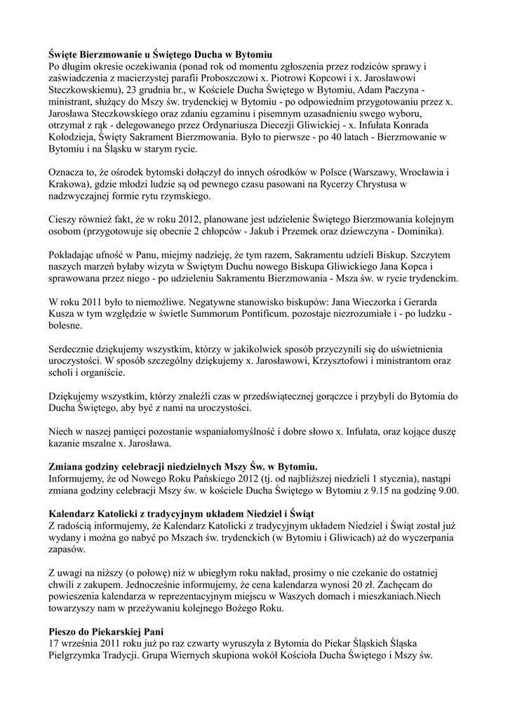 Święte Bierzmowanie u Świętego Ducha w Bytomiu Po długim okresie oczekiwania (ponad rok od momentu zgłoszenia przez rodziców sprawy i zaświadczenia z macierzystej parafii Proboszczowi x. Piotrowi Kopcowi i x. Jarosławowi Steczkowskiemu), 23 grudnia br., w Kościele Ducha Świętego w Bytomiu, Adam Paczyna ministrant, służący do Mszy św. trydenckiej w Bytomiu - po odpowiednim przygotowaniu przez x. Jarosława Steczkowskiego oraz zdaniu egzaminu i pisemnym uzasadnieniu swego wyboru, otrzymał z rąk - delegowanego przez Ordynariusza Diecezji Gliwickiej - x. Infułata Konrada Kołodzieja, Święty Sakrament Bierzmowania. Było to pierwsze - po 40 latach - Bierzmowanie w Bytomiu i na Śląsku w starym rycie. Oznacza to, że ośrodek bytomski dołączył do innych ośrodków w Polsce (Warszawy, Wrocławia i Krakowa), gdzie młodzi ludzie są od pewnego czasu pasowani na Rycerzy Chrystusa w nadzwyczajnej formie rytu rzymskiego. Cieszy również fakt, że w roku 2012, planowane jest udzielenie Świętego Bierzmowania kolejnym osobom (przygotowuje się obecnie 2 chłopców - Jakub i Przemek oraz dziewczyna - Dominika). Pokładając ufność w Panu, miejmy nadzieję, że tym razem, Sakramentu udzieli Biskup. Szczytem naszych marzeń byłaby wizyta w Świętym Duchu nowego Biskupa Gliwickiego Jana Kopca i sprawowana przez niego - po udzieleniu Sakramentu Bierzmowania - Msza św. w rycie trydenckim. W roku 2011 było to niemożliwe. Negatywne stanowisko biskupów: Jana Wieczorka i Gerarda Kusza w tym względzie w świetle Summorum Pontificum. pozostaje niezrozumiałe i - po ludzku bolesne. Serdecznie dziękujemy wszystkim, którzy w jakikolwiek sposób przyczynili się do uświetnienia uroczystości. W sposób szczególny dziękujemy x. Jarosławowi, Krzysztofowi i ministrantom oraz scholi i organiście. Dziękujemy wszystkim, którzy znaleźli czas w przedświątecznej gorączce i przybyli do Bytomia do Ducha Świętego, aby być z nami na uroczystości. Niech w naszej pamięci pozostanie wspaniałomyślność i dobre słowo x. Infułata, oraz kojące duszę kazanie mszalne x. Jarosława. Zmiana godziny celebracji niedzielnych Mszy Św. w Bytomiu. Informujemy, że od Nowego Roku Pańskiego 2012 (tj. od najbliższej niedzieli 1 stycznia), nastąpi zmiana godziny celebracji Mszy św. w kościele Ducha Świętego w Bytomiu z 9.15 na godzinę 9.00. Kalendarz Katolicki z tradycyjnym układem Niedziel i Świąt Z radością informujemy, że Kalendarz Katolicki z tradycyjnym układem Niedziel i Świąt został już wydany i można go nabyć po Mszach św. trydenckich (w Bytomiu i Gliwicach) aż do wyczerpania zapasów. Z uwagi na niższy (o połowę) niż w ubiegłym roku nakład, prosimy o nie czekanie do ostatniej chwili z zakupem. Jednocześnie informujemy, że cena kalendarza wynosi 20 zł. Zachęcam do powieszenia kalendarza w reprezentacyjnym miejscu w Waszych domach i mieszkaniach.Niech towarzyszy nam w przeżywaniu kolejnego Bożego Roku. Pieszo do Piekarskiej Pani 17 września 2011 roku już po raz czwarty wyruszyła z Bytomia do Piekar Śląskich Śląska Pielgrzymka Tradycji. Grupa Wiernych skupiona wokół Kościoła Ducha Świętego i Mszy św. trydenckiej, w tym członkowie i sympatycy Śląskiego Środowiska Wiernych Tradycji Łacińskiej udała się razem ze swoim duszpasterzem x. Jarosławem Steczkowskim oraz ministrantami do Sanktuarium Matki Boskiej Piekarskiej, by pokłonić się Matce Sprawiedliwości i Miłości Społecznej oraz wziąć udział w tradycyjnym nabożeństwie Drogi Krzyżowej na Kalwarii Piekarskiej (według książeczki z 1916 roku). Po drodze była okazja do modlitwy na Różańcu św. oraz przy przydrożnych Krzyżach i przed mijanymi kościołami. W czasie odpoczynku, nie zabrakło także okazji do rozmów. Pielgrzymkę poprzedziła Msza św. cicha przy ołtarzu bocznym św. Józefa w Kościele Ducha Świętego, a zakończyła Koronka do Bożego Miłosierdzia. W duchu pokuty, ale i z wdzięcznością za dar Summorum Pontificum pójdziemy także za rok. Już dziś serdecznie zapraszamy na V Śląską Pielgrzymkę Tradycji. VI Marsz dla Życia i Rodziny Śląskie Środowisko Wiernych Tradycji Łacińskiej wzięło udział w VI Marszu dla Życia i Rodziny w Warszawie, manifestując swoje przywiązanie do cywilizacji łacińskiej, domagając się od prawodawców obrony życia od poczęcia do naturalnej śmierci oraz sprzeciwiając się postępowym aberracjom, które próbują zredefiniować pojęcie małżeństwa i zniszczyć rodzinę. W Marszu wzięło udział wiele organizacji pozarządowych, m.in. SKCh im. Piotra Skargi, KSM, TG Sokół, Akademia Rodziny, Soli Deo, ale także MW i ONR. Porządek uroczystości Wielkiego Tygodnia w kościele Ducha Świętego Wielki Czwartek (21 kwietnia): Liturgia Wieczerzy Pańskiej, godz. 19.00 Wielki Piątek (22 kwietnia): Droga Krzyżowa, Liturgia Męki Pańskiej, godz. 19.00 Wielka Sobota (23 kwietnia): Liturgia Wigilii Paschalnej, godz. 20.30 Wielkanoc (24 kwietnia): Msza święta, godz. 16.00. W czasie liturgii zostanie wykonana msza "Missa Paschalis" Grzegorza Gerwazego Gorczyckiego. "Zawód: Prymas Polski" - Projekcja filmu AKADEMIA RODZINY zaprasza 13 kwietnia (środa), o godzinie 18:00, na projekcję filmu Anny Pietraszek Zawód: Prymas Polski z udziałem autorki. Po filmie dyskusja z udziałem prof. Jana Żaryna i Anny Rastawickiej z Instytutu Prymasowskiego więcej szczegółów tutaj. Z okazji Narodowego święta 3 Maja, Akademia Rodziny ma zaszczyt zaprosić Państwa na wyjątkowy koncert, który odbędzie się w naszym Centrum Edukacyjnym 3 maja, o godzinie 19:00. Wystąpi: Jacek Kowalski z zespołem Monogramista JK. Koncert pieśni sarmackich i patriotycznych, które tak rzadko ostatnio śpiewamy, będzie nas uczył, przypominał i podnosił ducha! Mam nadzieję, że nikogo z Państwa na nim nie zabraknie. Bilety w cenie 35 zł do nabycia w środę na spotkaniu, lub w salonie wydawniczym Czas przy ul. Zwy