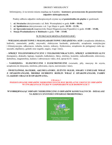 DRODZY MIESZKAŃCY Informujemy, iż na terenie miasta znajdują się 4 punkty - kontenery przeznaczone do pozostawiania odpadów niebezpiecznych. Punkty odbioru odpadów niebezpiecznych czynne są od poniedziałku do piątku w godzinach: 1. 2. 3. 4. ul. Strażacka (skrzyżowanie z ul. Boh. Westerplatte) w godz. 8:00 – 10:00, ul. Spółdzielcza (skrzyżowanie z ul. 3-go Maja) w godz. 10:30 – 12:30, ul. Sprzymierzonych (naprzeciwko Stacji Diagnostycznej Pojazdów) w godz. 13:00 – 15:00, Stacja Przeładunkowa w Robitach w godz. 7:00 – 15:00. W PUNKTACH MOŻNA POZOSTAWIĆ: - WIELKOGABARYTOWE I MAŁOGABARYTOWE URZĄDZENIA AGD ( urządzenia chłodnicze, lodówki, zamrażarki, pralki, zmywarki, elektryczne kuchenki, piekarniki, urządzenia wentylacyjne i klimatyzacyjne, odkurzacze, żelazka, tostery, miksery, frytkownice, urządzenia do pielęgnacji ciała np.: suszarki, depilatory, golarki oraz zegarki, zegary, wagi i inne), - SPRZĘT TELEINFORMATYCZNY I TELEKOMUNIKACYJNY, SPRZĘT AUDIOWIZUALNY (komputery, drukarki, laptopy, kopiarki, kalkulatory, faksy, telefony, komórki, radioodbiorniki, telewizory, dyktafony, magnetofony, kamery i odtwarzacze video, dvd, sprzęt hi-fi i inne), - NARZĘDZIA ELEKTRYCZNE I ELEKTRONICZNE (wiertarki, piły, maszyny do szycia, urządzenia do skręcania, mielenia, piłowania, cięcia, nawiercania i inne), - ŚWIETLÓWKI, BATERIE, AKUMULATORY, ZUŻYTE OLEJE, SMARY I EMULSJE WRAZ Z OPAKOWANIAMI, ŚRODKI OCHRONY ROŚLIN WRAZ Z OPAKOWANIAMI, FARBY I LAKIERY ORAZ ICH OPAKOWANIA. UWAGA ! POZOSTAWIANIE ODPADÓW NIEBEZPIECZNYCH JEST BEZPŁATNE I DOTYCZY ODPADÓW WYTWARZANYCH TYLKO W GOSPODARSTWACH DOMOWYCH !!! WYOBRĘBNIAJĄC ODPADY NIEBEZPIECZNE Z ODPADÓW KOMUNALNYCH – DZIAŁASZ NA RZECZ CZYSTOŚCI SWOJEGO ŚRODOWISKA