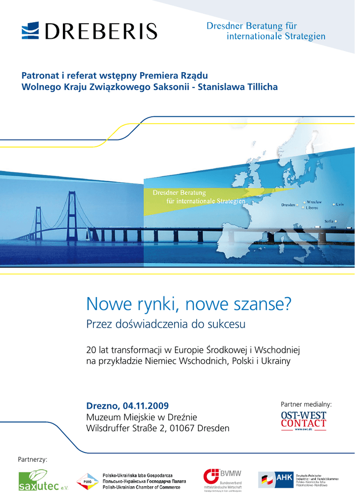 Patronat i referat wstępny Premiera Rządu Wolnego Kraju Związkowego Saksonii - Stanislawa Tillicha Nowe rynki, nowe szanse? Przez doświadczenia do sukcesu 20 lat transformacji w Europie Środkowej i Wschodniej na przykładzie Niemiec Wschodnich, Polski i Ukrainy Drezno, 04.11.2009 Muzeum Miejskie w Dreźnie Wilsdruffer Straße 2, 01067 Dresden Partnerzy: Partner medialny: Program: 14:00 Powitanie Moderacja: Paweł Moras, Dyrektor Polsko-Niemieckiej Współpracy Młodzieży 14:20 – 15:30 CZĘŚĆ I: OSIĄGNIĘCIA I PERSPEKTYWY 14:2020 lat transformacji – dotychczasowe doświadczenia Saksonii, przewidywane szanse i zagrożenia. Strategiczne cele dla kraju związkowego i rozszerzonej Europy Stanislaw Tillich, Premier kraju związkowego Saksonia 15:00 T ransformacja gospodarcza w Europie Środkowej i Wschodniej, podstawy niezależnego rozwoju i długofalowa konkurencyjność Regionu Prof. Dr Ulrich Blum, Dyrektor Instytutu Badań nad Gospodarką w Halle 15:30 Przerwa na kawę 16:00 – 18:00 CZĘŚĆ II: NOWE RYNKI, NOWE SZANSE? Doświadczenia przedsiębiorców i dyskusja panelowa Moderacja: Lars Bosse, Dyrektor Generalny Polsko-Niemieckiej Izby Przemysłowo-Handlowej oświadczenia przedsiębiorców na międzynarodowych rynkach D przemysłowych, usługowych i technologii proekologicznych – wypowiedzi i dyskusja panelowa Statements: Małgorzata Olszewska, Dyrektor Solaris Deutschland GmbH Johannes Pohl, Dyrektor techniczny Stadtentwässerung Dresden GmbH Zbigniew Drzymała, Konsul honorowy Ukrainy, Prezes Inter Groclin Auto S.A. Jacek Piechota, Prezes Polsko-Ukraińskiej Izby Gospodarczej, były Minister Gospodarki RP Dr Markus Reichel, Prezes DREBERIS GmbH Thilo Lehmann, Dyrektor Lehmann Maschinenbau GmbH Rostyslaw Soroka, Minister Gospodarki Okręgu Lwowskiego Dyskusja panelowa 18:00 Bankiet Zapraszamy do wzięcia udziału w tym szczególnym wydarzeniu! Szanowni Państwo! W 2009 roku obchodzimy 20-tą rocznicę przełomu politycznego z roku 1989, który stanowił wstep do szeregu transformacji krajów Europy Środkowej i Wschodniej. Od tego czasu kraje, których dotyczył ów przełom rozwinęły się do poziomu sprawnie funkcjonujących gospodarek rynkowych. Kraje związkowe dawnej NRD miały przy tym okazję przejąć rolę pioniera, z rozwiązań którego skorzystać mogły pozostałe kraje środkowo- i wschodnioeuropejskie. Z tej okazji zapraszamy Państwa serdecznie do udziału w Konferecji „Nowe rynki, nowe szanse?”. Jej celem jest przedstawienie doświadczeń ostatnich 20 lat, wskazanie szans i potencjału następnego dziesięciolecia. Ponadto zapraszamy do dyskusji na temat politycznych i gospodarczych zmian w trzech reprezentatywnych krajach: Niemczech Wschodnich (Saksonii), Polsce i na Ukrainie. Referaty wstępne wygłoszą Premier Rządu Kraju Związkowego Saksonii – Stanislaw Tillich oraz Prof. Dr Ulrich Blum − Dyrektor Instytutu Badań nad Gospodarką w Halle. Dodatkowo odnoszące dziś sukcesy na miedzynarodowych rynkach przedsiębiorstwa przedstawią swoje praktyczne doświadczenia, gospodarcze osiągnięcia oraz wnioski ostatnich 20-tu lat, jak również omówią najciekawsze aspekty kooperacji w Europie Środkowej i Wschodniej. Następnie będą Państwo mieli okazję wymienić się swoimi opiniami w ramach dyskusji panelowej. Konferencja zakończy się bankietem, który będzie również okazją do prowadzenia dalszych, interesujących rozmów. Serdecznie zapraszamy i cieszymy się na Państwa przybycie! Z wyrazami szacunku, Dr Markus Reichel, Prezes DREBERIS GmbH OrganiZator: DREBERIS - Międzynarodowe Strategie Biznesowe Wizja. Realizacja. Sukces. Państwa cel jest naszym zadaniem! Państwa partner o fachowej wiedzy i kompetencjach interkulturowych z siedzibą w Dreźnie i filiami w Polsce, Czechach, Bułgarii i na Ukrainie. Od 10 lat doradzamy przedsiębiorstwom i instytucjom państwowym przy przeprowadzaniu projektów międzynarodowych. www.dreberis.com PartnerZY: Saksońskie Stowarzyszenie Międzynarodowej Ochrony Środowiska i Technologii Proekologicznych www.saxutec.de Polsko-Ukraińska Izba Gospodarcza www.puizba.pl Federalne Stowarzyszenie Gospodarcze Małej i Średniej Przedsiębiorczości Przedstawicielstwo w Polsce południowo-zachodniej www.bvmw.de Polsko-Niemiecka Izba Przemysłowo-Handlowa www.ihk.pl Partner medialny: OWC Wydawnictwo Handlu Zagranicznego www.owc.de Aby zapewnić sobie miejsce... ZGŁOŚ SIĘ JESZCZE DZIŚ! Państwa zgłoszenie prosimy przesłać faxem na numer: + 49 351 871 84 48. Niniejszym zgłaszam swój udział w konferencji: Nowe rynki, nowe szanse? Przez doświadczenia do sukcesu w Dreźnie, 04.11.2009: Imię i nazwisko . ........................................................................................................................................... Nazwa firmy ................................................................................................................................................. Ulica ............................................................................................................................................................. Kod pocztowy / miejscowość ....................................................................................................................... Telefon ......................................................................................................................................................... E-Mail . ......................................................................................................................................................... Internet ........................................................................................................................................................ Data, podpis . ............................................................................................................................................... Liczba miejsc ograniczona! Warunki uczestnictwa: Opłata uczestn