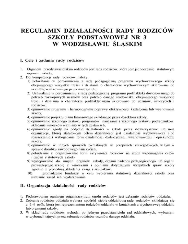 REGULAMIN DZIAŁALNOŚCI RADY RODZICÓW SZKOŁY PODSTAWOWEJ NR 3 W WODZISŁAWIU ŚLĄSKIM I. Cele i zadania rady rodziców Organem przedstawicielskim rodziców jest rada rodziców, która jest jednocześnie statutowym organem szkoły. 2. Do kompetencji rady rodziców należy: 1) Uchwalanie w porozumieniu z radą pedagogiczną programu wychowawczego szkoły obejmującego wszystkie treści i działania o charakterze wychowawczym skierowane do uczniów, realizowanego przez nauczycieli, 2) Uchwalanie w porozumieniu z radą pedagogiczną programu profilaktyki dostosowanego do potrzeb rozwojowych uczniów oraz potrzeb danego środowiska, obejmującego wszystkie treści i działania o charakterze profilaktycznym skierowane do uczniów, nauczycieli i rodziców, 3) opiniowanie programu i harmonogramu poprawy efektywności kształcenia lub wychowania szkoły, 4) opiniowanie projektu planu finansowego składanego przez dyrektora szkoły, 5) opiniowanie szkolnego zestawu programów nauczania i szkolnego zestawu podręczników, składanie wniosków o zmiany w tych zestawach, 6) opiniowanie zgody na podjęcie działalności w szkole przez stowarzyszenie lub inną organizację, której statutowym celem działalności jest działalność wychowawcza albo rozszerzanie i wzbogacanie form działalności dydaktycznej, wychowawczej i opiekuńczej szkoły, 7) opiniowanie w innych sprawach określonych w przepisach szczegółowych, w tym w sprawie dorobku zawodowego nauczycieli, 8) pobudzanie i organizowanie form aktywności rodziców na rzecz wspomagania celów i zadań statutowych szkoły 9) występowanie do innych organów szkoły, organu nadzoru pedagogicznego lub organu prowadzącego szkołę z wnioskami i opiniami dotyczącymi wszystkich spraw szkoły zgodnie z procedurą składania skarg i wniosków, 10) gromadzenie funduszy w celu wspierania statutowej działalności szkoły oraz ustalanie zasad ich wydatkowania 1. II. Organizacja działalności rady rodziców 1. Podstawowym ogniwem organizacyjnym ogółu rodziców jest zebranie rodziców oddziału, 2. Zebranie rodziców oddziału wybiera spośród siebie oddziałową radę rodziców składającą się z 3-4 osób, ktora jest reprezentantem rodziców oddziału w kontaktach z wychowawcą oddziału lub organami szkoły, 3. W skład rady rodziców wchodzi po jednym przedstawicielu rad oddziałowych, wybranym w wyborach tajnych przez zebranie rodziców uczniów danego oddziału. 2 4. W wyborach, o których mowa w pkt. 2 i 3, jednego ucznia reprezentuje jeden rodzic. Wybory przeprowadza się na pierwszym zebraniu rodziców w każdym roku szkolnym. 5. Działalnością rady rodziców kieruje prezydium rady rodziców. 6. Na pierwszym posiedzeniu w danym roku szkolnym plenarne zebranie rady rodziców szkoły wybiera spośród siebie w wyborach jawnych: a) przewodniczącego, wiceprzewodniczącego sekretarza i skarbnika oraz dwóch członków tworzących prezydium rady rodziców jako wewnętrzny organ kierujący pracami rady rodziców b) komisję rewizyjną, jako wewnętrzny organ kontrolny rady rodziców. 7. Prezydium rady rodziców składa się z maksymalnie 6 członków. 8. Komisja rewizyjna składa się z 3 osób. Członkowie komisji rewizyjnej wybierają przewodniczącego i zastępcę na pierwszym swoim posiedzeniu. 9. Kadencja rady rodziców i jej organów trwa 1 rok. 10. Rada rodziców może powołać stałe lub doraźne komisje spośród rodziców i osób współdziałających dla wykonania określonych zadań. 11. Rada rodziców corocznie we wrześniu, na zebraniu ogółu rodziców szkoły, składa sprawozdanie ze swojej działalności. III. Tryb podejmowania wewnętrzne uchwał przez radę rodziców i jej organy 1. Uchwały podejmuje się zwykłą większością głosów. 2. Listę uczestników zebrania danego organu oraz quorum ustala każdorazowo przewodniczący zebrania. 3. Uchwały są protokołowane w protokolarzu rady rodziców szkoły. Za protokolarz rady rodziców i jego prawidłowe prowadzenie odpowiada sekretarz prezydium rady. 4. Zebranie rady rodziców jest prawomocne do podejmowania uchwał przy obecności co najmniej 1/3 członków, a zebrania prezydium rady są prawomocne do podejmowania uchwał przy obecności co najmniej 1/2 członków prezydium IV. Wybory do organów rady rodziców 1. Wybory do rady rodziców przeprowadza się na pierwszym zebraniu rodziców w każdym roku szkolnym, a do jej organów na pierwszym zebraniu rady rodziców w danym roku szkolnym. 2. Lista kandydatów do danego organu nie może być mniejsza od liczby miejsc ustalonych dla danego organu. Zgłoszeni kandydaci muszą wyrazić ustnie lub pisemnie ( jeśli nie mogą wziąć udziału w zebraniu wyborczym ) swoją zgodę na kandydowanie. 3. Wybrani zostają ci kandydaci, którzy uzyskali największą liczbę głosów uczestników prawomocnego zebrania. 4. Przy równej ilości uzyskanych głosów uniemożliwiającej dokonanie wyboru zarządza się ponowne głosowanie. 5. Nowo wybrane organy mają obowiązek ukonstytuowania się na pierwszym swoim posiedzeniu. 3 6. Ustala się następujący porządek obrad zebrania sprawozdawczo-wyborczego rady rodziców : a) wybór przewodniczącego, wiceprzewodniczącego sekretarza i skarbnika oraz dwóch członków tworzących prezydium rady rodziców. Wybory do tych funkcji są jawne. b) Sprawozdanie ustępującego organu z działalności w okresie sprawozdawczym. c) Sprawozdanie komisji rewizyjnej i wniosek o udzielenie absolutorium ustępującemu organowi. d) Informacja dyrektora szkoły o stanie organizacyjnym i funkcjonowaniu placówki. e) Ewentualne wystąpienia zaproszonych przedstawicieli innych organów szkoły lub organizacji. f) Plenarna dyskusja programowa. g) Uchwalenie wniosków programowo - organizacyjnych do działalności rady rodziców w następnej kadencji. h) Wybory nowych organów rady rodziców - ustalenie przez komisję skrutacyjną listy obecności i stwierdzenie prawomocności zebrania - przypomnienie za