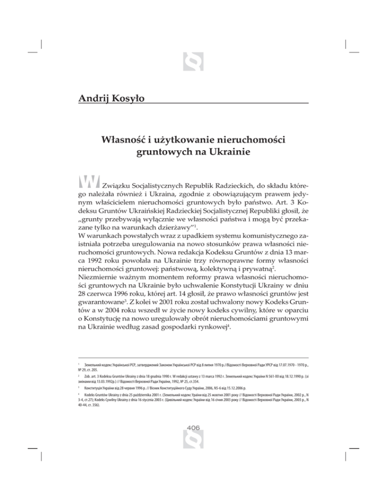 B1SBXB A Własność i użytkowanie nieruchomości gruntowych na Ukrainie 8 Związku Socjalistycznych Republik Radzieckich, do składu którego należała również i Ukraina, zgodnie z obowiązującym prawem jedynym właścicielem nieruchomości gruntowych było państwo. Art. 3 Kodeksu Gruntów Ukraińskiej Radzieckiej Socjalistycznej Republiki głosił, że „grunty przebywają wyłącznie we własności państwa i mogą być przekazane tylko na warunkach dzierżawy”1. W warunkach powstałych wraz z upadkiem systemu komunistycznego zaistniała potrzeba uregulowania na nowo stosunków prawa własności nieruchomości gruntowych. Nowa redakcja Kodeksu Gruntów z dnia 13 marca 1992 roku powołała na Ukrainie trzy równoprawne formy własności nieruchomości gruntowej: państwową, kolektywną i prywatną2. Niezmiernie ważnym momentem reformy prawa własności nieruchomości gruntowych na Ukrainie było uchwalenie Konstytucji Ukrainy w dniu 28 czerwca 1996 roku, której art. 14 głosił, że prawo własności gruntów jest gwarantowane3. Z kolei w 2001 roku został uchwalony nowy Kodeks Gruntów a w 2004 roku wszedł w życie nowy kodeks cywilny, które w oparciu o Konstytucję na nowo uregulowały obrót nieruchomościami gruntowymi na Ukrainie według zasad gospodarki rynkowej4. ǦȓȚȓșȪțȖȗȘȜȒȓȘȟDzȘȞȍȴțȟȪȘȜȴǯǰǯȕȍȠȏȓȞȒȔȓțȖȗǦȍȘȜțȜȚDzȘȞȍȴțȟȪȘȜȴǯǰǯȏȳȒșȖȝțȭȞǠȳȒȜȚȜȟȠȳǠȓȞȣȜȏțȜȴǯȍȒȖDzǯǰǯȏJȒȞ ȿȟȠ ;PCBSU,PEFLTV(SVOUØX6LSBJOZ[EOJBHSVEOJBS8SFEBLDKJVTUBXZ[NBSDBSǦȓȚȓșȪțȖȗȘȜȒȓȘȟDzȘȞȍȴțȖ/9**ȏȳȒȞȕȳ ȕȚȳțȍȚȖȏȳȒȞ ǠȳȒȜȚȜȟȠȳǠȓȞȣȜȏțȜȴǯȍȒȖDzȘȞȍȴțȖȿȟȠ ǩȜțȟȠȖȠȡȤȳȭDzȘȞȍȴțȖȏȳȒȥȓȞȏțȭȞǠȳȟțȖȘǩȜțȟȠȖȠȡȤȳȗțȜȐȜǰȡȒȡDzȘȞȍȴțȖ/ȏȳȒȞ ,PEFLT(SVOUØX6LSBJOZ[EOJBQBƑE[JFSOJLBSǦȓȚȓșȪțȖȗȘȜȒȓȘȟDzȞȍȴțȖȏȳȒȔȜȏȠțȭȞȜȘȡǠȳȒȜȚȜȟȠȳǠȓȞȣȜȏțȜȴǯȍȒȖDzȘȞȍȴțȖȞ/ ȟȠ ,PEFLT$ZXJMOZ6LSBJOZ[EOJBTUZD[OJBSǵȖȏȳșȪțȖȗȘȜȒȓȘȟDzȘȞȍȴțȖȏȳȒȟȳȥțȭȞȜȘȡǠȳȒȜȚȜȟȠȳǠȓȞȣȜȏțȜȴǯȍȒȖDzȘȞȍȴțȖȞ/ ȟȠ B1SBXB PRAWO WŁASNOŚCI NIERUCHOMOŚCI GRUNTOWYCH Prawo własności nieruchomości gruntowych w prawie ukraińskim jest rozumiane jako prawo posiadania, użytkowania oraz rozporządzania gruntami. Kodeks Gruntów (dalej – KG) przewiduje, że grunty na Ukrainie mogą przebywać we własności prywatnej, gminy bądź państwowej (art. 78 KG). Grunty na Ukrainie nie są zwracane osobom którym zostały one odebrane w okresie panowania komunizmu. Wynika to z art. 78 KG, który głosi, że osobom (ich spadkobiercom), którzy byli właścicielami gruntów do dnia 15 maja 1992 r. (data wejścia w życie KG) nieruchomości gruntowe nie są zwracane. W prawie ukraińskim podmiotami prawa własności gruntów mogą być: þ o o oo o o !o"# watnej, þ g#$% & #'( o' o o"#o () organy samorządu terytorialnego – co do gruntów własności gmin, þ po% & #' o o o ! powej – co do gruntów własności państwowej (art. 80 KG). Grunty na Ukrainie wedle przeznaczenia celowego klasyfikowane są w następujący sposób: grunty rolne; grunty mieszkaniowej i społecznej zabudowy; grunty rezerwatów przyrodniczych; grunty przeznaczone dla celów uzdrowiskowych; grunty przeznaczone dla celów rekreacyjnych; grunty dla celów historyczno-kulturalnych; grunty leśne; grunty wodne; grunty przemysłowe, dla celów rozmieszczenia infrastruktury transportu, komunikacji, energetyki, obrony państwa oraz przeznaczone dla innych celów. Przepisy przewidują odrębny status prawny dla każdej z tych kategorii gruntów (art. 19 KG)3. NABYCIE GRUNTÓW PRZEZ OBYWATELI UKRAINY, ,PEFLT(SVOUØXQS[F[QPKŢDJFvPCZXBUFMwSP[VNJFPCZXBUFMB6LSBJOZPCZXBUFMBJOOFHPQBŴTUXBDVE[P[JFNDB PSB[PTPCŢOJFQPTJBEBKŕDŕƒBEOFHPPCZXBUFM TUXB 1PKFDJFvHNJOBwXVLSBJŴTLJFKUFSNJOPMPHJJQSBXOJD[FKKFTUVƒZXBOFKBLPvXTQØMOPUBUFSZUPSJBMOBwoVLSȠȓȞȖȠȜȞȳȍșȪțȍȐȞȜȚȍȒȍ ;NJBOBQS[F[OBD[FOJBLBUFHPSJJ HSVOUØXVSFHVMPXBOBKFTUX5SZCJF[NJBOZQS[F[OBD[FOJBDFMPXFHPHSVOUØXLUØSFTŕXFXBTOPžDJPCZXBUFMJMVCPTØCQSBX OZDI[BUXJFSE[POZN1PTUBOPXJFOJFN(BCJOFUV.JOJTUSØX6LSBJOZ[EOJBLXJFUOJBSOS;HPEOJF[UZNBLUFNQSBXOZNXOJPTFLP[NJBOJFQS[F[OBD[FOJB DFMPXFHPPEOJFTJFOJVHSVOUVEPJOOFKLBUFHPSJJ SP[QP[OBKFPEQPXJFEOJBSBEBHNJOZOBUFSFOJFLUØSFK[OBKEVKFTJŢUBE[JBLB+FƒFMJHSVOU[OBKEVKFTJŢQP[BHSBOJDBNJ HNJOZUPXOJPTFLSP[QP[OBKFBENJOJTUSBDKBQBŴTUXPXBXSFKPOJFPEQPXJFEOJLQPXJBUV ;LPMFJPEOJFTJFOJFEPJOOFKLBUFHPSJJHSVOUØXSPMOZDIMBTØXHSVOUØX QS[F[OBD[POZDIEMBDFMØXSFLSFBDZKOZDIoUPKVƒLPNQFUFODKB(BCJOFUV.JOJTUSØX6LSBJOZǮȜȟȠȍțȜȏȍǩȍȎȳțȓȠȡǫȳțȳȟȠȞȳȏDzȘȞȍȴțȖȏȳȒȘȏȳȠțȭȞ/jǮȞȜ ȕȍȠȏȓȞȒȔȓțțȭǮȜȞȭȒȘȡȕȚȳțȖȤȳșȪȜȏȜȐȜȝȞȖȕțȍȥȓțțȭȕȓȚȓșȪȭȘȳȝȓȞȓȎȡȏȍȬȠȪȡȏșȍȟțȜȟȠȳȐȞȜȚȍȒȭțȍȎȜȬȞȖȒȖȥțȖȣȜȟȳȎxǭȢȳȤȳȗțȖȗǠȳȟțȖȘDzȘȞȍȴțȖ /ȟȠ B1SBXB UKRAIŃSKIE OSOBY PRAWNE Obywatele Ukrainy nabywają prawo własności do gruntów na podstawie: þ g &u*% % o#% g#% #+ umów cywilnoprawnych, þ !o &# #g po+ *(cych do gminy; þ '# % & "#' ! #+ o##% þ &o#% þ # *+ #g w"# ,'-. Osoby prawne (założone przez obywateli Ukrainy bądź ukraińskie osoby prawne) mogą nabywać grunty, w tym grunty rolne2, w celu prowadzenia działalności przedsiębiorczej w następujących wypadkach: þ o# g &u*% % o#% g#ny, innych umów cywilnoprawnych, þ ### '&o o o &#! !o*#&#o /my, þ &o#% þ #+ &+ ##+ #0. Ukraińskie prawo gruntów zawiera interesujące regulacje dotyczące bezpłatnego przekazania obywatelom Ukrainy gruntów z zasobów państwowych lub gminy. W szczególności, każdemu obywatelowi przysługuje prawo otrzymania bezpłatnie na własność gruntów w takich rozmiarach dla następujących celów: þ o# oo o#o og# #!&#% którą na terytorium danej gminy otrzymał każdy obywatel-członek zreformowanego gospodarst