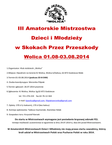 III Amatorskie Mistrzostwa Dzieci i Młodzieży w Skokach Przez Przeszkody Wolica 01.08-03.08.2014 1.Organizator: Klub Jeździecki „Wolica” 2.Miejsce: Hipodrom na terenie KJ Wolica, Wolica k/Kalisza, 62-872 Godziesze Małe 3.Termin:01-03.08.2014 (podczas ZO-B DiM) 4. Osoba koordynująca: Weronika Filipiak 5.Termin zgłoszeń: 26.07.2014 pisemnie 6.Zgłoszenia: KJ Wolica, Wolica 1g,62-872 Godziesze tel. 721-276-224 fax.62-76-12-564 e-mail: [email protected], [email protected] 7. Opłaty: 370 zł (z boksem), 170 zł (bez boksu) 8. Komisja sędziowska: Tadeusz Szymoniak, Stanisław Helak 9. Gospodarz toru: Krzysztof Kierzek Do startu w Mistrzostwach wymagane jest posiadanie brązowej odznaki PZJ. Istnieje możliwość uczestnictwa w egzaminie w dniu 29.07.2014 tj. dwa dni przed Mistrzostwami. W Amatorskich Mistrzostwach Dzieci i Młodzieży nie mają prawa startu zawodnicy, którzy brali udział w Mistrzostwach Polski oraz Pucharze Polski w roku 2014. 10. Mistrzostwa rozegrane zostaną w czterech grupach: Grupa I zawodnicy do lat 12 na kucach (2002 rocznik i więcej) – konkursy wys. 50/60 cm Grupa II zawodnicy od 13 do 18 lat na kucach do 140 cm (gr. B i C) – konkursy wys. 70/75 cm Grupa III zawodnicy od 13 do 18 lat na kucach i małych koniach do 156 cm (gr.D i E) –konkursy wys. 80/85cm Grupa IV zawodnicy od 12 do 18 lat na koniach powyżej 156 cm –konkursy wys. 90/95cm PROGRAM ZAWODÓW: Piątek 01.08.2014 (przed konkursami ZO-B DiM) I półfinał Grupa I 50 cm I półfinał Grupa II 70 cm I półfinał Grupa III 80 cm I półfinał Grupa IV 90 cm Sobota 02.08.2014 (przed konkursami ZO-B DiM) II półfinał Grupa I 50 cm II półfinał Grupa II 70 cm II półfinał Grupa III 80 cm II półfinał Grupa IV 90 cm Niedziela 03.08.2014 (przed konkursami ZO-B DiM) I nawrót finał Grupa I 50, II nawrót finału 60 cm I nawrót finał Grupa II 70, II nawrót finału 75 cm I nawrót finał Grupa III 80, II nawrót finału 85 cm I nawrót finał Grupa IV 90, II nawrót finału 95 cm Nagrody: - flots dla wszystkich, którzy ukończą finały - nagrody honorowe (medale, puchary) dla pierwszej trójki w każdej grupie. - nagrody rzeczowe za 3 pierwsze miejsca w każdej grupie. Warunki uczestnictwa i rozgrywania Amatorskich Mistrzostw Dzieci i Młodzieży w Skokach Przez Przeszkody 1. Zawodnicy startują w czterech grupach w zależności od wieku i wzrostu konia. Grupa I zawodnicy do lat 12 na kucach (2002 rocznik i więcej) – konkursy wys. 50/60 cm Grupa II zawodnicy od 13 do 18 lat na kucach do 140 cm (gr. B i C) – konkursy wys. 70/75 cm Grupa III zawodnicy od 13 do 18 lat na kucach i małych koniach do 156 cm (gr.D i E) – konkursy wys.80/85cm Grupa IV zawodnicy od 12 do 18 lat na koniach powyżej 156 cm – konkursy wys.90/95cm 2. Każdy uczestnik musi posiadać przynajmniej brązową odznakę jeździecką PZJ 3. Uczestnicy muszą posiadać ważne badania lekarskie i zgodę rodziców na udział w zawodach. 4. W półfinałach zawodnik ma prawo startu na dwóch koniach. Do wyniku zaliczany będzie lepszy przejazd w danym półfinale. W finale zawodnik może startować tylko na jednym wybranym przez siebie koniu, na którym ukończył przynajmniej jeden półfinał. 5. Półfinały rozegrane zostaną jako konkursy dokładności – art. 238.1.1,finał jako dwunawrotowy konkurs dokładności – art. 238.1.1. Zwycięży ten zawodnik, który uzyska najmniejszą ilość punktów karnych w dwóch półfinałach i finale. Przy równej ilości punktów karnych na miejscach medalowych przeprowadzona zostanie rozgrywka na zasadach konkursu zwykłego. Rozgrywka o medal złoty zostanie rozegrana na przeszkodach podniesionych o 5cm w stosunku do wysokości przeszkód w II nawrocie finału. 6. Do II nawrotu finału kwalifikuje się 10 par z najlepszym wynikiem, oraz ci ,którzy mają wynik równy dziesiątemu miejscu. 7. Konie startujące w AMDiM muszą mieć ukończone 5 lat. 8. Aby zawodnik został sklasyfikowany w AMDiM musi ukończyć jeden półfinał i pierwszy nawrót finału. 9. Zawodnik wyeliminowany w jednym z półfinałów, otrzymuje wynik ostatniego zawodnika, który ukończył przejazd w tym konkursie zaliczany do Mistrzostw, powiększony o 10 pkt. karnych. 10. Kuce, które nie posiadają certyfikatu wzrostu będą zmierzone przez osobę wyznaczoną przez organizatora. Sprawy organizacyjne 1. Organizator zastrzega sobie możliwość zmian w programie zawodów. 2. Organizator nie odpowiada za wypadki, kradzieże i inne zdarzenia losowe mogące mieć miejsce podczas trwania zawodów oraz podczas transportu. 3. Dokumentacja zawodników i koni wg przepisów PZJ dotyczących zawodów towarzyskich. 4. Zmiany na listach startowych lub zgłoszenia w dniu zawodów dodatkowa opłata 20.00. Propozycje zatwierdzone przez WZJ w dniu 27.05.2014 – Ryszard Szymoniak Kodeks postępowania zgodnego z dobrem konia FEI wymaga, od wszystkich osób zaangażowanych w jakikolwiek sposób w międzynarodowy sport jeździecki, przestrzegania Kodeksu Postępowania z Koniem oraz uznania i zaakceptowania zasady, że dobro konia zawsze jest najważniejsze i nigdy nie może być podporządkowane rywalizacji sportowej ani wpływom komercyjnym. 1. Dobro konia jest wartością nadrzędną ponad wszelkimi innymi wymaganiami na wszystkich etapach treningu i przygotowań konia do startu w zawodach. a) Prawidłowe postępowanie z koniem Warunki stajenne, karmienie i trening muszą być zgodne z zasadami prawidłowego postępowania z koniem oraz nie mogą zaburzać jego dobrostanu. Nie będzie tolerowane jakiekolwiek postępowanie, które może spowodować cierpienie fizyczne lub psychiczne konia podczas trwania zawodów lub poza nimi. b) Metody treningowe Konie mogą być poddawane jedynie takiemu treningowi, który odpowiada ich możliwościom fizycznym i poziomowi dojrzałości do danej dyscypliny. Nie mogą być poddawane żadnym metodom szkoleniowym, które są brutalne i powodują strach, lub do których konie nie