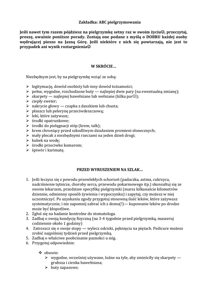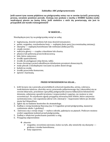 Zakładka: ABC pielgrzymowania Jeśli nawet tym razem pójdziesz na pielgrzymkę setny raz w swoim życiu☺ ☺, przeczytaj, proszę, uważnie poniższe porady. Zostają one podane z myślą o DOBRU każdej osoby wędrującej pieszo na Jasną Górę. Jeśli niektóre z nich się powtarzają, nie jest to przypadek ani wynik roztargnienia☺ ☺ W SKRÓCIE… Niezbędnym jest, by na pielgrzymkę wziąć ze sobą: legitymację, dowód osobisty lub inny dowód tożsamości; pełne, wygodne, rozchodzone buty — najlepiej dwie pary (na ewentualną zmianę); skarpety — najlepiej bawełniane lub wełniane (kilka par☺); ciepły sweter; nakrycie głowy — czapka z daszkiem lub chusta; płaszcz lub pelerynę przeciwdeszczową; leki, które zażywasz; środki opatrunkowe; środki do pielęgnacji stóp (krem, talk); krem chroniący przed szkodliwym działaniem promieni słonecznych; mały plecak z niezbędnymi rzeczami na jeden dzień drogi; kubek na wodę; środki przeciwko komarom; śpiwór i karimatę. PRZED WYRUSZENIEM NA SZLAK… 1. Jeśli leczysz się z powodu przewlekłych schorzeń (padaczka, astma, cukrzyca, nadciśnienie tętnicze, choroby serca, przewodu pokarmowego itp.) skonsultuj się ze swoim lekarzem, przedstaw specyfikę pielgrzymki (marsz kilkanaście kilometrów dziennie, odmienny sposób żywienia i wypoczynku) i zapytaj, czy możesz w niej uczestniczyć. Po uzyskaniu zgody przygotuj stosowną ilość leków, które zażywasz systematycznie, i nie zapomnij zabrać ich z domu(!)— kupowanie leków po drodze może być kłopotliwe. 2. Zgłoś się na badanie kontrolne do stomatologa. 3. Zadbaj o swoją kondycję fizyczną (na 3-4 tygodnie przed pielgrzymką, maszeruj codziennie około 1 godziny) 4. Zatroszcz się o swoje stopy — wylecz odciski, pęknięcia na piętach. Pedicure możesz zrobić najpóźniej tydzień przed pielgrzymką. 5. Zadbaj o właściwe poobcinanie paznokci u nóg. 6. Przygotuj odpowiednie: obuwie: wygodne, wcześniej używane, luźne na tyle, aby zmieściły się skarpety — grubsza i cienka bawełniana; buty zapasowe; ubranie: bielizna bawełniana, najlepiej bez ozdób — koronki, wstawki itp. powodują podczas marszu bolesne otarcia; bluzki luźne, przewiewne, zakrywające ramiona w celu uniknięcia oparzeń; spódnice lekkie, przewiewne, szerokie; spodnie luźne, najlepiej cienkie, długie jako ochrona przed tzw. „asfaltówką”; nakrycie głowy — czapka z daszkiem lub chustka (koniecznie!!!), które będą skutecznie chronić przed nadmiernym nasłonecznieniem, peleryna przeciwdeszczowa lub płaszcz (nie korzystamy z parasoli!!!) kurtka, polar, sweter; akcesoria: legitymacja, dowód osobisty lub inny dowód tożsamości; plecak mały na bagaż podręczny (torba na ramię jest niewygodna i powoduje nierównomierne obciążenie stawów); kubek na wodę; krem chroniący przed szkodliwym działaniem promieni słonecznych; środki do pielęgnacji stóp (krem, talk); dwa bandaże elastyczne 5 i 10 cm, wapno rozpuszczalne; okulary przeciwsłoneczne; środki przeciwko komarom; śpiwór i karimata. 7. Nie pakuj się w ostatnią noc przed pielgrzymką. Wypocznij, bo potem może być trudno o spokojny sen—niektórzy naprawdę głośno chrapią ☺ W DRODZE… 1. Na pierwszym postoju powiadom główną odpowiedzialną za służbę medyczną GRUPY o schorzeniach przewlekłych i stosowanych lekach. 2. Pamiętaj, że podręczny plecak nosisz cały dzień, więc nie przesadzaj z rzeczami, które mogą się przydać. Musisz w nim jednak mieć: o legitymację lub dowód osobisty na wypadek konieczności korzystania z konsultacji lub leczenia szpitalnego; o bandaż elastyczny; o leki na cały dzień (jeśli zażywasz je systematycznie); o ubranie na deszcz i upał. 3. Na postojach susz lub zmieniaj skarpety, by zmniejszyło się ryzyko otarć i odparzeń skóry. 4. Podczas odpoczynku pamiętaj, że ułożenie nóg w taki sposób, „by krew nie spływała do stóp”, zapobiega obrzękom. 5. Pij wodę butelkowaną, niegazowaną lub przegotowaną z pewnego źródła. 6. Nie jedz lodów, ciast, ogranicz spożycie owoców, a jeżeli już je zjadasz, to w żadnym wypadku nie popijaj wodą (u większości kończy się to biegunką). 7. W przypadku kontaktu z zaroślami, krzewami uważaj na węże, żmije oraz kleszcze, których unikniesz poprzez samokontrolę skóry.