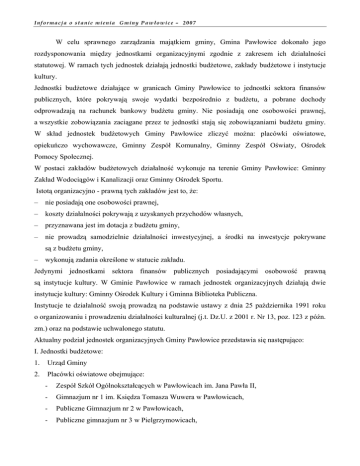 Informacja o stanie mienia Gminy Pawłowice – 2007 W celu sprawnego zarządzania majątkiem gminy, Gmina Pawłowice dokonało jego rozdysponowania między jednostkami organizacyjnymi zgodnie z zakresem ich działalności statutowej. W ramach tych jednostek działają jednostki budżetowe, zakłady budżetowe i instytucje kultury. Jednostki budżetowe działające w granicach Gminy Pawłowice to jednostki sektora finansów publicznych, które pokrywają swoje wydatki bezpośrednio z budżetu, a pobrane dochody odprowadzają na rachunek bankowy budżetu gminy. Nie posiadają one osobowości prawnej, a wszystkie zobowiązania zaciągane przez te jednostki stają się zobowiązaniami budżetu gminy. W skład jednostek budżetowych Gminy Pawłowice zliczyć można: placówki oświatowe, opiekuńczo wychowawcze, Gminny Zespół Komunalny, Gminny Zespół Oświaty, Ośrodek Pomocy Społecznej. W postaci zakładów budżetowych działalność wykonuje na terenie Gminy Pawłowice: Gminny Zakład Wodociągów i Kanalizacji oraz Gminny Ośrodek Sportu. Istotą organizacyjno - prawną tych zakładów jest to, że: – nie posiadają one osobowości prawnej, – koszty działalności pokrywają z uzyskanych przychodów własnych, – przyznawana jest im dotacja z budżetu gminy, – nie prowadzą samodzielnie działalności inwestycyjnej, a środki na inwestycje pokrywane są z budżetu gminy, – wykonują zadania określone w statucie zakładu. Jedynymi jednostkami sektora finansów publicznych posiadającymi osobowość prawną są instytucje kultury. W Gminie Pawłowice w ramach jednostek organizacyjnych działają dwie instytucje kultury: Gminny Ośrodek Kultury i Gminna Biblioteka Publiczna. Instytucje te działalność swoją prowadzą na podstawie ustawy z dnia 25 października 1991 roku o organizowaniu i prowadzeniu działalności kulturalnej (j.t. Dz.U. z 2001 r. Nr 13, poz. 123 z późn. zm.) oraz na podstawie uchwalonego statutu. Aktualny podział jednostek organizacyjnych Gminy Pawłowice przedstawia się następująco: I. Jednostki budżetowe: 1. Urząd Gminy 2. Placówki oświatowe obejmujące: - Zespół Szkół Ogólnokształcących w Pawłowicach im. Jana Pawła II, - Gimnazjum nr 1 im. Księdza Tomasza Wuwera w Pawłowicach, - Publiczne Gimnazjum nr 2 w Pawłowicach, - Publiczne gimnazjum nr 3 w Pielgrzymowicach, Informacja o stanie mienia Gminy Pawłowice – 2007 3. 4. - Szkoła podstawowa nr 1 im. Janusza Korczaka w Pawłowicach, - Szkoła podstawowa nr 2 im. Józefa Pukowca w Pawłowicach, - Zespół Szkolno – Przedszkolny w Golasowicach, - Zespół Szkolno – Przedszkolny w Krzyżowicach, - Szkoła podstawowa nr 1 im. Karola Miarki w Pielgrzymowicach, - Szkoła podstawowa im Józefa Piłsudskiego w Warszowicach. Placówki opiekuńczo-wychowawcze obejmujące: - Publiczne przedszkole nr 1 w Pawłowicach, - Publiczne przedszkole w Modrzewiowym Ogrodzie w Pawłowicach, - Publiczne przedszkole w Pielgrzymowicach, - Publiczne przedszkole w Warszowicach. Pozostałe jednostki budżetowe obejmujące: − Gminny Zespół Komunalny, − Ośrodek Pomocy Społecznej, − Gminny Zespół Oświaty. II. Zakłady budżetowe obejmujące: − Gminny Zakład Wodociągów i Kanalizacji, − Gminny Ośrodek Sportu. III. Instytucje kultury obejmujące: − Gminny Ośrodek Kultury, − Gminna Biblioteka Publiczna. W powyższych jednostkach organizacyjnych wartość mienia komunalnego Gminy Pawłowice na dzień 31 grudnia 2006 r. zamknęła się kwotą 162 381,52 tys. zł. Kwota ta stanowi sumę bilansową aktywów trwałych i aktywów obrotowych. Budynki będące własnością Gminy Pawłowice znajdują się w ewidencjach środków trwałych prowadzonych przez: Urząd Gminy Pawłowice, Gminny Zakład Wodociągów i Kanalizacji, placówki oświatowe w ramach Gminnego Zespół Oświaty, Gminny Ośrodek Sportu. Wartościowe ujęcie budynków znajdujących się w ewidencjach powyższych jednostek organizacyjnych wg stanu na 31.10.2007r. zestawiono w tabeli nr 1. Informacja o stanie mienia Gminy Pawłowice – 2007 Tabela nr 1. Wartościowe ujęcie budynków znajdujących się w ewidencjach środków trwałych poszczególnych jednostek organizacyjnych wg stanu na 31.10.2007r. w zł Lp. Wyszczególnienie wg spełniania głównej funkcji 1. 2 3 4 Budynki przemysłowe Budynki transportu i łączności Budynki handlowo – usługowe Zbiorniki, silosy i budynki magazynowe 0,00 0,00 0,00 33 277,00 230 464,57 350 587,57 0,00 789 558,24 0,00 0,00 0,00 0,00 0,00 0,00 0,00 0,00 5 6 Budynki biurowe Budynki zakładów opieki medycznej Budynki oświaty, nauki i kultury oraz budynki sportowe 3 247 786,85 6 075 298,66 0,00 0,00 0,00 0,00 0,00 0,00 5 256 745,55 0,00 32 275 410,64 17 138 932,18 7 8 Budynki produkcyjne, gospodarcze dla rolników 9 10 Inne budynki niemieszkalne Budynki mieszkalne Razem Urząd Gminy wartość brutto GZWiK wartość brutto GZO GOS wartość brutto wartość brutto 8 321,54 0,00 0,00 0,00 3 459 407,50 1 232 460,25 19 313 297,35 365 627,30 0,00 0,00 0,00 32 275 410,64 0,00 0,00 17 138 932,18 1 736 237,68 Źródło: Dane z jednostek organizacyjnych Gminy Pawłowice i Referatu Finansowego Urzędu Gminy. Zarządzanie budynkami Gminy Pawłowice odbywa się w sposób pośredni przez jednostki organizacyjne gminy na zasadzie przekazania w administrowanie bądź użyczenie. W najbliższym okresie czasu planowane jest rozpoczęcie procesu wprowadzenia trwałego zarządu jako podstawowej formy władania nieruchomościami przez jednostki organizacyjne nie posiadające osobowości prawnej. Wyszczególnienie budynków przekazanych w użyczenie do Gminnego Ośrodka Sportu w Pawłowicach Stan na dzień: 31.10.2007r. Lp. 1 2 3 4 5 Nazwa, położenie Budynek basenu D1, D2 Pawłowice, Szkolna 1B Budynek –łącznik A2 Pawłowice, Szkolna 1B Budynek hali C1,C2 Pawłowice, Szkolna 1B Budynek zaplecza sportowego Pawłowice, Świerczewskiego Budynek zaplecza sportowego Golasowice, Konopnickiej Razem Wartość