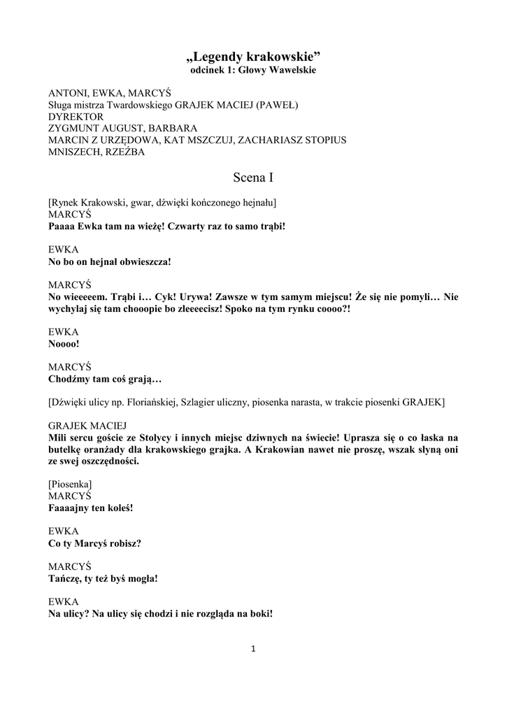 „Legendy krakowskie” odcinek 1: Głowy Wawelskie ANTONI, EWKA, MARCYŚ Sługa mistrza Twardowskiego GRAJEK MACIEJ (PAWEŁ) DYREKTOR ZYGMUNT AUGUST, BARBARA MARCIN Z URZĘDOWA, KAT MSZCZUJ, ZACHARIASZ STOPIUS MNISZECH, RZEŹBA Scena I [Rynek Krakowski, gwar, dźwięki kończonego hejnału] MARCYŚ Paaaa Ewka tam na wieżę! Czwarty raz to samo trąbi! EWKA No bo on hejnał obwieszcza! MARCYŚ No wieeeeem. Trąbi i… Cyk! Urywa! Zawsze w tym samym miejscu! Że się nie pomyli… Nie wychylaj się tam chooopie bo zleeeecisz! Spoko na tym rynku coooo?! EWKA Noooo! MARCYŚ Chodźmy tam coś grają… [Dźwięki ulicy np. Floriańskiej, Szlagier uliczny, piosenka narasta, w trakcie piosenki GRAJEK] GRAJEK MACIEJ Mili sercu goście ze Stolycy i innych miejsc dziwnych na świecie! Uprasza się o co łaska na butelkę oranżady dla krakowskiego grajka. A Krakowian nawet nie proszę, wszak słyną oni ze swej oszczędności. [Piosenka] MARCYŚ Faaaajny ten koleś! EWKA Co ty Marcyś robisz? MARCYŚ Tańczę, ty też byś mogła! EWKA Na ulicy? Na ulicy się chodzi i nie rozgląda na boki! 1 MARCYŚ A co ci szkodzi?! Spróbuj! [Piosenka] EWKA Dyrektor tu idzie! Przyłapie nas! MARCYŚ Nie wyplączemy się z tych wagarów! W bramę szybko! MARCYŚ Biegnie za nami! Szybciej! [Biegną, coraz bardziej sapią] EWKA Teraz przez podwórko! MARCYŚ I w drzwi! Żeby były otwarte, żeby były otwarte! EWKA Otwarte! MARCYŚ Ufff… Boczna uliczka. Tu nas już nie znajdzie… EWKA Marcyś! On tu biegnie dalej! MARCYŚ Szybciej Ewka tam do rogu! W tamte drzwi! I na podwórko! Tam na dół po schodkach, schowamy się. EWKA Ćśśśśśś… [Kroki] DYREKTOR zasmucony Znowu ten nicpoń Marcyś! Zakała szkoły. I jeszcze Ewkę w to wciąga. Takie porządne dziecko! MARCYŚ Szeptem. Chyba poszedł. EWKA Co to za miejsce? MARCYŚ Jest tabliczka. I kartka na drzwiach. „Anty-kwariat zamk-nięty na zawsze. Pro-szę nawet nie pukać. I tak nie otwo-rzę. Zos-taw-cie mnie w spokoju!” 2 EWKA Ojej. Jakiś biedny człowiek… MARCYŚ Antykwariat to był ten… No… EWKA Antykwariat od łacińskiego antiquarius to firma zajmująca się handlem przedmiotami mającymi wartość historyczną, estetyczną lub materialną. Sklep oferujący książki. MARCYŚ Nauczyłaś się słownika na pamięć czy co?! EWKA No tak... Żeby mieć celującą z polskiego uczę się ostatnio. Na razie umiem połowę wyrazów na „a”… A antykwariat jest na „a” więc wiem. MARCYŚ rozważa „Pro-szę nawet nie pukać. I tak nie otwo-rzę” (Marcyś puka i wchodzi do środka) *** Scena II [Przed antykwariatem, wejście od oficyny] ANTONI [kontrolujący się] Czego chcecie Ewka Aaa… ANTONI Komornik was nasłał szczeniaki?! Teraz szyby będziecie tłuc?! MARCYŚ Nieeee! Pppproszę pana, myśmy tu niechcący! EWKA Nie chcieliśmy! Przepraszamy! ANTONI [w depresji] Która godzina? MARCYŚ Ppppo pierwszej. Trzynastej znaczy się. ANTONI [w depresji] A jaki dziś dzień? 3 MARCYŚ Środa pppproszę pppana. ANTONI [w depresji] Kwiecień? MARCYŚ Marzec. Ppppierwszy dzień wiosny ppproszę pana. ANTONI [w depresji] Pierwszy dzień wiosny. 21 marca. Pamiętam. Słońceeee. Daaawno nie widziałem słońca… [kontrolujący się] Co tu robicie? Czemu nie w szkole? Twoja matka wie, że tu jesteś?! EWKA Proszę pana. Marcyś nie ma mamy. Bo on jest z domu dziecka. MARCYŚ Nieprawda!!! Mam mamę tylko choruje. Ale jak wyzdrowieje zabierze mnie do domu! ANTONI [kontrolujący się] A Twoi rodzice? Ty też z domu dziecka? MARCYŚ Ona ma rodziców, ale oni nie mają czasu dla niej! EWKA Kłamstwo! MARCYŚ Jak to kłamstwo? Cały czas się uczysz i uczysz. Myślisz że jak będziesz najlepsza to się Tobą zainteresują! Że sobie zasłużysz! EWKA Ty głupku! Po co ja się dałam namówić na te wagary! ANTONI [kontrolujący się] Rex Auguste, iudica iuste! Spokój mi tu! MARCYŚ Co ppan powiedział?! ANTONI [kontrolujący się] Królu Auguście, sądź sprawiedliwie! Tak mawiali Krakowianie kiedy musieli coś osądzić, a chcieli żeby to był wyrok sprawiedliwy. Wiecie jak trafić stąd do domu? MARCYŚ Ttttak. 4 EWKA To znaczy nie bardzo… ANTONI [w depresji] Echhhhhhhhhh… Chodźcie za mną. *** Scena III [Wnętrze antykwariatu] MARCYŚ szeptem Oooooo… Aaaale ciemno… EWKA Aaaale tu kurzu… Proszę pana! Tu jest chyba milion książek! ANTONI [kontrolujący się] Znacznie mniej! Co najwyżej czterdzieści tysięcy! EWKA To jest antykwariat! ANTONI [w depresji] To był antykwariat… Ale zamknęli. Za długi. Przyjechał nowy właściciel i powiedział, że tu urządzi dyskotekę, a mnie się wyrzuci. Podniósł czynsz i kazał płacić. I teraz czekam na komornika. MARCYŚ Na komornika? ANTONI [kontrolujący się] Przyjdą z policjantami i mnie stąd wyprowadzą. I książki. EWKA Ojej. No i co pan teraz zrobi? ANTONI [kontrolujący się] Co zrobię? Upatrzyłem już sobie miejsce pod jednym z mostów nad Wisłą. A potem mogiłkę na cmentarzu jak już zejdę z tego złego świata… Ale co mam zrobić z książkami?! EWKA Nic się nie da zrobić? ANTONI [kontrolujący się] Jakbym miał pieniądze na prawnika to bym go wynajął i może wszystko uratował. Tyle lat działał ten antykwariat! [w depresji:] Ale już nie walczę o nic. Chcę być sam! Niech mi wszyscy dadzą święty spokój! Ten nowy właściciel to zwykły oszust! Nikt go tu nigdy nie widział, pomachał jakimś świstkiem! I kazał się wynosić! Sąd kapturowy! MARCYŚ Kapturowy? 5 EWKA Co to znaczy sąd kapturowy? ANTONI [kontrolujący się] Nie wiecie? Hmmmm to ta sama historia co Rex… EWKA Auguste, iudica iuste! ANTONI [kontrolujący się] Ooo, jaka sprytna, już się nauczyłaś? MARCYŚ Bo Ewka proszę pana uczy się wszystkiego natychmiast! Ona zna słownik na pamięć! EWKA Tylko na „a”. A czemu tak się mówi o tym reksie Auguście i o tych kapturach? ANTONI [w manii] Królu Auguście. Oooo to stara historia. Częściowo prawdziwa jak to z legendam