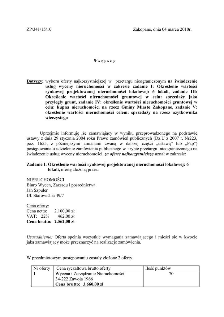 ZP/341/15/10 Zakopane, dnia 04 marca 2010r. Wszyscy Dotyczy: wyboru oferty najkorzystniejszej w przetargu nieograniczonym na świadczenie usług wyceny nieruchomości w zakresie zadanie I: Określenie wartości rynkowej projektowanej nieruchomości lokalowej: 6 lokali, zadanie III: Określenie wartości nieruchomości gruntowej w celu: sprzedaŜy jako przyległy grunt, zadanie IV: określenie wartości nieruchomości gruntowej w celu: kupna nieruchomości na rzecz Gminy Miasto Zakopane, zadanie V: określenie wartości nieruchomości celem: sprzedaŜy na rzecz uŜytkownika wieczystego Uprzejmie informuję ,Ŝe zamawiający w wyniku przeprowadzonego na podstawie ustawy z dnia 29 stycznia 2004 roku Prawo zamówień publicznych (Dz.U z 2007 r. Nr223, poz. 1655, z późniejszymi zmianami zwaną w dalszej części „ustawą” lub „Pzp”) postępowania o udzielenie zamówienia publicznego w trybie przetargu nieograniczonego na świadczenie usług wyceny nieruchomości, za ofertę najkorzystniejszą uznał w zakresie: Zadanie I: Określenie wartości rynkowej projektowanej nieruchomości lokalowej: 6 lokali, ofertę złoŜoną przez: NIERUCHOMOŚCI Biuro Wycen, Zarządu i pośrednictwa Jan Szpuler Ul. Starowiślna 49/7 Cena oferty: Cena netto: 2.100,00 zł VAT: 22% 462,00 zł Cena brutto: 2.562,00 zł Uzasadnienie: Oferta spełnia wszystkie wymagania zamawiającego i mieści się w kwocie jaką zamawiający moŜe przeznaczyć na realizacje zamówienia. W przedmiotowym postępowaniu zostały złoŜone 2 oferty. Nr oferty 1 Cena ryczałtowa brutto oferty Wycena i Zarządzanie Nieruchomości 34-222 Zawoja 1966 Cena brutto: 3.660,00 zł Ilość punktów 70 2 NIERUCHOMOŚCI Biuro Wycen, Zarządu i pośrednictwa Jan Szpuler Ul. Starowiślna 49/7 Cena brutto: 2.562,00 zł 100 Zadanie III: Określenie wartości nieruchomości gruntowej w celu: sprzedaŜy jako przyległy grunt, ofertę złoŜoną przez: NIERUCHOMOŚCI Biuro Wycen, Zarządu i pośrednictwa Jan Szpuler Ul. Starowiślna 49/7 Cena oferty: Cena netto: 4.800,00 zł VAT: 22% 1,056,00 zł Cena brutto: 5.856,00 zł Uzasadnienie: Oferta spełnia wszystkie wymagania zamawiającego i mieści się w kwocie jaką zamawiający moŜe przeznaczyć na realizacje zamówienia. W przedmiotowym postępowaniu została złoŜona 1 oferta. Zadanie IV: określenie wartości nieruchomości gruntowej w celu: kupna nieruchomości na rzecz Gminy Miasto Zakopane, ofertę złoŜoną przez: NIERUCHOMOŚCI Biuro Wycen, Zarządu i pośrednictwa Jan Szpuler Ul. Starowiślna 49/7 Cena oferty: Cena netto: VAT: 22% Cena brutto: 800,00 zł 176,00 zł 976,00 zł Uzasadnienie: Oferta spełnia wszystkie wymagania zamawiającego i mieści się w kwocie jaką zamawiający moŜe przeznaczyć na realizacje zamówienia. W przedmiotowym postępowaniu zostały złoŜone 3 oferty. Nr oferty 1 Cena ryczałtowa brutto oferty Wycena i Zarządzanie Nieruchomości 34-222 Zawoja 1966 Cena brutto: 3.660,00 zł Ilość punktów 26,67 2 3 BUDOSERWIS Z.U.H. Sp. z o.o. Ul. Kościuszki 31 41-500 Chorzów Cena brutto: 3.416,00 zł NIERUCHOMOŚCI Biuro Wycen, Zarządu i pośrednictwa Jan Szpuler Ul. Starowiślna 49/7 Cena brutto: 976,00 zł 28,57 100 Zadanie V: określenie wartości nieruchomości celem: sprzedaŜy na rzecz uŜytkownika wieczystego, ofertę złoŜoną przez: NIERUCHOMOŚCI Biuro Wycen, Zarządu i pośrednictwa Jan Szpuler Ul. Starowiślna 49/7 Cena oferty: Cena netto: VAT: 22% Cena brutto: 800,00 zł 176,00 zł 976,00 zł Uzasadnienie: Oferta spełnia wszystkie wymagania zamawiającego i mieści się w kwocie jaką zamawiający moŜe przeznaczyć na realizacje zamówienia. W przedmiotowym postępowaniu zostały złoŜone 2 oferty. Nr oferty 1 2 Cena ryczałtowa brutto oferty Ilość punktów Wycena i Zarządzanie Nieruchomości 80 34-222 Zawoja 1966 Cena brutto: 1.220,00 zł NIERUCHOMOŚCI 100 Biuro Wycen, Zarządu i pośrednictwa Jan Szpuler Ul. Starowiślna 49/7 Cena brutto: 976,00 zł Burmistrz Miasta Zakopane inŜ. Janusz Majcher Pouczenie Wykonawcom, a takŜe innym osobą jeŜeli ich interes prawny w uzyskaniu zamówienia doznał lub moŜe doznać uszczerbku w wyniku naruszenia przez zamawiającego przepisów ustawy Prawo zamówień publicznych , na podstawie art.180 ust.2 pkt 2-4 ustawy z dnia 29 stycznia 2004r. Prawo zamówień publicznych ( Dz.U. z 2007r. nr 223,poz.1655 z późn. zm – zwana dalej ustawą ) przysługuje prawo wniesienia odwołania zgodnie z przepisami działu VI ustawy.