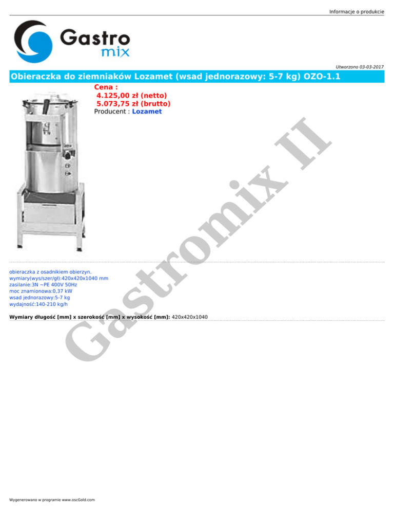 Informacje o produkcie Utworzono 03-03-2017 Obieraczka do ziemniaków Lozamet (wsad jednorazowy: 5-7 kg) OZO-1.1 Cena : 4.125,00 zł (netto) 5.073,75 zł (brutto) tr o m ix II Producent : Lozamet as obieraczka z osadnikiem obierzyn. wymiary(wys/szer/gł):420x420x1040 mm zasilanie:3N ~PE 400V 50Hz moc znamionowa:0,37 kW wsad jednorazowy:5-7 kg wydajność:140-210 kg/h G Wymiary długość [mm] x szerokość [mm] x wysokość [mm]: 420x420x1040 Wygenerowano w programie www.oscGold.com