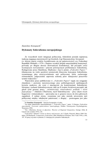 S.Konopacki, Dylematy federalizmu europejskiego Stanisław Konopacki * Dylematy federalizmu europejskiego Ze wszystkich teorii integracji politycznej, federalizm posiada najstarszą tradycję sięgającą starożytnych Lig Greckich, Ligi Hanzeatyckiej, Szwajcarii (w okresie pięciu wieków kształtowania się jej państwowości) czy Federalnej Republiki Holandii z 1579 r. Dopiero wszakże projekt amerykańskiej konstytucji, powstały po długim okresie doświadczeń konfederacji, dał początek coraz liczniejszym rozważaniom i pracom poświęconym problematyce federalizmu. Redagowane przez Hamiltona, Madisona i Jaye’a pismo „Federalist Papers” 1 (tłumaczone na wiele języków) promowało klasyczne koncepcje federalizmu, rozumianego jako urzeczywistnienie unii politycznej, która zachowując różnorodność, jednocześnie zapewnia ochronę praw mniejszości przeciwko tyranii większości. 2 Wprawdzie prace publikowane w „Federalist Papers” nigdy nie osiągnęły charakteru i poziomu merytorycznego prac politologicznych spełniających kryteria naukowe, ale wraz z mnożącymi się konstytucjami federalnymi, literaturą i ruchami federalistycznymi, dały po II wojnie światowej początek, jak głosił tytuł pewnej pracy, „nieskończonej różnorodności praktyki i teorii federalizmu”. 3 Zdaniem J.Harrisona, myśl federalistyczna – przy całym swym bogactwie i różnorodności – sprowadza się w gruncie rzeczy do dwu głównych zagadnień. Z jednej strony, rozumiana jest jako metoda utworzenia unii politycznej między odrębnymi państwami; z drugiej – postrzegana jest jako * Dr Stanisław Konopacki – Instytut Europejski w Łodzi. Na temat federalizmu amerykańskiego i „Federalist Papers” patrz: V.Ostrom, Federalizm amerykański, Tworzenie społeczeństwa samorządnego, Polskie Towarzystwo Psychologiczne, Warszawa 1994. 2 Por. J.Harrison, Europe in Question. Theories of Regional Integration, George Allen & Unwin Ltd, London 1974, s.42. 3 Federalism: Infinitive variety in theory and practice, ed. V.Earle, Peacock, Ithaca 1968. Por. także J.D.Duchacek, Comparative Federalism, Holt, Rinehart & Winston, New York 1970, s.196, 197. W pracy tej autor wymienia 21 istniejących systemów federalnych. 1 77 Studia Europejskie, 4/1998 swoista struktura polityczna (rząd, władza), posiadająca określone zalety i wady w stosunku do jednolitego systemu państw narodowych. 4 1. Przesłanki federalizmu Zanim przejdziemy do prezentacji różnych stanowisk i poglądów na temat metody tworzenia unii politycznej oraz typu (rodzaju) jej struktury, skoncentrujmy się na podstawowych przesłankach leżących u podstaw myślenia federalistycznego. Tak oto podstawowym założeniem, stanowiącym zarazem raison d’˜tre różnych odmian federalizmu, jest przeświadczenie o istnieniu 5 nieuchronnego konfliktu w społeczeństwie. Heterogeniczność społeczeństwa złożonego z różnych grup etnicznych, językowych, gospodarczych, religijnych itd., może być tylko w pełni przezwyciężona za cenę ograniczenia wolności i praw obywatelskich. Z kolei niepohamowany rozwój tej „heterogeniczności” może być dla całości społeczeństwa równie szkodliwy. Guy Heraud porządkuje założenia dotyczące społeczeństwa w szereg hipotez: • Konflikt interesów w społeczeństwie jest rzeczywisty i złożony; nie można zatem zredukować go do jakiegoś jednego, bardziej ogólnego problemu na drodze redukcji filozoficznej (np. materializm dialektyczny). • Nie ma żadnych racji i podstaw, aby przedkładać jeden interes nad inny – wszystkie w całości bowiem posiadają do spełnienia jakąś rolę w historii. Jedynym uzasadnionym celem i zadaniem jest zatem harmonijne godzenie interesów. • Interesy, które nie są do pogodzenia na jednym poziomie porządku społecznego, dadzą się być może pogodzić na poziomie wyższym (np. ponadnarodowym). • Zgodnie ze świadectwem historii i doświadczeniami stosunków międzynarodowych, nie istnieje żadna naturalna harmonia godząca różne interesy. Proces ich zharmonizowania zależy całkowicie od istnienia 6 instytucji wyposażonych w odpowiednią władzę. Podobną myśl wyznaje Henri Brugmans, dla którego istnienie władzy jako fundamentu porządku społecznego jest podstawowym założeniem federalizmu. 7. Kierunek ten, w swych różnych odmianach, wyrastał z jednej strony z postawy maksymalnego sceptycyzmu wobec natury ludzkiej, z drugiej natomiast – z poczucia konieczności znalezienia właściwej formy struktury politycznej, która 4 J.Harrison, op.cit., s.43. Tamże, s.43. 6 G.Heraud, Les principes du fédéralisme et la fédération européenne, Presses d’Europe, Paris 1968, s.20-24. 7 H.Brugmans, La pensée politique du fédéralisme, A.W.Sijthoff, Leyde 1969, s.31-41. 5 78 S.Konopacki, Dylematy federalizmu europejskiego byłaby w stanie zaradzić niedoskonałościom kondycji ludzkiej. Remedium na tak czy inaczej ścierające się interesy i konflikty społeczne upatrywano w odpowiedniej formie „władzy”. Podkreślić wszak należy, iż pojęciom ściśle związanym z problematyką federalizmu, tj. władzy i suwerenności, nadawano różnorodne, niekiedy sprzeczne ze sobą znaczenia. Podobna sytuacja wiąże się z samym terminem „federalizm”, dla którego nie sposób podać jednej, zadowalającej definicji. Jak zauważa Th.Fleming: „może być tyle odmian federalizmów, co jest politologów i tyle odmian ich klasyfikacji, co ideologii. Jednak wśród różnych odmian tego terminu można wyróżnić dwie tradycje, dominujące kierunki. Chodzi tutaj o federalizm zorganizowany ‘z góry’ (top down) i federalizm realizowany ‘oddolnie’ (bottom-up)”. 8. Główną chorobą, na którą federalizm miał stanowić remedium, była tendencja do koncentrowania się władzy w rękach tych, którzy dzięki niej najwięcej zyskiwali. W tym rozumieniu federalizm postrzegany był jako narzędzie mogące przezwycię