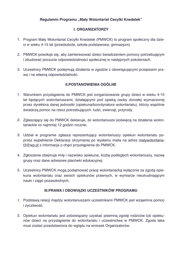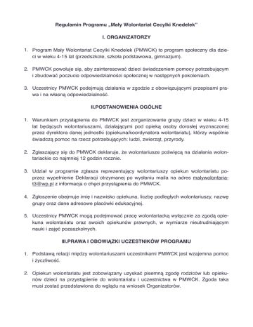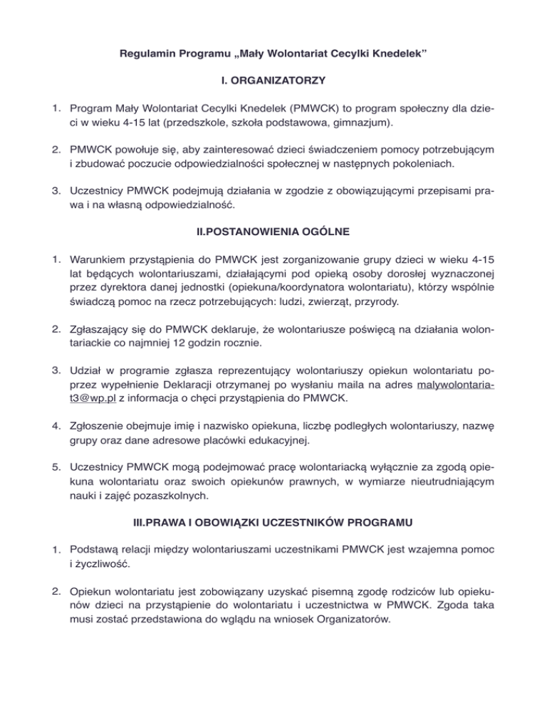 Regulamin Programu „Mały Wolontariat Cecylki Knedelek” I. ORGANIZATORZY 1. Program Mały Wolontariat Cecylki Knedelek (PMWCK) to program społeczny dla dzieci w wieku 4-15 lat (przedszkole, szkoła podstawowa, gimnazjum). 2. PMWCK powołuje się, aby zainteresować dzieci świadczeniem pomocy potrzebującym i zbudować poczucie odpowiedzialności społecznej w następnych pokoleniach. 3. Uczestnicy PMWCK podejmują działania w zgodzie z obowiązującymi przepisami prawa i na własną odpowiedzialność. II.POSTANOWIENIA OGÓLNE 1. Warunkiem przystąpienia do PMWCK jest zorganizowanie grupy dzieci w wieku 4-15 lat będących wolontariuszami, działającymi pod opieką osoby dorosłej wyznaczonej przez dyrektora danej jednostki (opiekuna/koordynatora wolontariatu), którzy wspólnie świadczą pomoc na rzecz potrzebujących: ludzi, zwierząt, przyrody. 2. Zgłaszający się do PMWCK deklaruje, że wolontariusze poświęcą na działania wolontariackie co najmniej 12 godzin rocznie. 3. Udział w programie zgłasza reprezentujący wolontariuszy opiekun wolontariatu poprzez wypełnienie Deklaracji otrzymanej po wysłaniu maila na adres [email protected] z informacja o chęci przystąpienia do PMWCK. 4. Zgłoszenie obejmuje imię i nazwisko opiekuna, liczbę podległych wolontariuszy, nazwę grupy oraz dane adresowe placówki edukacyjnej. 5. Uczestnicy PMWCK mogą podejmować pracę wolontariacką wyłącznie za zgodą opiekuna wolontariatu oraz swoich opiekunów prawnych, w wymiarze nieutrudniającym nauki i zajęć pozaszkolnych. III.PRAWA I OBOWIĄZKI UCZESTNIKÓW PROGRAMU 1. Podstawą relacji między wolontariuszami uczestnikami PMWCK jest wzajemna pomoc i życzliwość. 2. Opiekun wolontariatu jest zobowiązany uzyskać pisemną zgodę rodziców lub opiekunów dzieci na przystąpienie do wolontariatu i uczestnictwa w PMWCK. Zgoda taka musi zostać przedstawiona do wglądu na wniosek Organizatorów. 3. Opiekun wolontariatu zobowiązuje się do dokumentowania wraz z wolontariuszami działań wolontariackich, zgodnie z pkt. II. 2. 4. i przekazywania tejże dokumentacji do wglądu na wniosek Organizatorów. Dokumentacji działań mogą również dokonywać wolontariusze, zgodnie ze wskazówkami opiekuna wolontariatu. 4. Wolontariusze wraz z opiekunem wolontariatu są zobowiązani do systematycznego dokumentowania swoich działań, w szczególności: datowania, poświadczania świadczenia pomocy od beneficjenta (osoby lub instytucji), opisywania działań, fotografowania, opcjonalnie wideozapisu. 5. Pierwszym miejscem, w którym działają wolontariusze jest szkoła i społeczność lokalna: osiedle, ulica, wieś. Tutaj wolontariusze szukają potrzebujących i realizują swoje działania. 6. Przykłady działań na terenie placówki oświatowej: - koleżeńska pomoc w lekcjach, - ochrona przyrody i ekologia, np. dokarmianie zwierząt, oszczędzanie energii, - segregacja odpadów, prace porządkowe i ogrodnicze wokół szkoły, przedszkola, - zbiorki rzeczowe, - kiermasze ręcznie wykonywanych ozdób, z których dochód przeznaczany jest na pracę z chorymi i niepełnosprawnymi, - odwiedzanie i pomoc niepełnosprawnym rówieśnikom, - akcje informacyjne i edukacyjne, uwrażliwiające kolegów na problemy społeczne, środowiskowe, pogadanki na temat wolontariatu, - udział w akcjach organizowanych przez inne instytucje. 7. Opiekun wolontariatu ma prawo do decydowania o składzie podległej mu grupy wolontariuszy, np. może czasowo zawiesić działalność wolontariusza, jeśli ma on poważne kłopoty w nauce lub sam wyraża takie życzenie. 8. Opiekun wolontariatu zobowiązany jest do przesyłania Organizatorom corocznego sprawozdania z działalności w PMW na wskazany adres pocztowy, mailowy lub poprzez specjalny formularz internetowy. IV.STRUKTURA PROGRAMU 1. Mały Wolontariat może być powołany w szkole, przedszkolu lub innej placówce oświatowej. 2. Warunkiem powołania Małego Wolontariatu jest zgoda dyrekcji ww. placówki oraz pisemne określenie zasad działania wolontariatu w danej placówce. 3. Opiekunem wolontariatu zostaje osoba dorosła, wyznaczona przez dyrektora danej jednostki, która wyrazi chęć organizowania i monitorowania pracy wolontariuszy. 4. Opiekun wolontariatu w placówce edukacyjnej jest odpowiedzialny za działania i bezpieczeństwo wolontariuszy. 5. W PMWCK z danej placówki oświatowej może uczestniczyć więcej niż jedna grupa wolontariuszy z opiekunem wolontariatu. 6. Organizator udziela wsparcia merytorycznego w organizacji wolontariatu w placówce oświatowej poprzez: przekazanie materiałów edukacyjnych oraz, w miarę możliwości, bezpośredni kontakt z doświadczonymi wolontariuszami. 7. Organizator może zapraszać wolontariuszy uczestniczących w PMWCK do wspólnych akcji wolontariackich. 8. Uczestnicy PMWCK mogą organizować wspólne akcje wolontariackie z innymi uczestnikami PMWCK lub niezależnymi wolontariuszami czy organizacjami. V.POSTANOWIENIA KOŃCOWE 1. Organizator za pośrednictwem poczty elektronicznej oraz Strony na Facebooku na bieżąco przekazuje uczestnikom PMWCK informacje o programie.