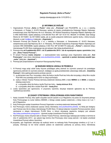 Regulamin Promocji „Nerka w Plushu” (wersja obowiązująca od dn. 9.10.2015 r.) §1 INFORMACJE OGÓLNE 1. Organizatorem Promocji „Nerka w Plushu” (dalej jako: „Promocja”) jest POLKOMTEL sp. z o.o. z siedzibą w Warszawie, ul. Postępu 3, 02-676 Warszawa, wpisana do rejestru przedsiębiorców Krajowego Rejestru Sądowego prowadzonego przez Sąd Rejonowy dla m.st. Warszawy, XIII Wydział Gospodarczy Krajowego Rejestru Sądowego pod nr KRS 0000419430, kapitał zakładowy 3.510.300.000 PLN, NIP: 527-10-37-727, REGON: 011307968, Dział Obsługi Klienta tel. 601102601, fax 601102602 (opłaty, jak za zwykłe połączenie telefoniczne zgodnie taryfą, z której korzysta Abonent), e-mail: [email protected] (dalej jako: „Organizator”). 2. Partnerem Promocji jest Pluszak Sp. z o.o. z siedzibą w Warszawie, ul. Domaniewska 47, 02-672 Warszawa, zarejestrowana przez Sąd Rejonowy dla m. st. Warszawy, XIII Wydział Gospodarczy Krajowego Rejestru Sądowego pod numerem KRS 0000548698, kapitał zakładowy 5 500 PLN, NIP 5213691775 (dalej jako: „Partner”), właściciel sklepu internetowego PLUSH Store znajdującego się pod adresem http://sklep.plushbezlimitu.pl/. 3. Promocja trwa od 9 października 2015 r. do 23 października 2015 r. lub do wyczerpania zapasu upominków (dalej jako: „Okres Trwania Promocji”). 4. W ramach Promocji można otrzymać – z wykorzystaniem kodu wydanego przez Organizatora (dalej jako: „Kod Promocyjny”) oraz strony internetowej www.plushbezlimitu.pl/strefa – upominek w postaci darmowej saszetki typu „nerka” (dalej jako: „Upominek”). 5. Promocja jest przeprowadzana na terytorium Rzeczypospolitej Polskiej. §2 WARUNKI WZIĘCIA UDZIAŁU W PROMOCJI 1. W Promocji mogą wziąć udział osoby fizyczne posiadające pełną zdolność do czynności prawnych lub posiadające ograniczoną zdolność do czynności prawnych, działające za zgodą przedstawiciela ustawowego (dalej jako: „Uczestnicy Promocji”), które spełnią jednocześnie poniższe warunki: 1) są abonentami sieci Plus i korzystają z oferty Na Kartę w taryfie Plush bez limitu albo korzystają z oferty Mix w taryfie Plush MIX oraz posiadają ważne konto na usługi wychodzące, 2) wyślą w Okresie Trwania Promocji darmową wiadomość tekstową SMS o treści NERKA na nr 80444, a następnie doładują swoje konto: a) w przypadku oferty Na Kartę w taryfie Plush bez limitu – kwotą minimum 30 zł, b) w przypadku oferty Mix w taryfie Plush MIX – kwotą 20 zł. 2. Liczba Upominków jest ograniczona. O przyznaniu Upominku decyduje kolejność zgłoszenia się do Promocji, i spełnienia jej warunków. §3 ZASADY OTRZYMANIA I ZREALIZOWANIA KODU RABATOWEGO 1. Każdy Uczestnik Promocji, który spełni wszystkie warunki opisane w § 2 Regulaminu ma prawo do otrzymania jednego Kodu Promocyjnego na numer telefonu MSISDN, z którego została wysłana wiadomość, o której mowa w § 2 ust. 1 pkt 2) Regulaminu. 2. Kody Promocyjne wydaje Uczestnikom Promocji Organizator w zwrotnej wiadomości tekstowej SMS. 3. Kod Promocyjny można zrealizować poprzez stronę internetową www.plushbezlimitu.pl/strefa, na której jest dostępny opis Promocji oraz link do sklepu internetowego PLUSH Store. W dalszej kolejności Uczestnik Promocji powinien złożyć zamówienie w sklepie internetowym PLUSH Store, w którym obowiązuje regulaminu dostępny pod adresem http://sklep.plushbezlimitu.pl/regulamin/. Upominki wydaje Uczestnikom Promocji Partner. 4. Kod Promocyjny można otrzymać tylko w Okresie Trwania Promocji, natomiast jego realizacja jest możliwa w terminie do dnia 31 października 2015 r. (po upływie tego terminu Kod Promocyjny straci swoją ważność i nie będzie umożliwiał Uczestnikowi Promocji odbioru Upominku). W przypadku, gdy Organizator zdecyduje się wydłużyć termin na realizację Kodu Promocyjnego określony w § 3 ust. 4 powyżej, informacja na ten temat zostanie podana do wiadomości publicznej za pomocą strony internetowej www.plushbezlimitu.pl/strefa oraz przekazana Uczestnikom Promocji za pomocą wiadomości tekstowej SMS.7. Uczestnik Promocji nie ma możliwości wymiany Kodu Promocyjnego na ekwiwalent pieniężny. § 4 REKLAMACJE 1. W przypadku braku otrzymania lub wydania przez Organizatora wadliwego Kodu Promocyjnego pomimo spełnienia warunków Promocji opisanych w § 2 Regulaminu, Uczestnikowi Promocji przysługuje prawo do złożenia w tym zakresie reklamacji do Organizatora. Reklamacja powinna zawierać: imię i nazwisko osoby wnoszącej reklamację, adres korespondencyjny, numer Kodu Promocyjnego lub numer telefonu MSISDN, z którego została wysłana wiadomość, o której mowa w § 2 ust. 1 pkt 2) Regulaminu, powód reklamacji z określeniem żądania reklamacyjnego, a także informację, że dotyczy Promocji „Nerka w Plushu”. Reklamacja powinna zostać złożona na adres pocztowy: POLKOMTEL sp. z o. o. z siedzibą w Warszawie, ul. Postępu 3, 02-676 Warszawa lub drogą elektroniczną na adres: [email protected], nie później niż w terminie 14 (czternastu) dni roboczych od zakończenia Promocji. W opisanej powyżej sytuacji Organizator zapewni Uczestnikowi Promocji możliwość późniejszego zrealizowania Kodu Promocyjnego niezależnie od terminu wskazanego w § 3 ust. 4 Regulaminu. 2. W przypadku braku możliwości zrealizowania Kodu Promocyjnego na stronie sklepu internetowego PLUSH Store http://sklep.plushbezlimitu.pl lub w przypadku wystąpienia wad Upominku, każdemu Uczestnikowi Promocji przysługuje prawo do złożenia w tym zakresie reklamacji do Partnera. Reklamacja powinna zawierać: imię i nazwisko osoby wnoszącej reklamację, adres korespondencyjny, numer Kodu Promocyjnego lub numer telefonu MSISDN, z którego została wysłana wiadomość, o której mowa w § 2 ust. 1 pkt 2) Regulaminu, powód reklamacji z określeniem żądania reklamacyjnego, a także informację, że dotyczy Promocji „Nerka w Plushu”. Reklamacja powinna zostać zło